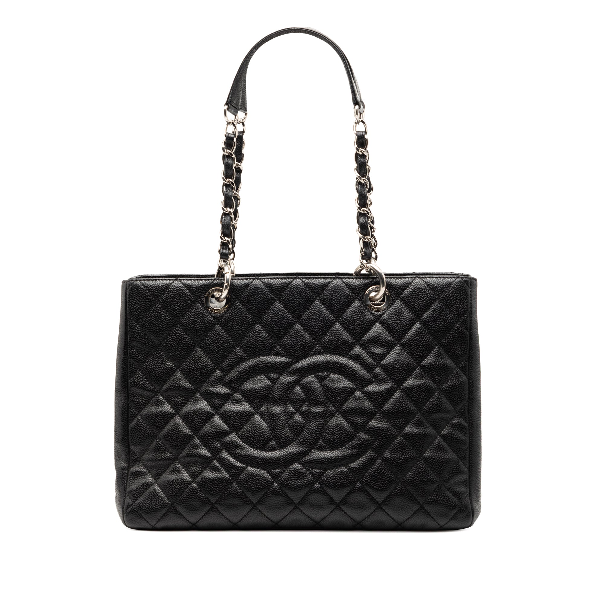 The Grand Shopping Tote features a quilted Caviar leather body, leather woven chain shoulder straps, an open top, an interior zip compartment, an exterior back slip pocket, and interior zip and slip pockets. Retail Price: 3890.00