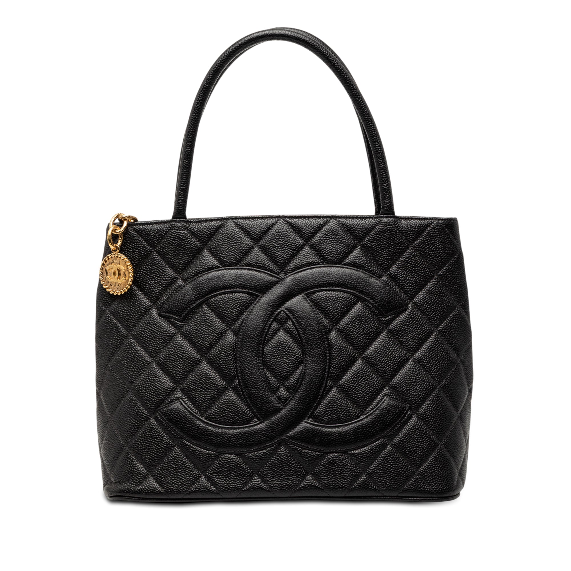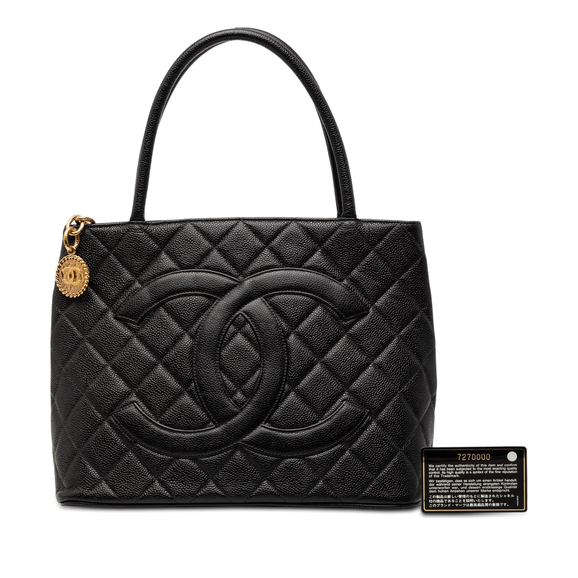The Medallion tote bag features a quilted caviar leather body, rolled leather handles, a top zip closure, an exterior back slip pocket, and interior zip and slip pockets. Inclusion: authenticity card. Retail Price: 2513.00