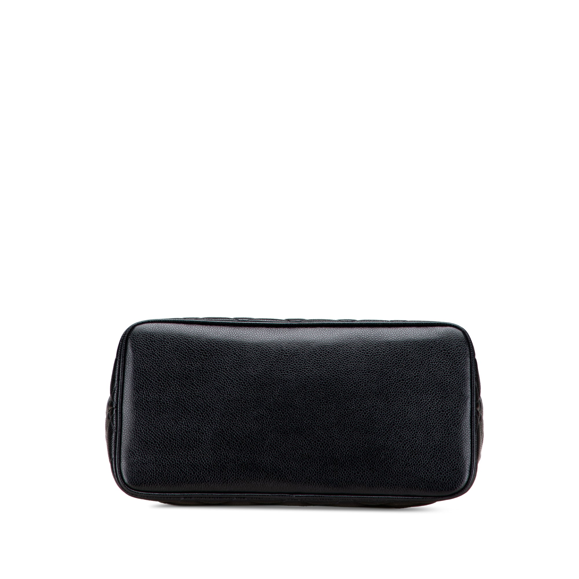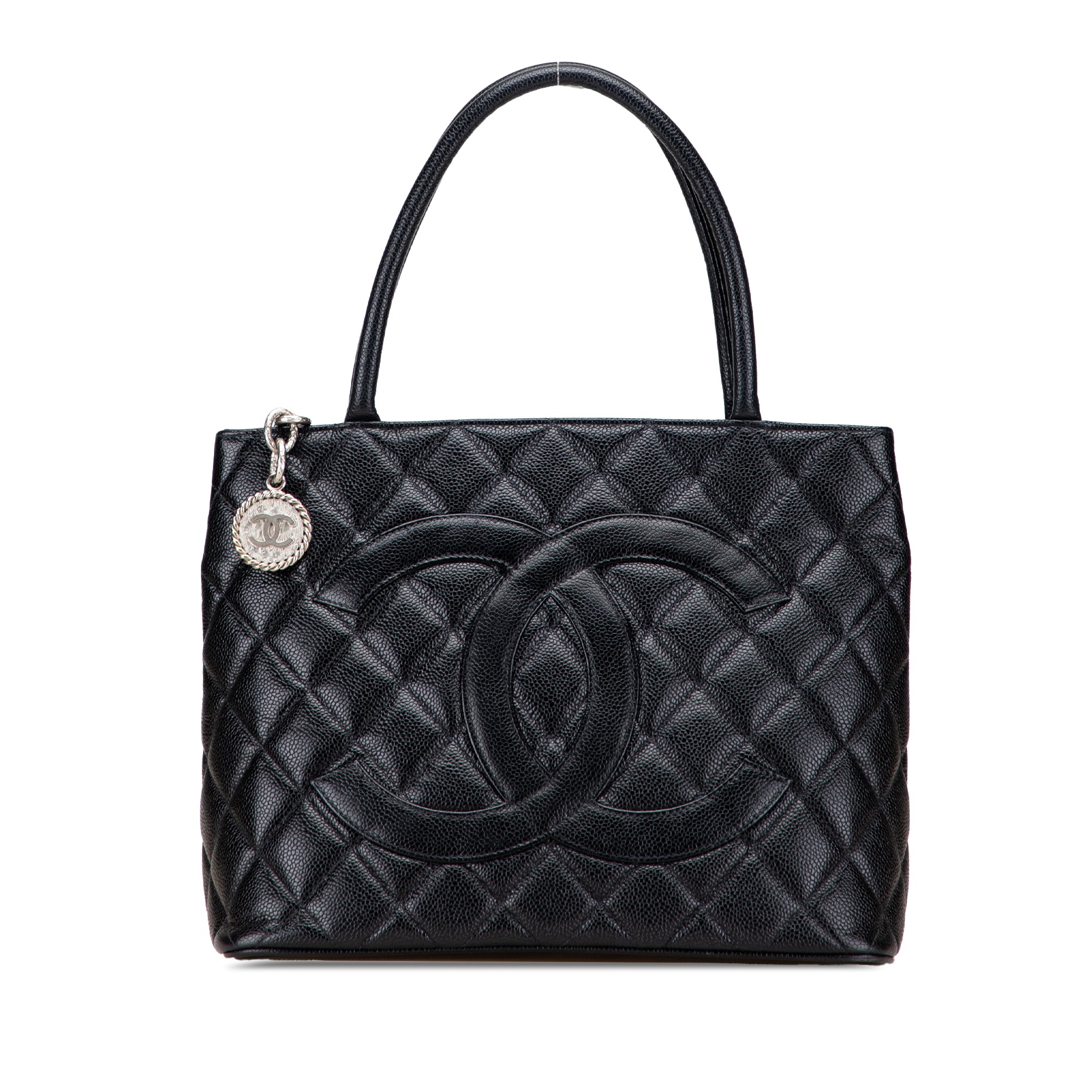 The Medallion tote bag features a quilted caviar leather body, rolled leather handles, a top zip closure, an exterior back slip pocket, and interior zip and slip pockets. Retail Price: 2513.00