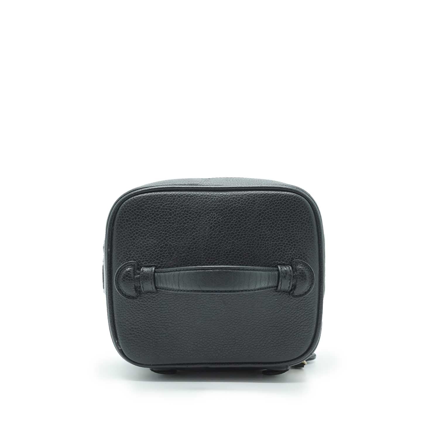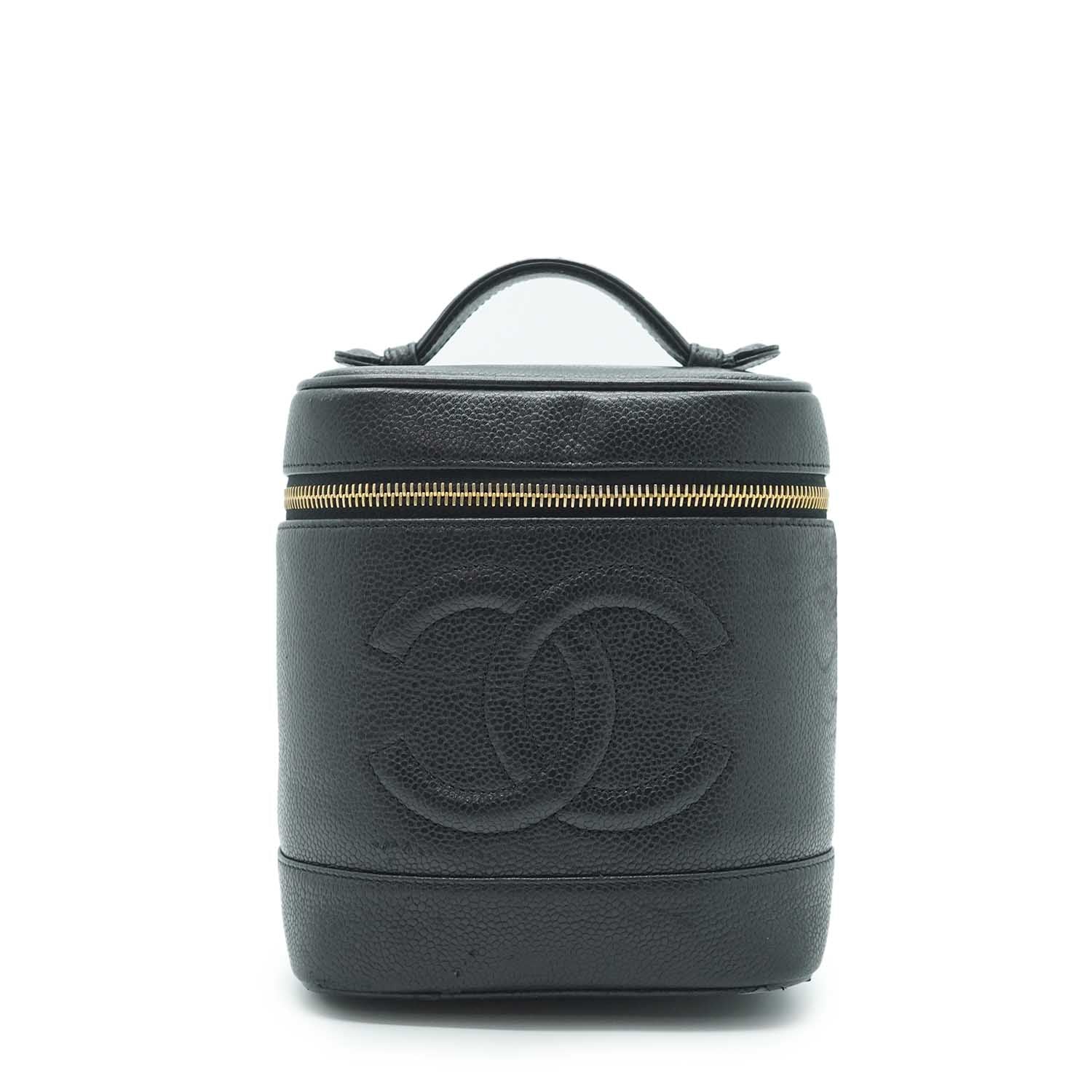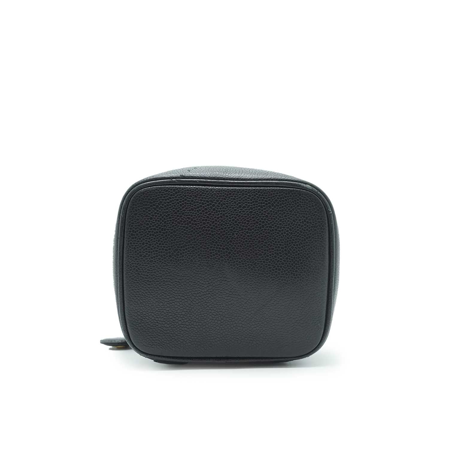 Caviar Skin Vanity Bag Black LeatherDepth: 13cmHeight: 17.5cmWidth: 15cmHand Drop: 3.5cmOutside Rank: BInside Rank: BStain: Small glitters on the insideDiscoloration: Some hardware tarnishScratch: Some scratches near the CC logo and on the inside, corner rubPeeling: Minor leather cracking on the top handleWorn: In generalOdor: Slight storage odorInclude: Authenticity cardComments: The logo stamp is slightly fading (making it difficult to read), the serial code is fadedSerial code: 4204695SKU: 7030175