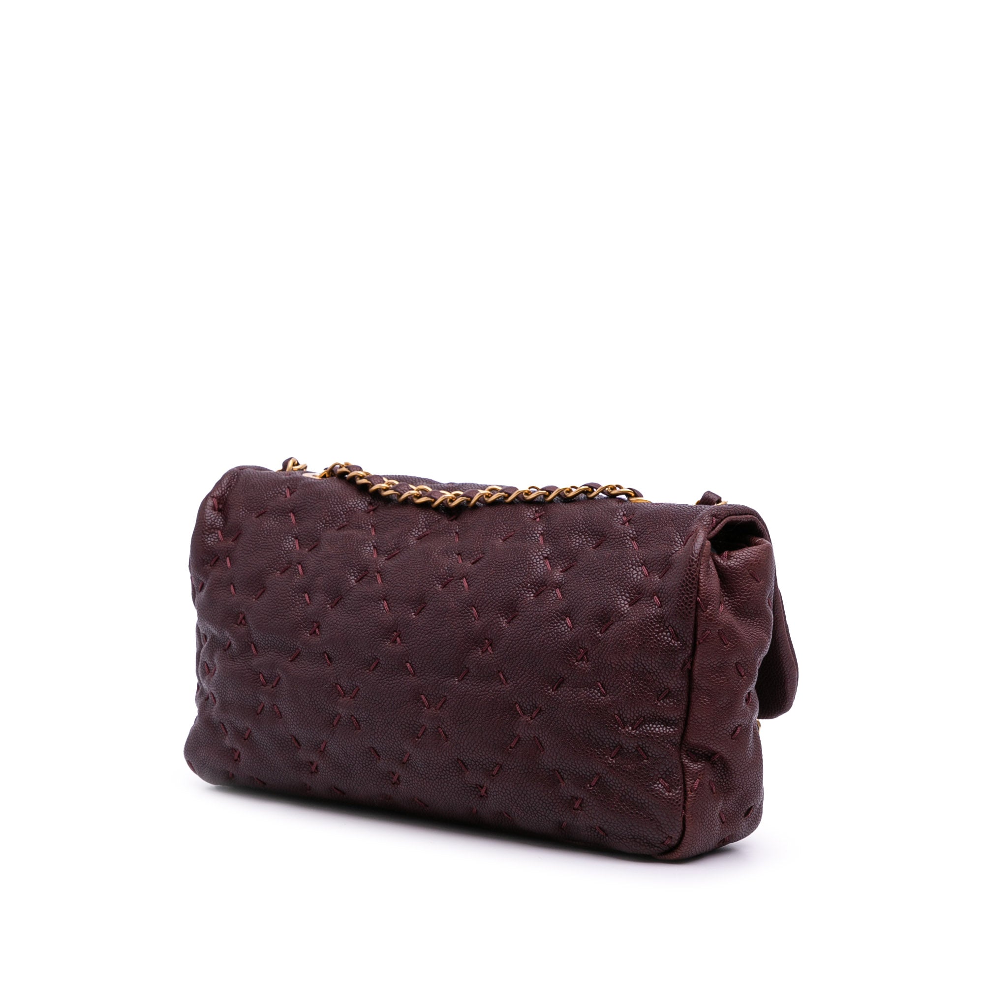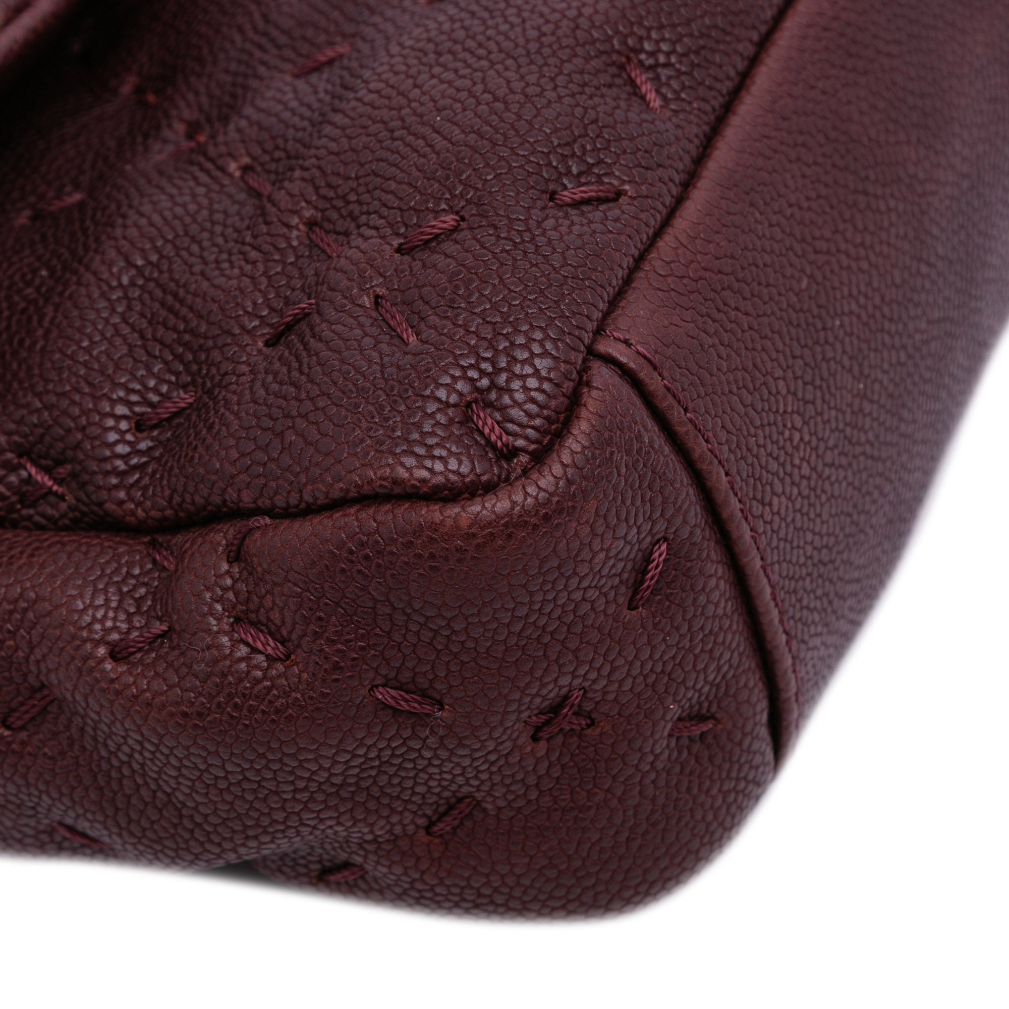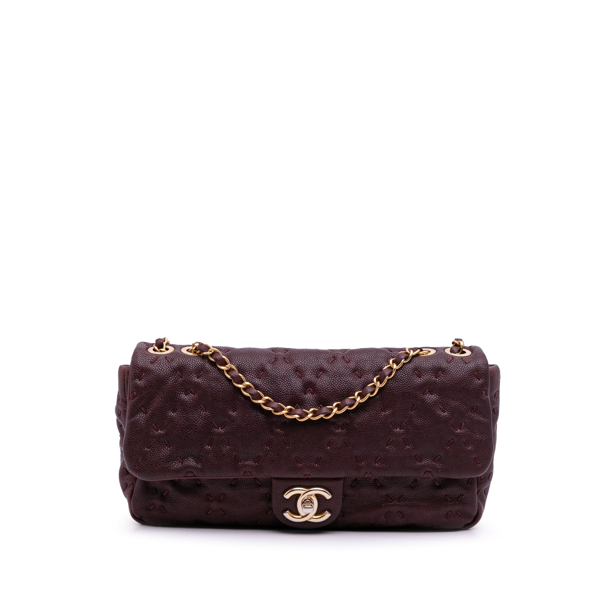 This shoulder bag features a quilted caviar leather body, leather woven chain strap, a front flap with twist lock closure, and an interior zip pocket. Retail Price: 2800.00