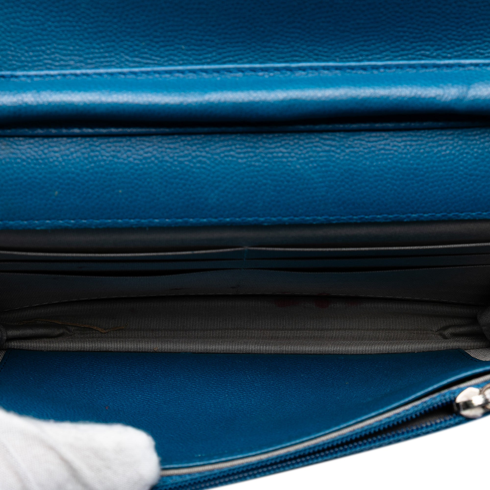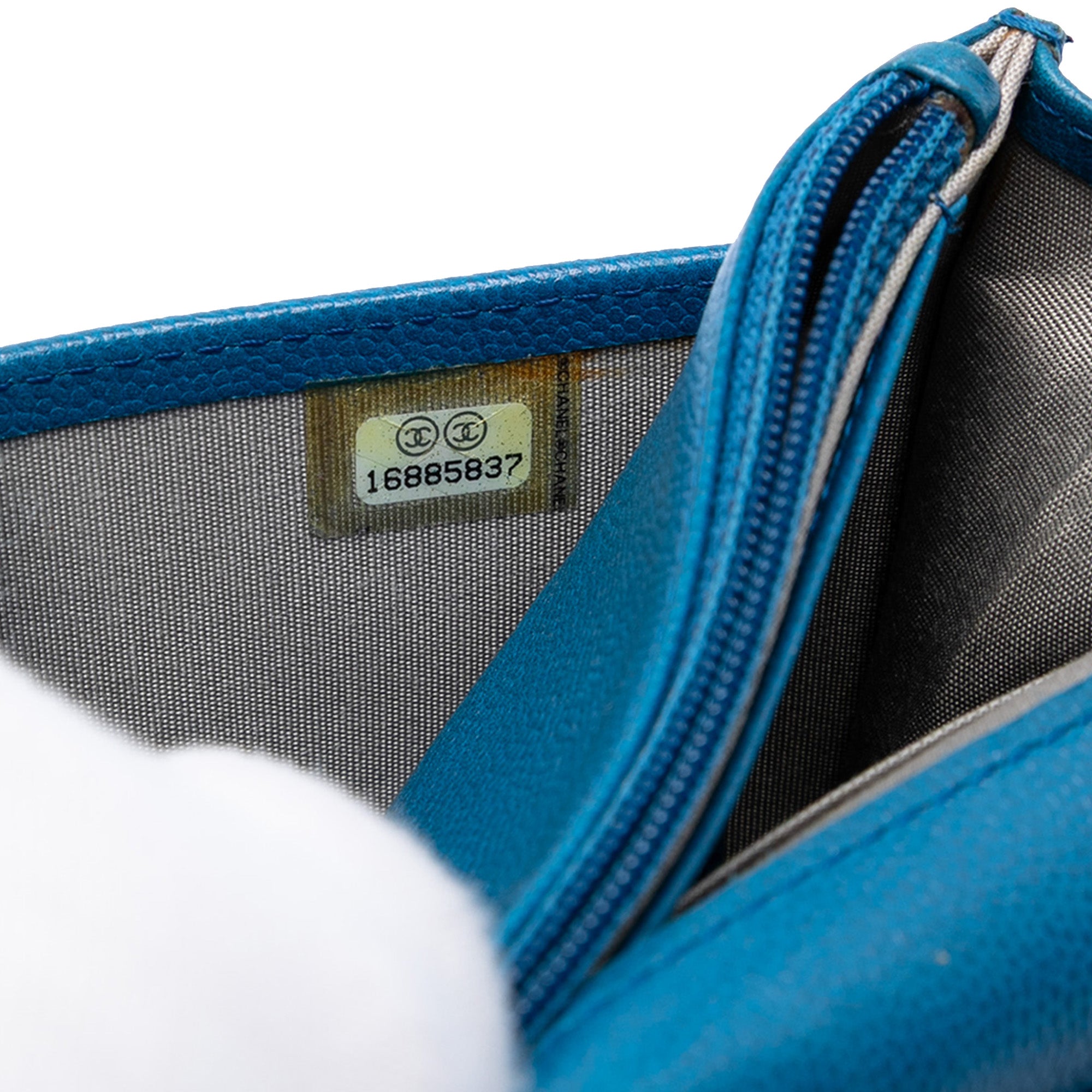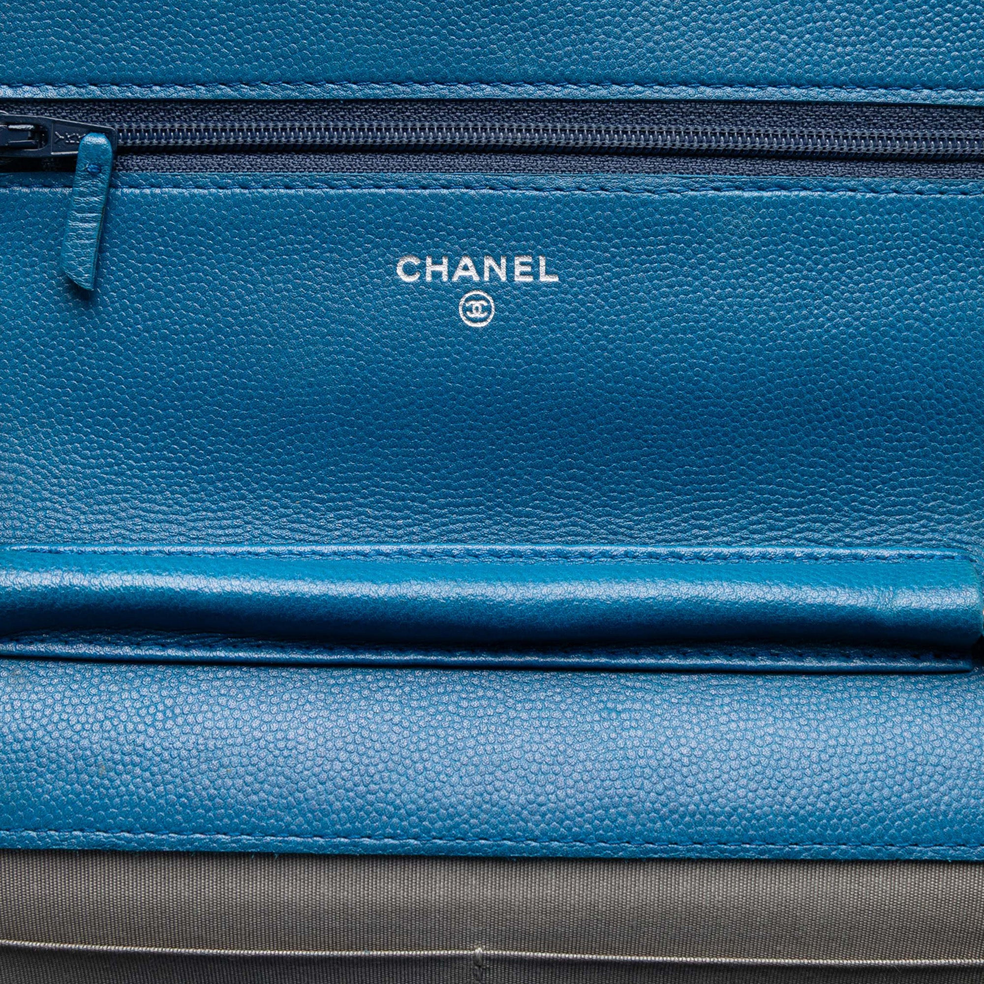 This wallet on chain features a caviar leather body, a leather woven chain link strap, a front flap with magnetic snap closure, and interior zip and slip pockets. Retail Price: 2500.00