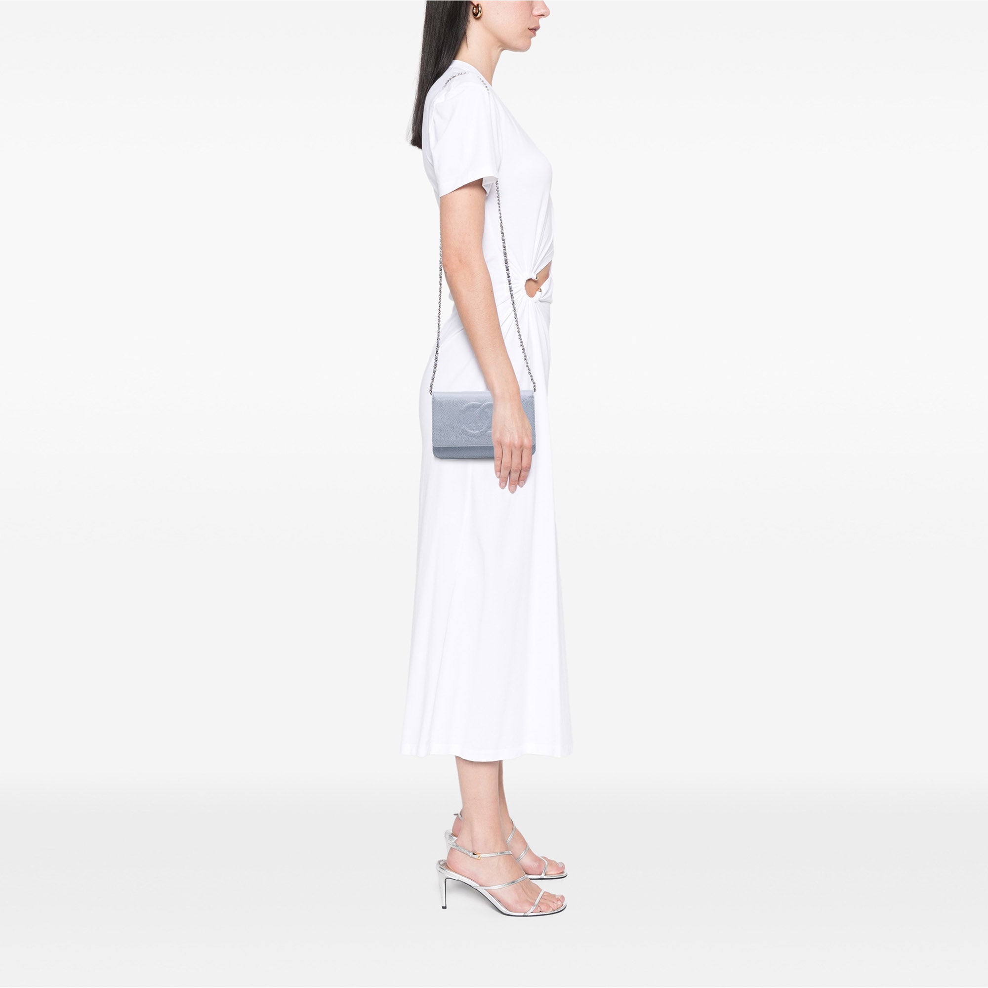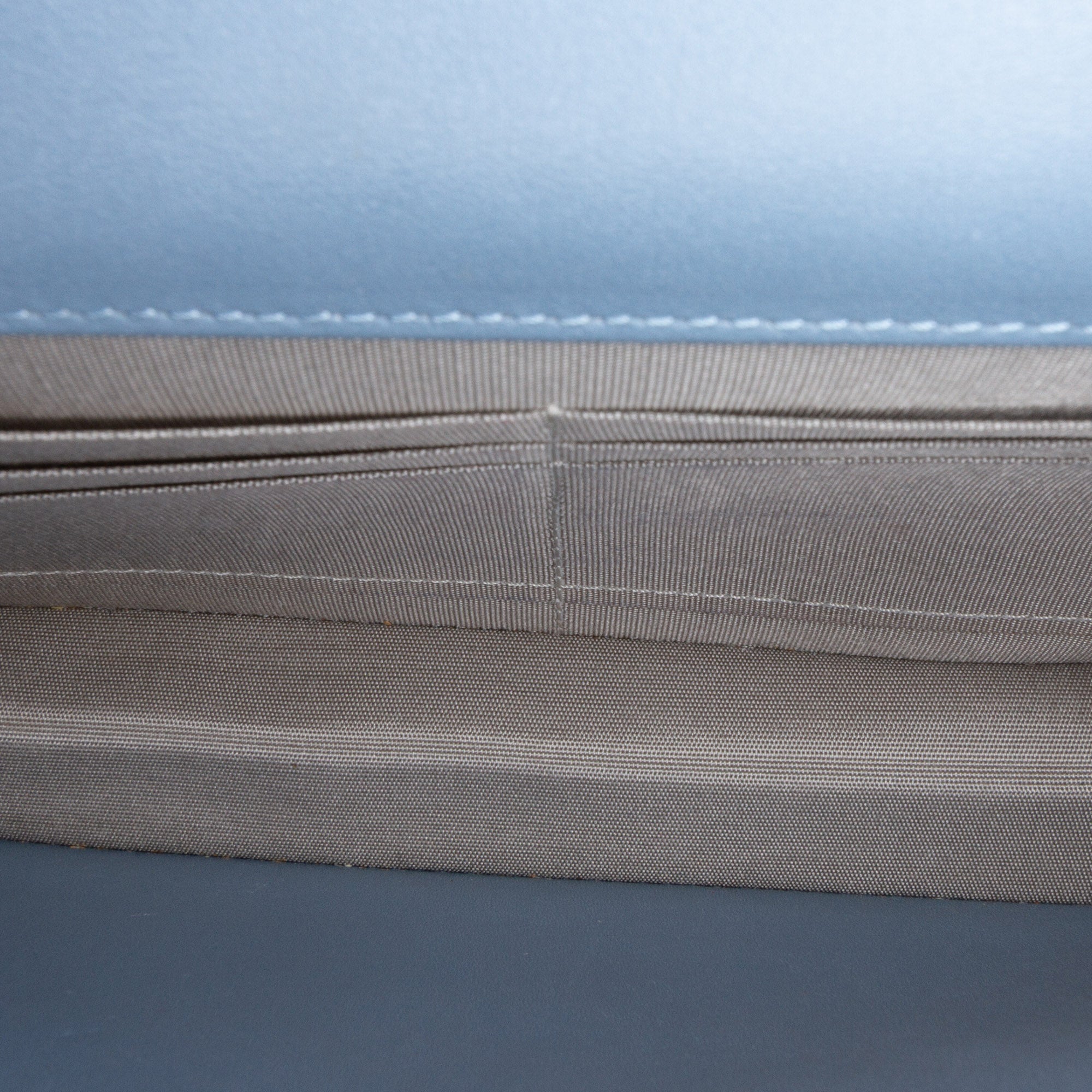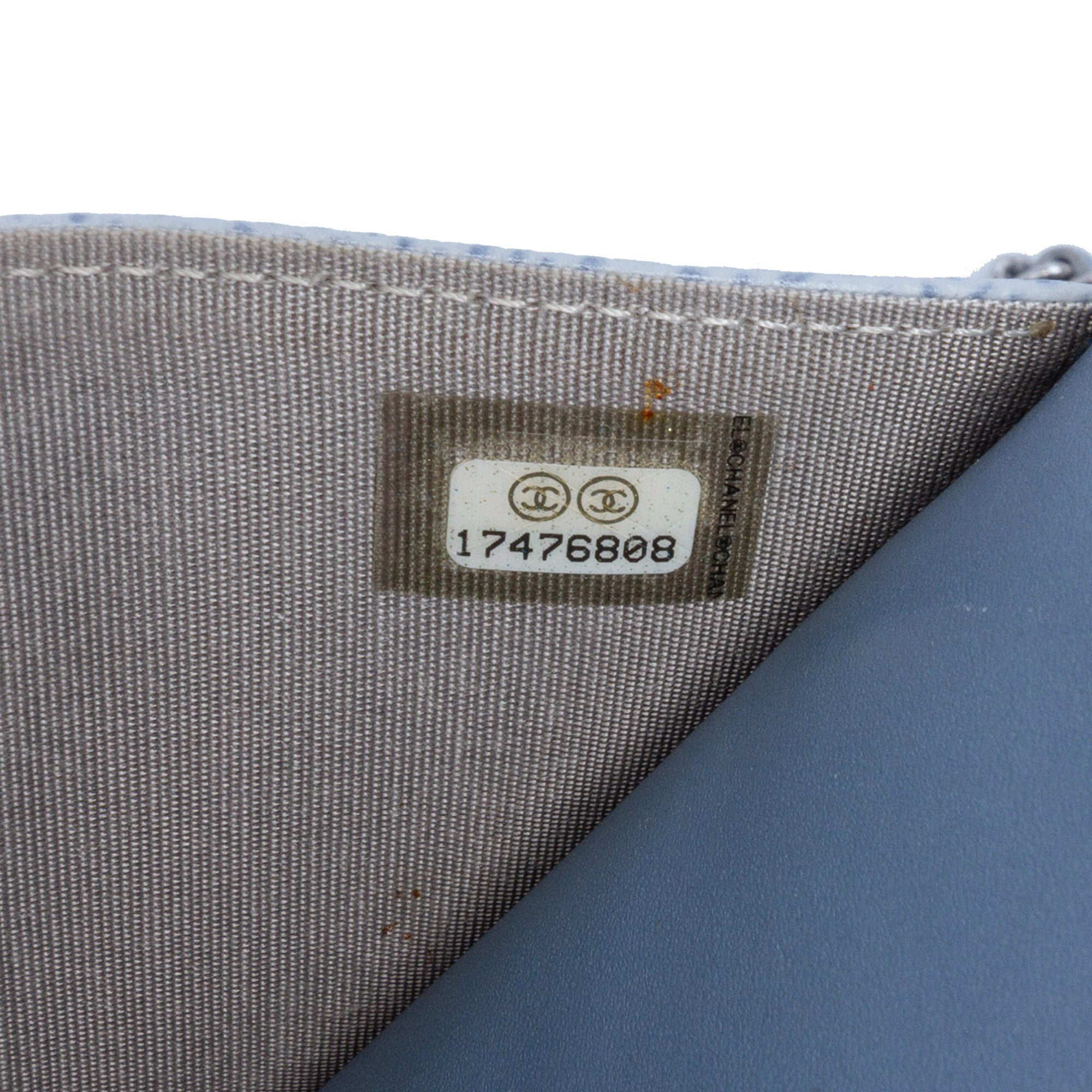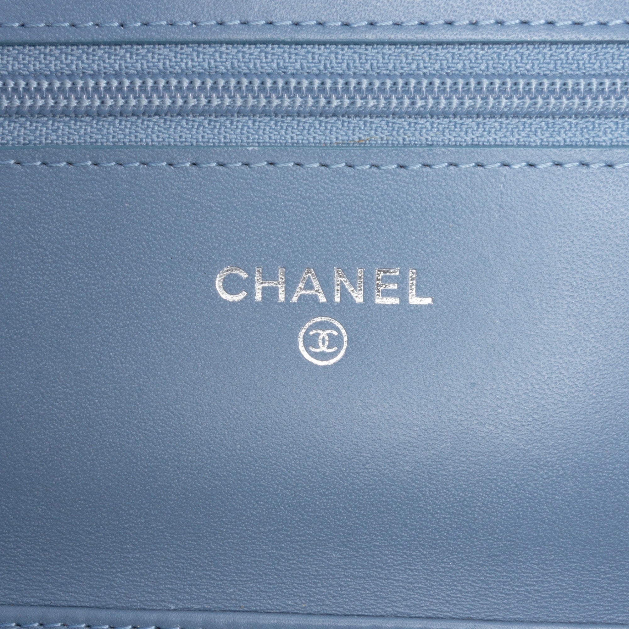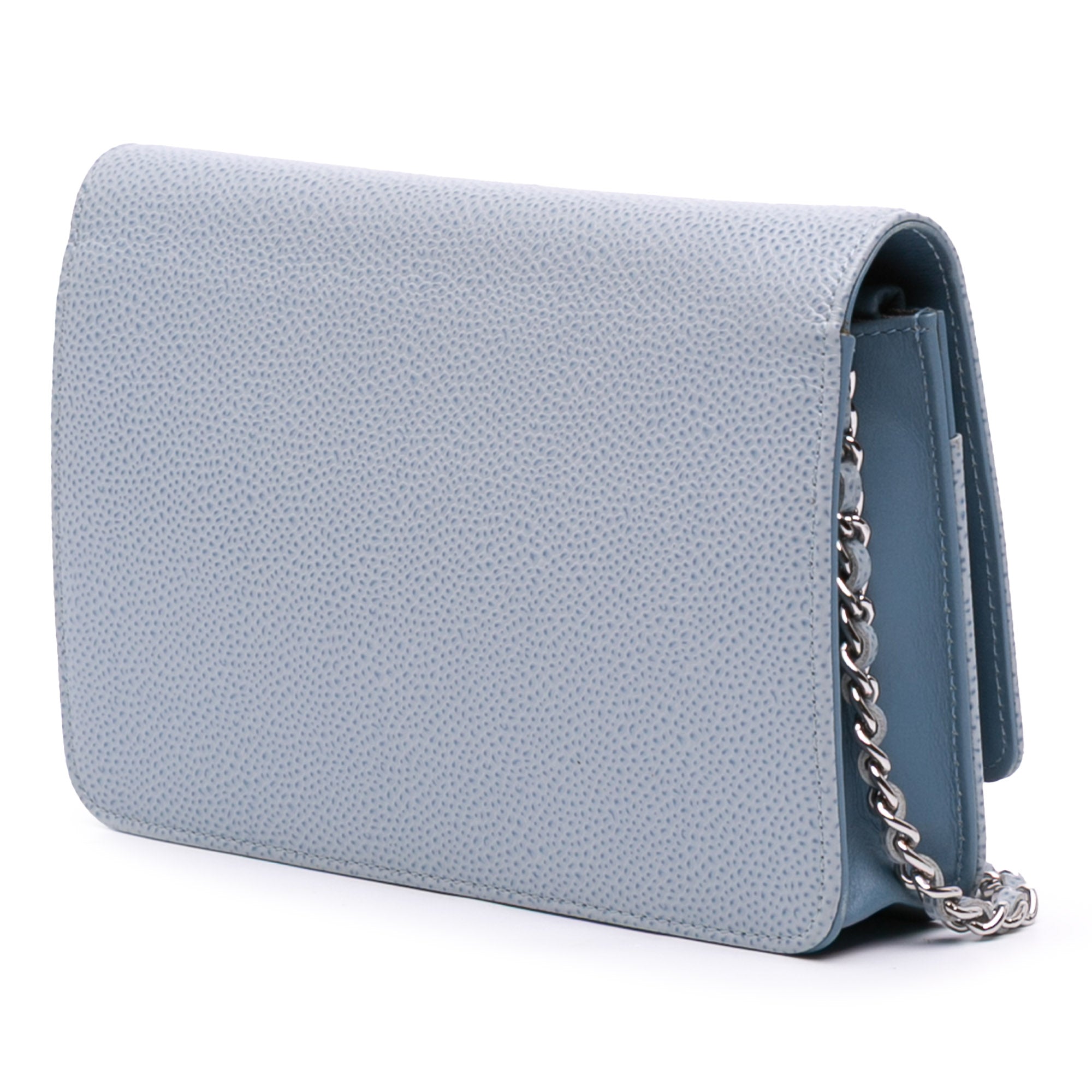 This wallet on chain features a caviar leather body, a leather woven chain link strap, a top flap with a magnetic closure, and interior zip and slip pockets. Retail Price: 2700.00