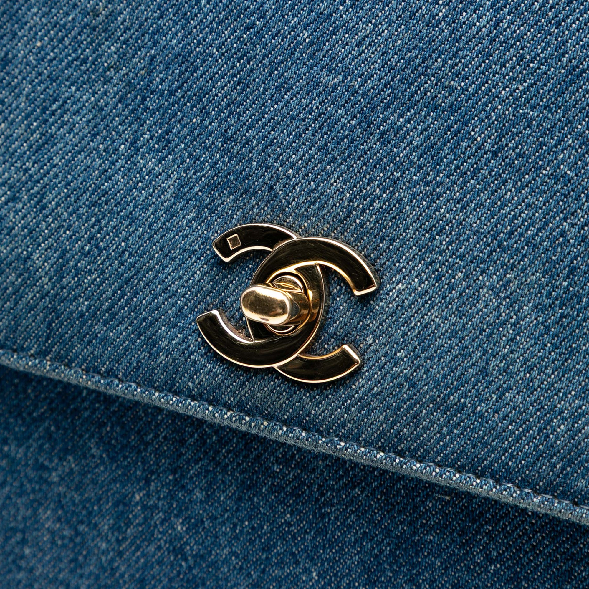 The Kelly handbag features a denim body, a rolled top handle, a top flap with CC turn lock closure, an exterior back slip pocket, and interior slip pocket. Inclusion: authenticity card. Retail Price: 4700.00