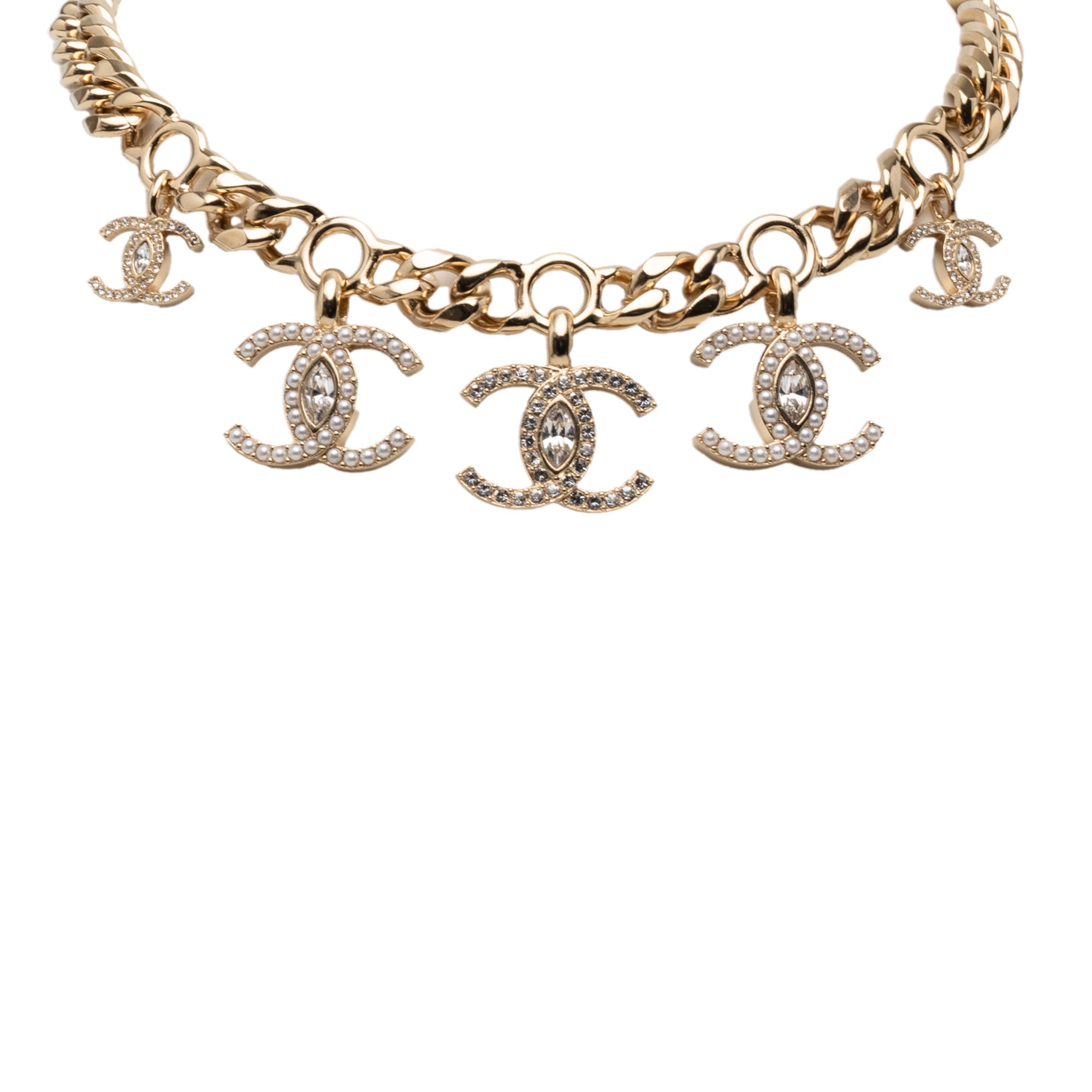 Chanel CC Gold Plated Faux Pearl Crystal Choker Necklace