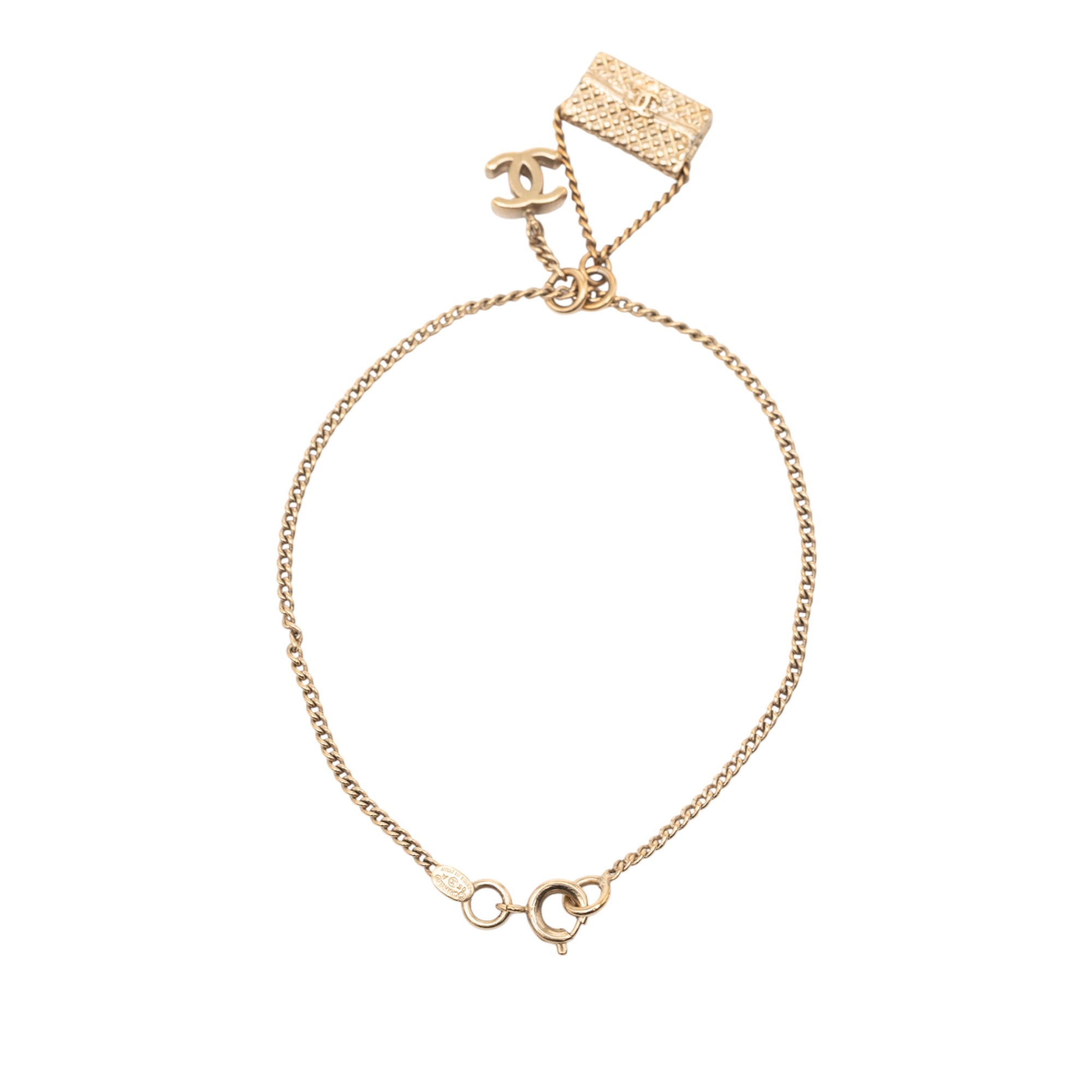 This bracelet features a flap bag and CC pendant, a gold-tone chain, and a spring ring closure. Inclusion: box. Retail Price: 990.00