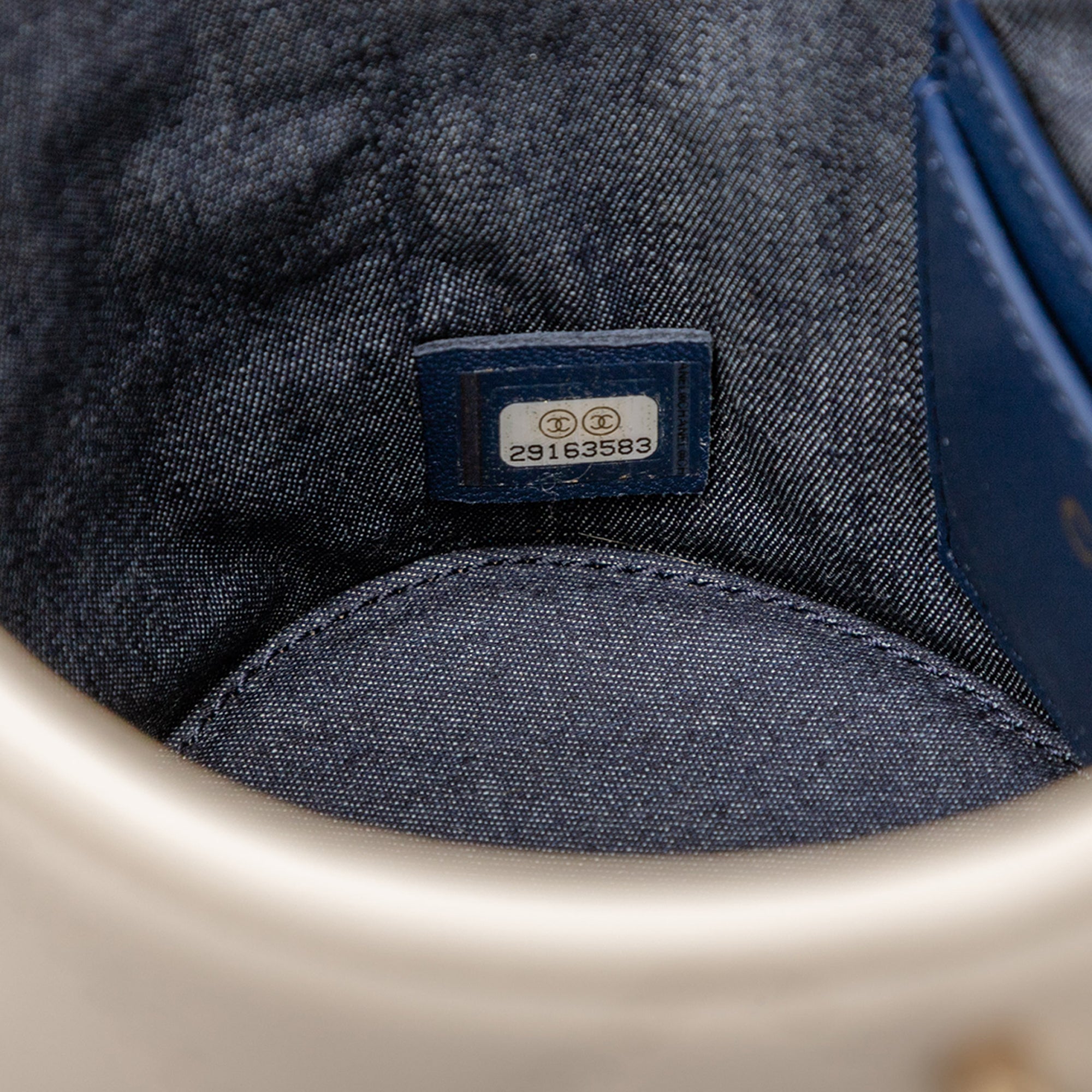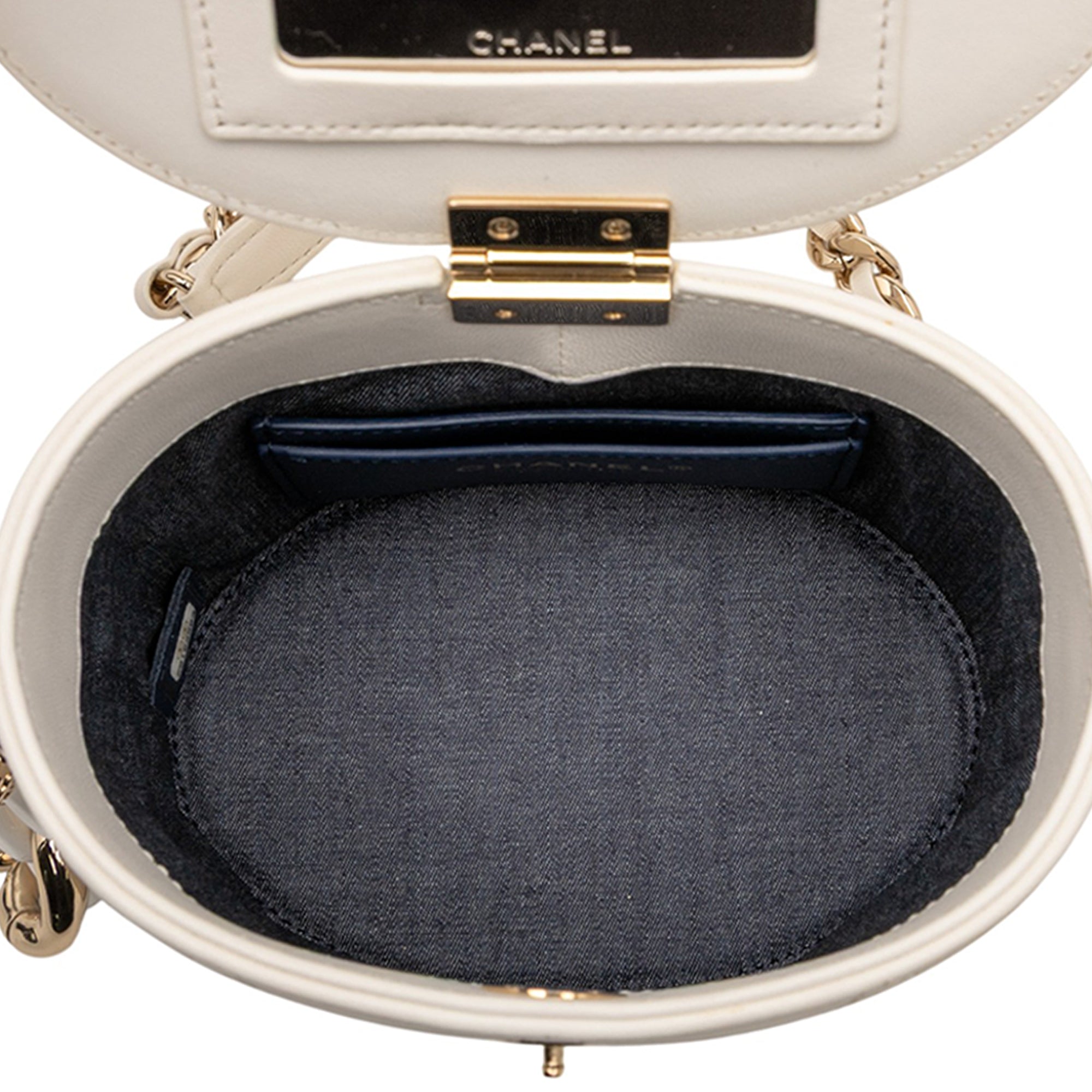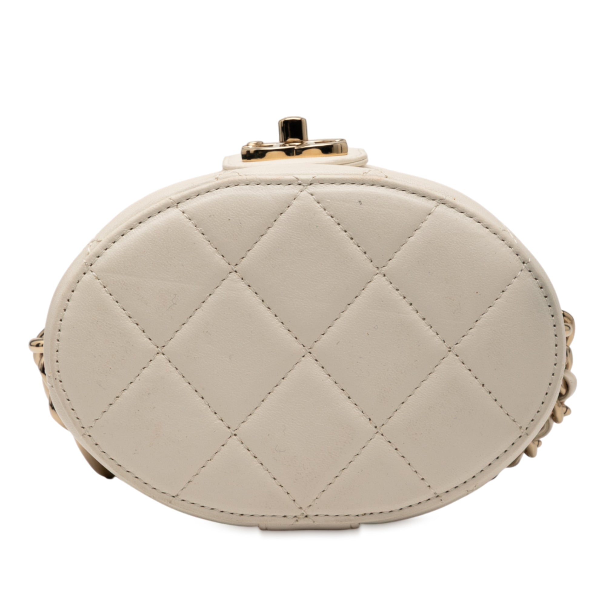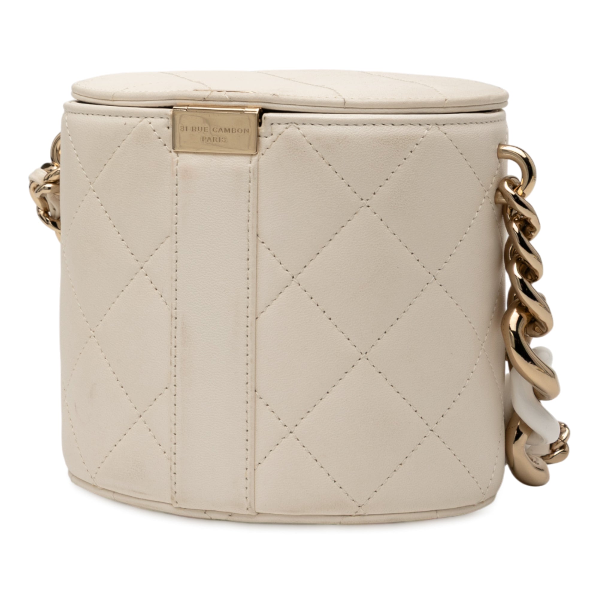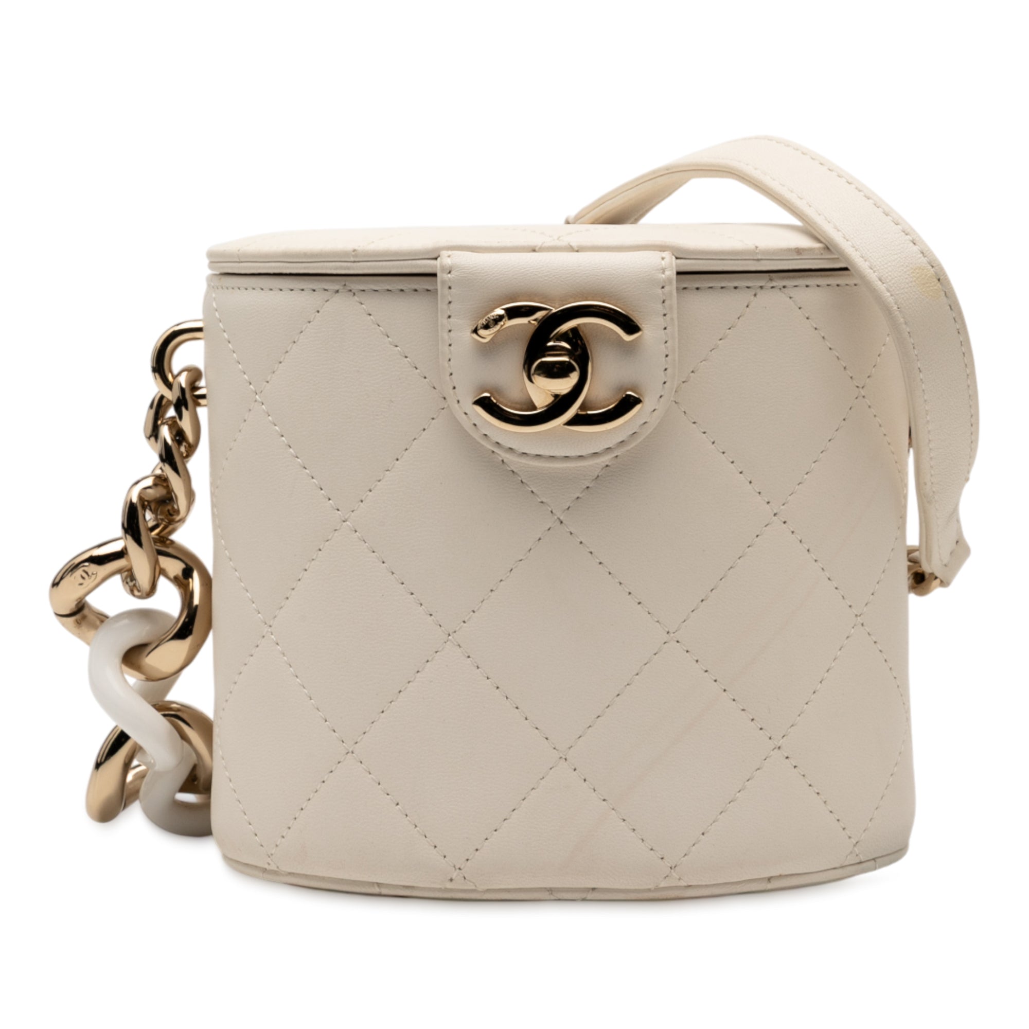 This vanity bag features a quilted lambskin leather body, a chain-link and leather woven chain shoulder strap with resin details, a top flap with CC turn-lock closure, interior slip pockets, and an interior mirror. Retail Price: 4100.00
