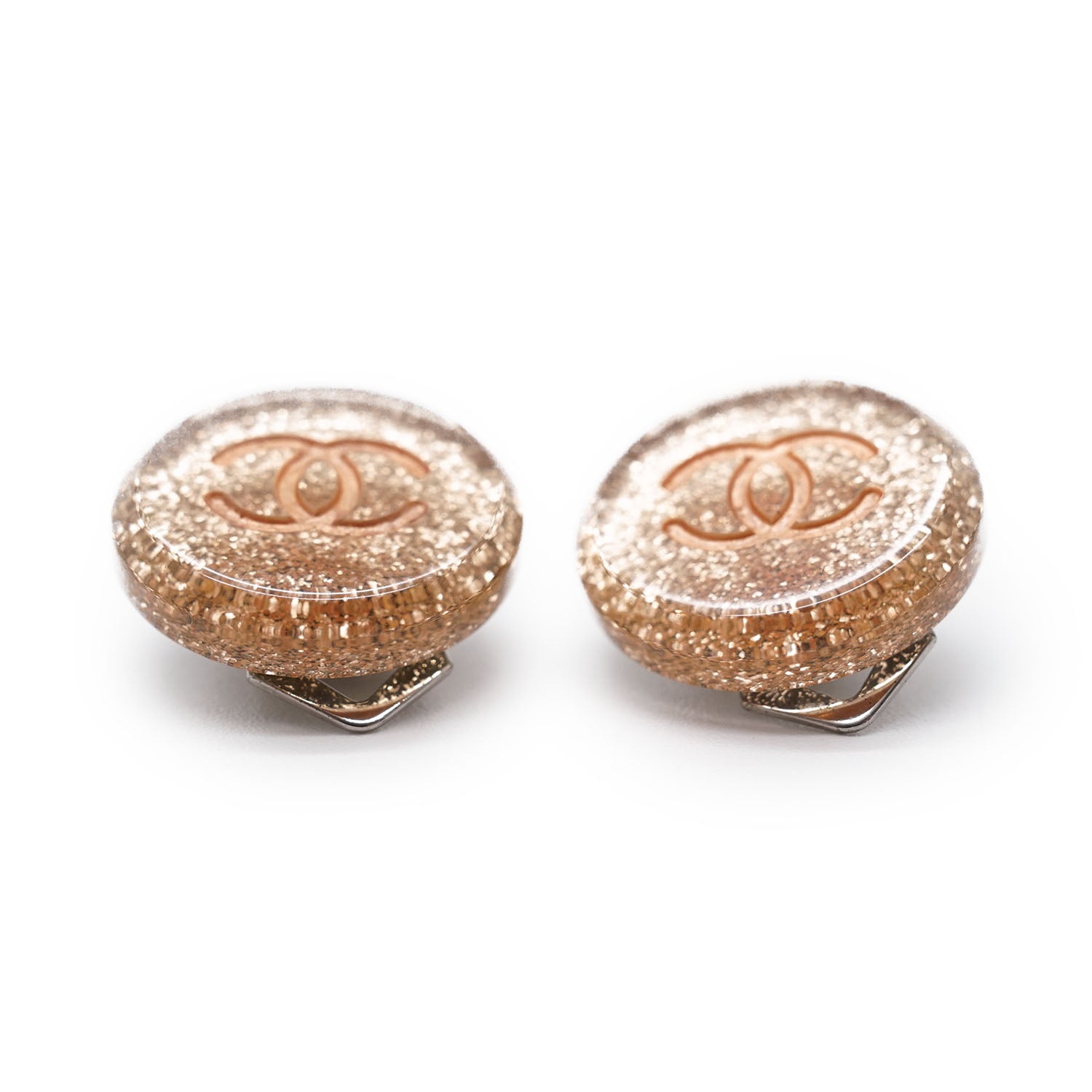 CC Logo Glitter Round Clip-On Earrings Champagne Brass, ResinDepth: 0.3cmHeight: 1.6cmWidth: 1.7cmDiscoloration: Slight tarnish on the back of both earringsScratch: Some scratches on the clasp of one earringWorn: Minor signs of wear on the back of both earringsSerial code: 00ASKU: 7070091