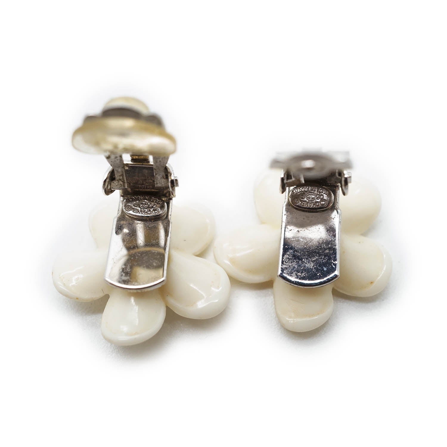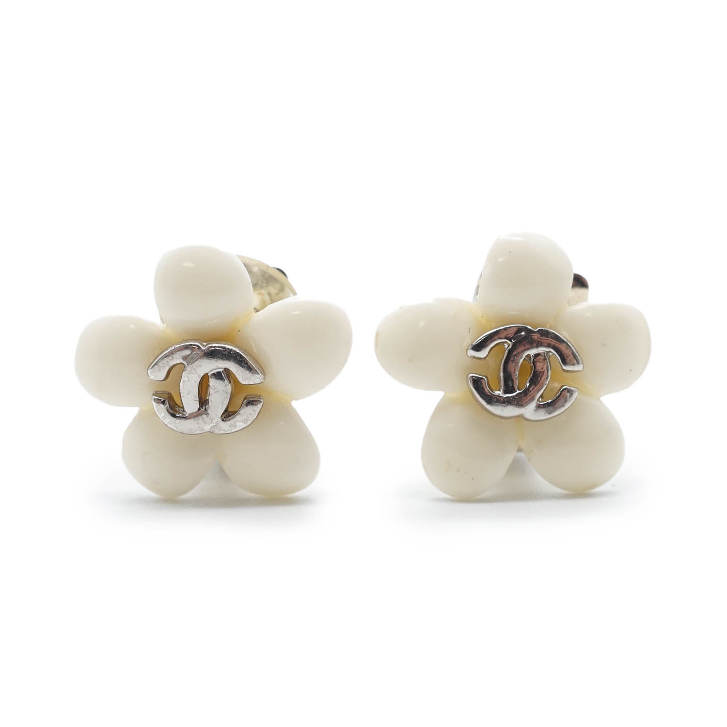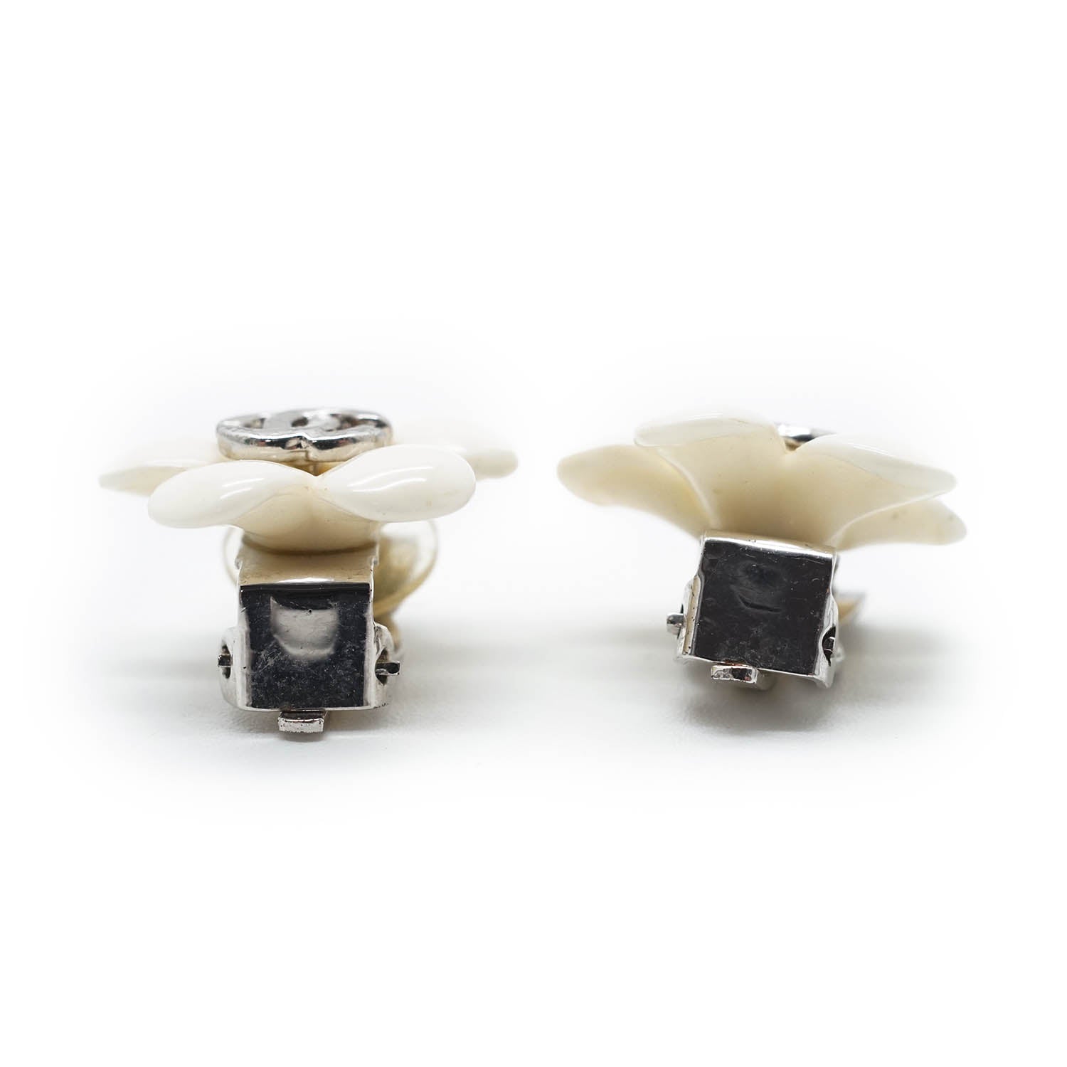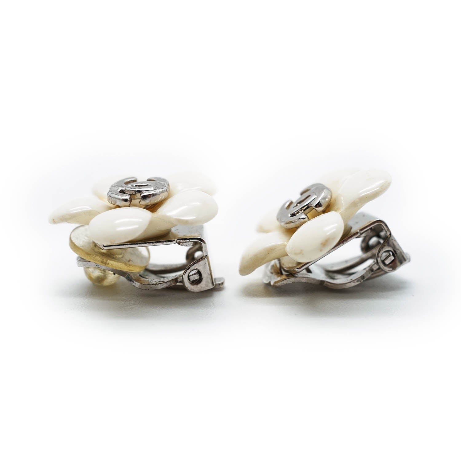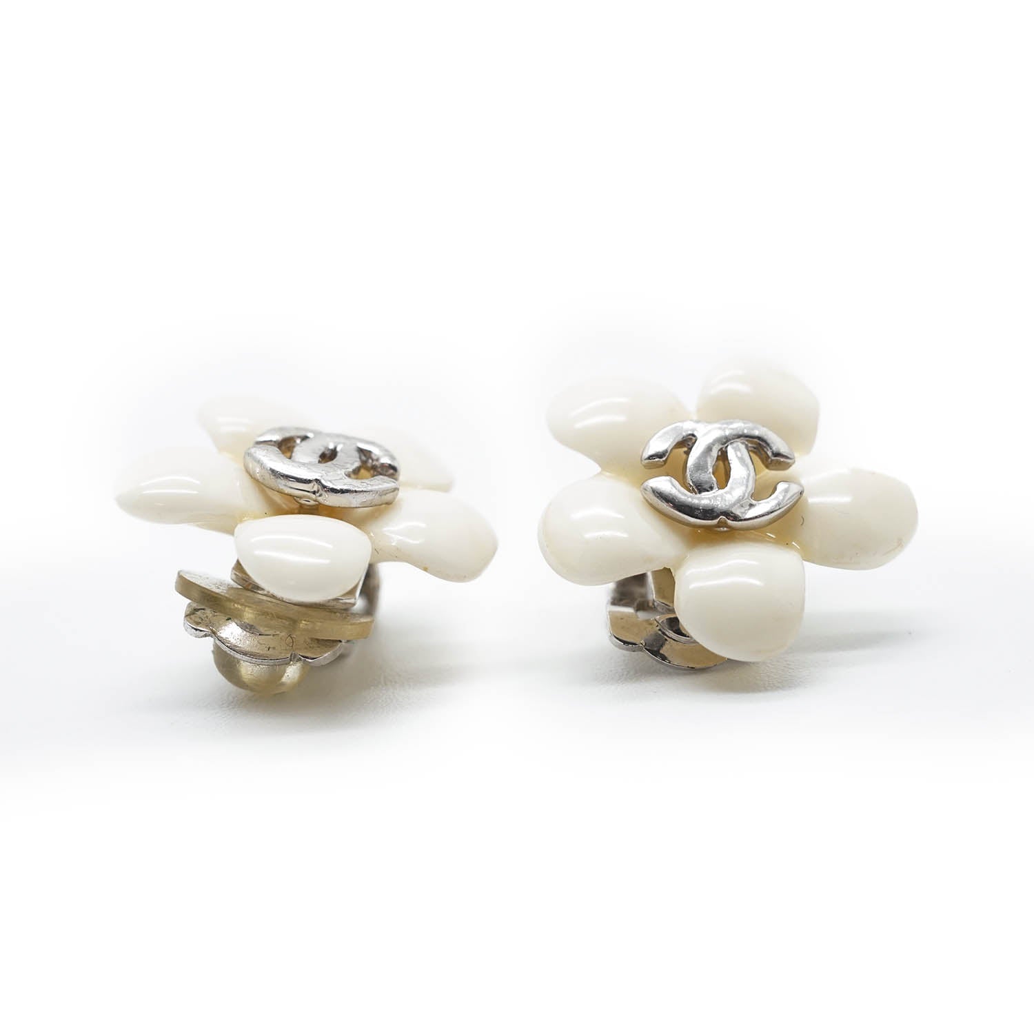 CC Logo White Flowers Clip Earrings White MetalDepth: 0.4cmHeight: 1.7cmWidth: 1.7cmStain: Minor stains/discoloration on the back of both earringsDiscoloration: Some metal tarnishingWorn: Some signs of wearMissing: Earring pad missing on the clasp of one of the earringsComments: The clasp missing the earring pad is slightly looseSerial code: 05PSKU: 7050091