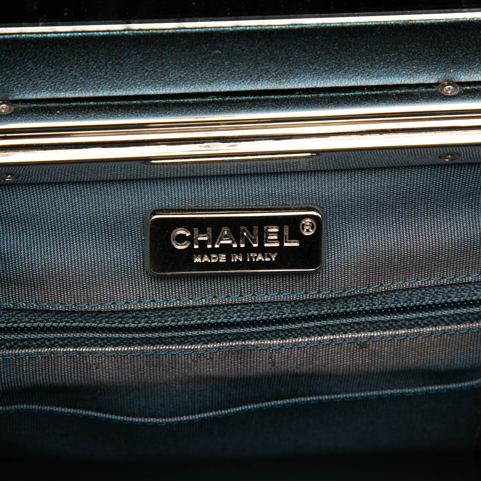 This vanity bag features a metallic leather body, leather woven chain link and rolled leather strap, a top frame clasp closure, and interior zip and slip pockets. Retail Price: 3702.00
