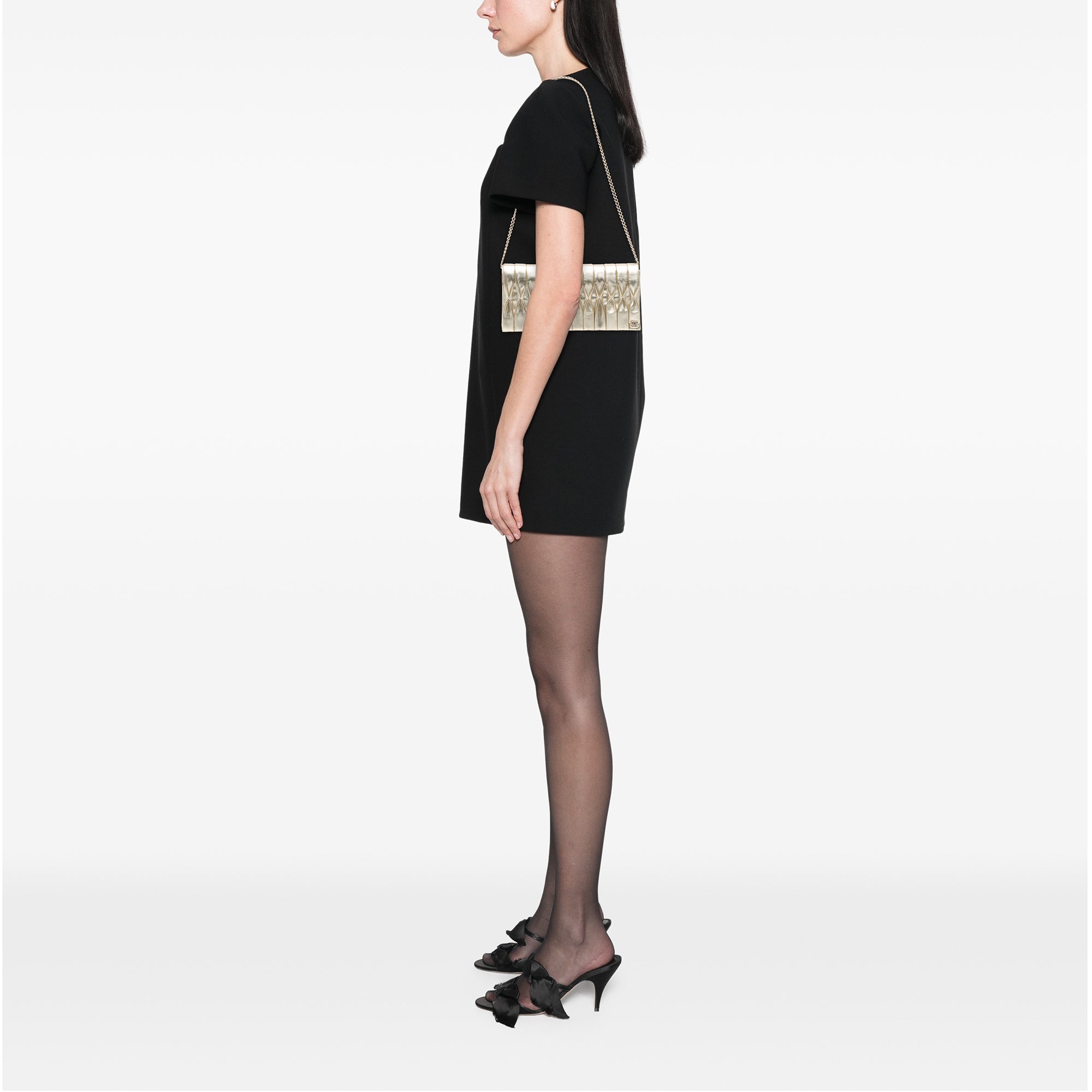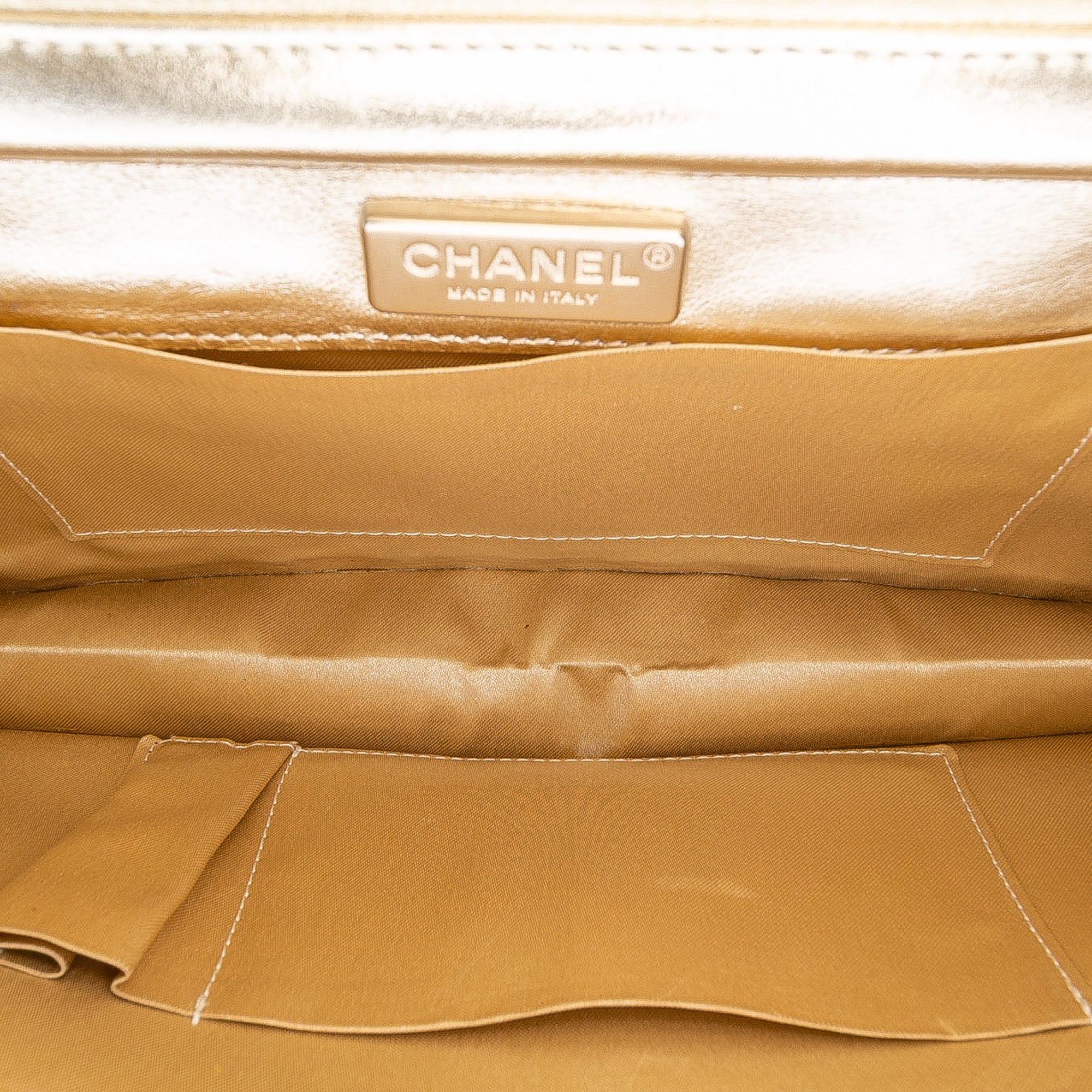 This shoulder bag features a metallic lambskin leather body, gold-tone chain link strap, front flap with magnetic snap closure, and interior slip pockets. Inclusion: authenticity card. Retail Price: 3400.00