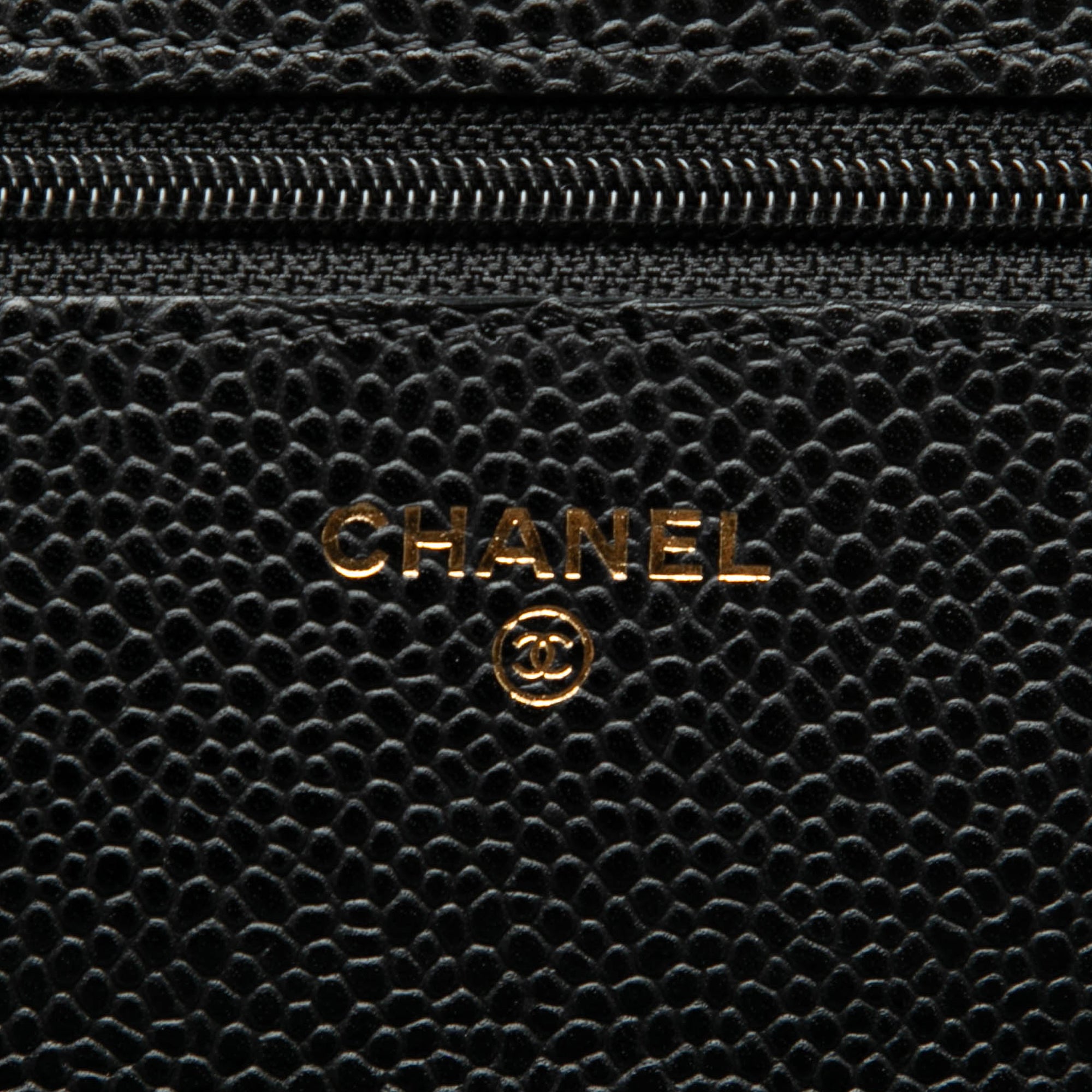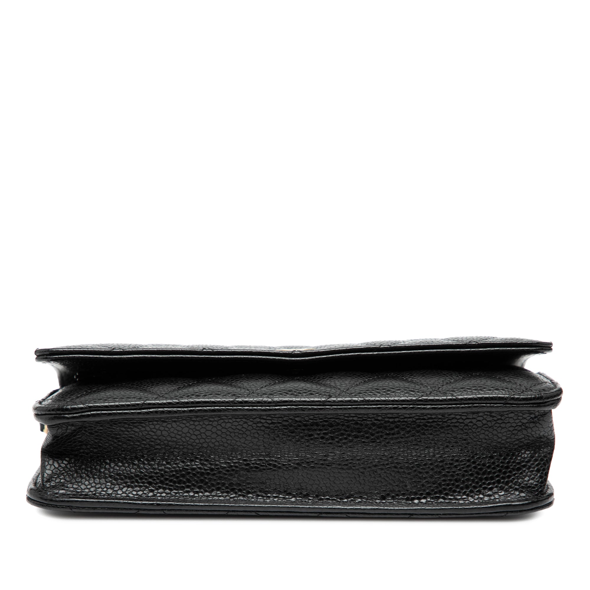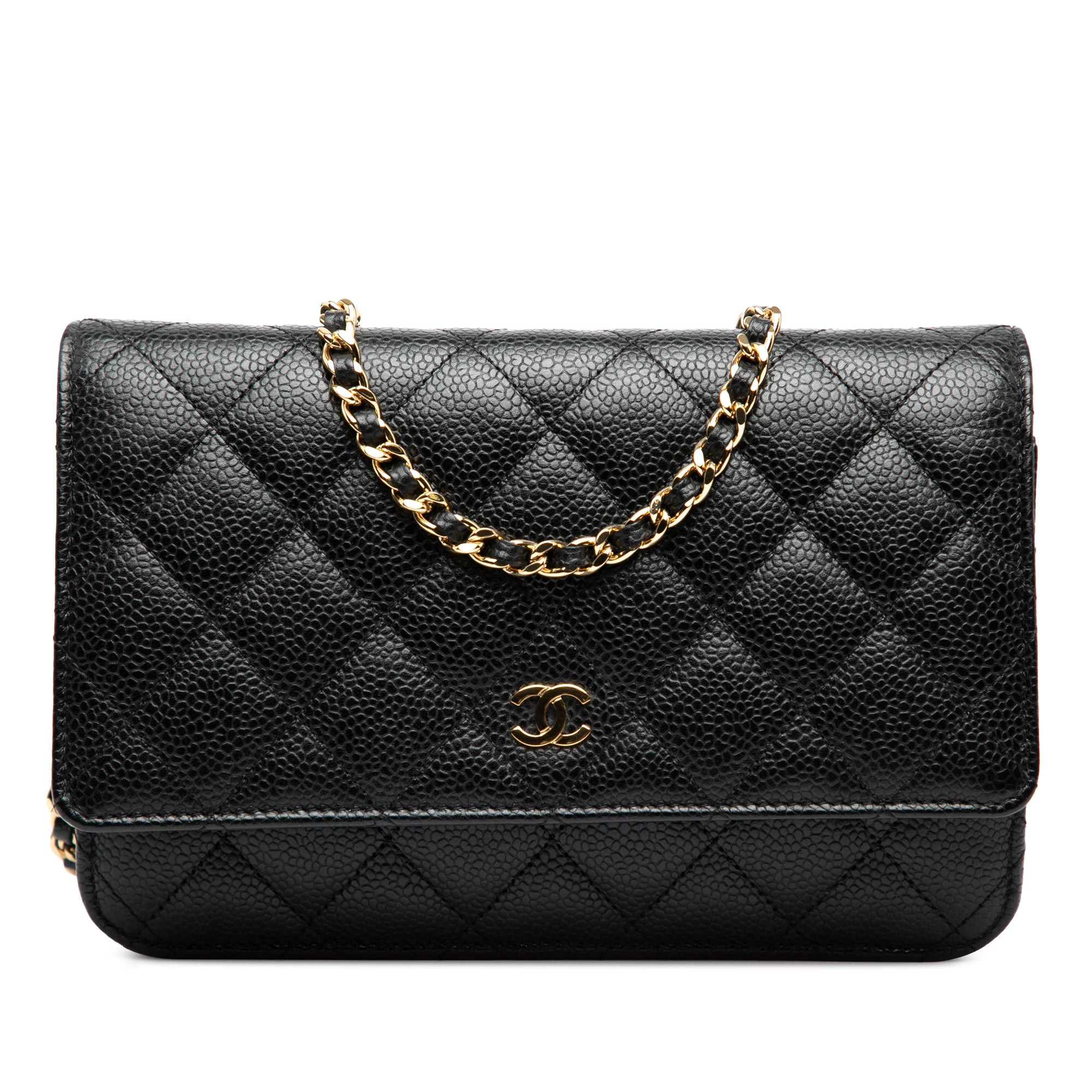 This wallet on chain features a quilted caviar leather body, a leather woven chain link strap, a front flap with magnetic snap closure, an exterior back slip pocket and interior zip and slip pockets. Inclusion: box, authenticity card. Retail Price: 3350.00