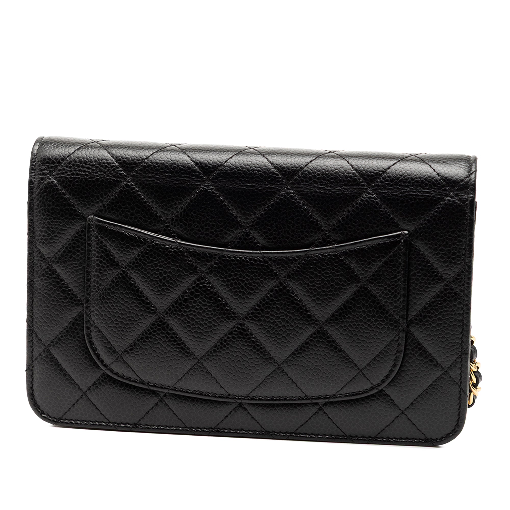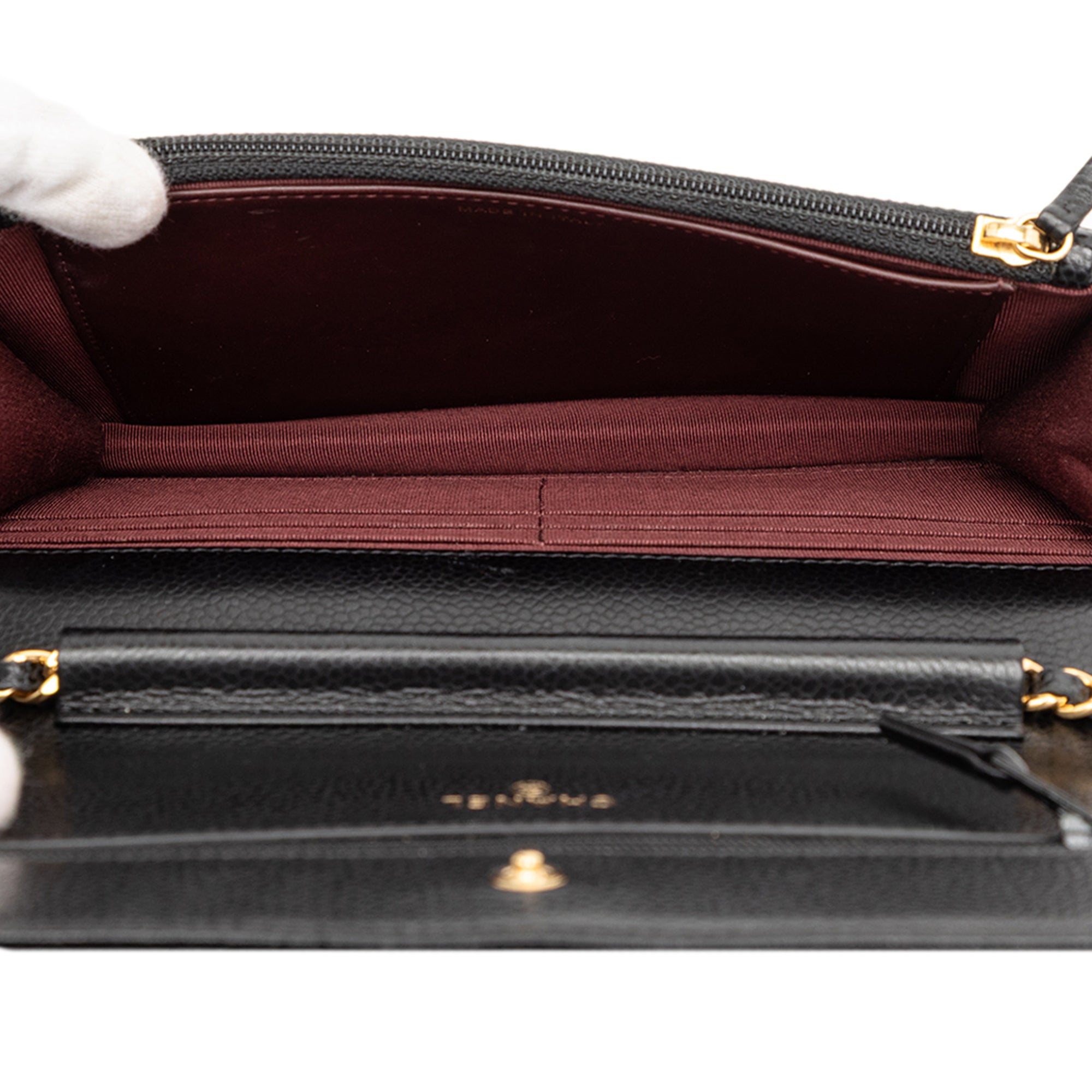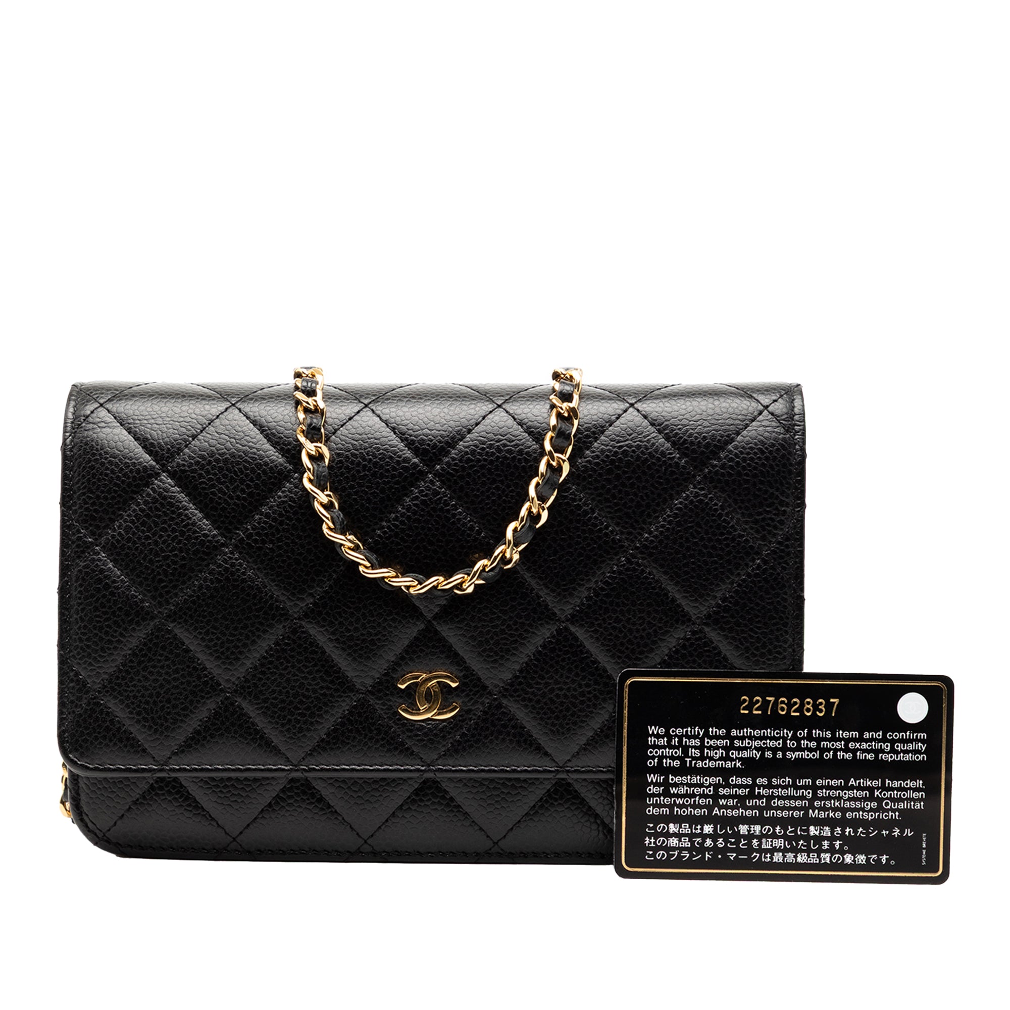 This wallet on chain features a quilted caviar leather body, a silver-tone woven chain strap, a front flap with magnetic snap closure, a top zip closure, and interior slip pockets. Inclusion: authenticity card. Retail Price: 3350.00