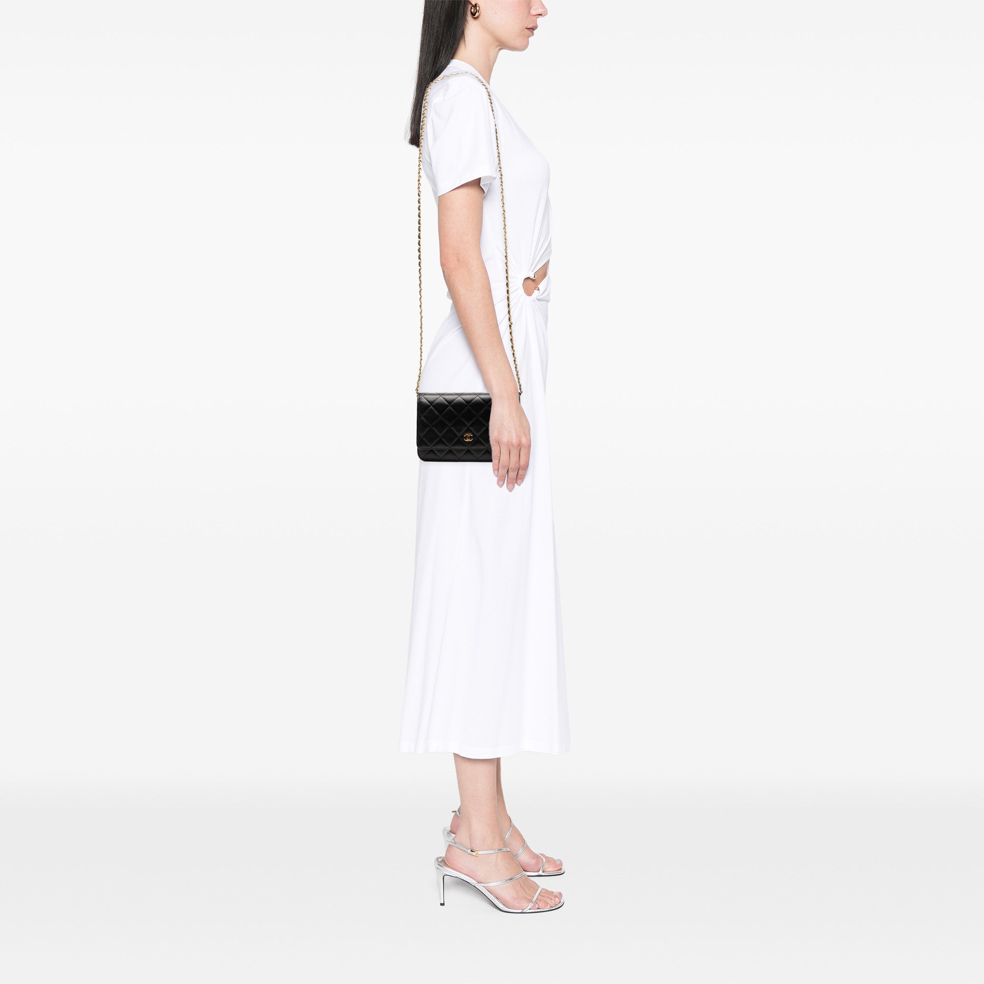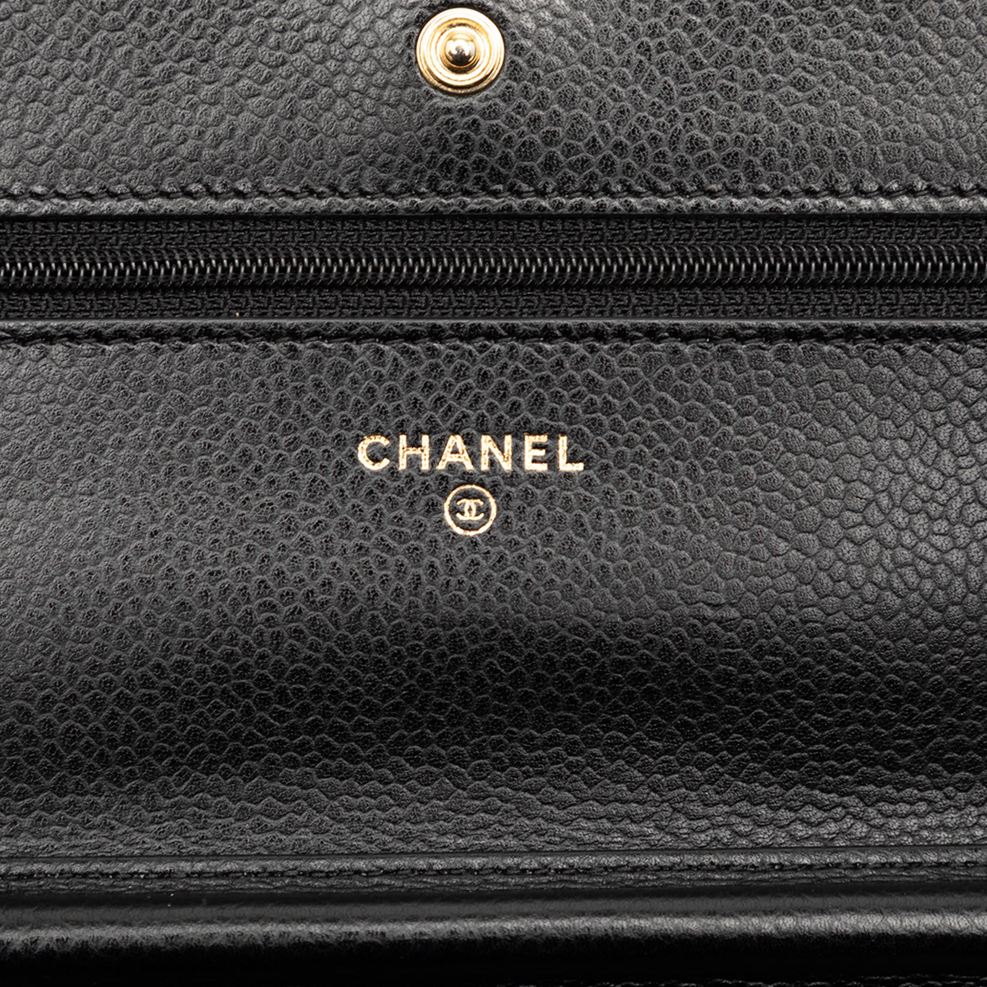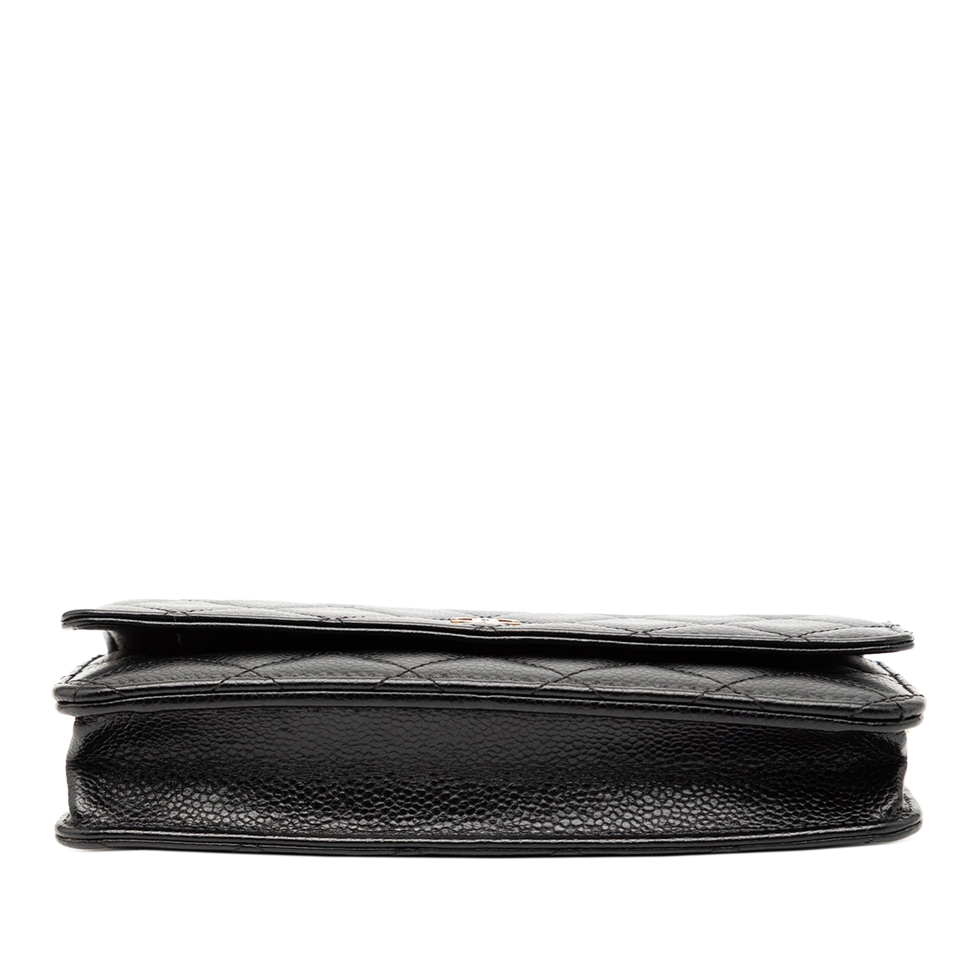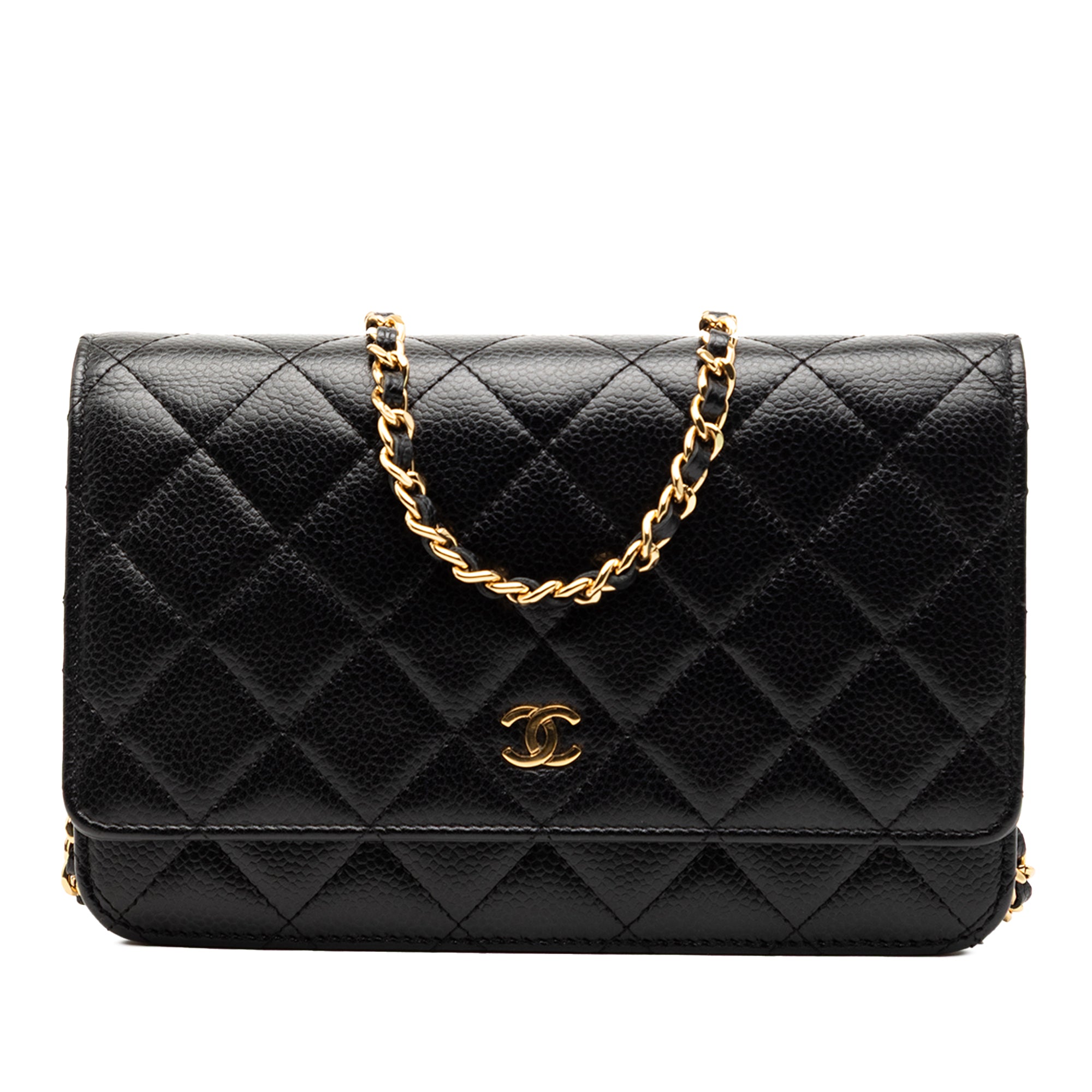 This wallet on chain features a quilted caviar leather body, a silver-tone woven chain strap, a front flap with magnetic snap closure, a top zip closure, and interior slip pockets. Inclusion: authenticity card. Retail Price: 3350.00