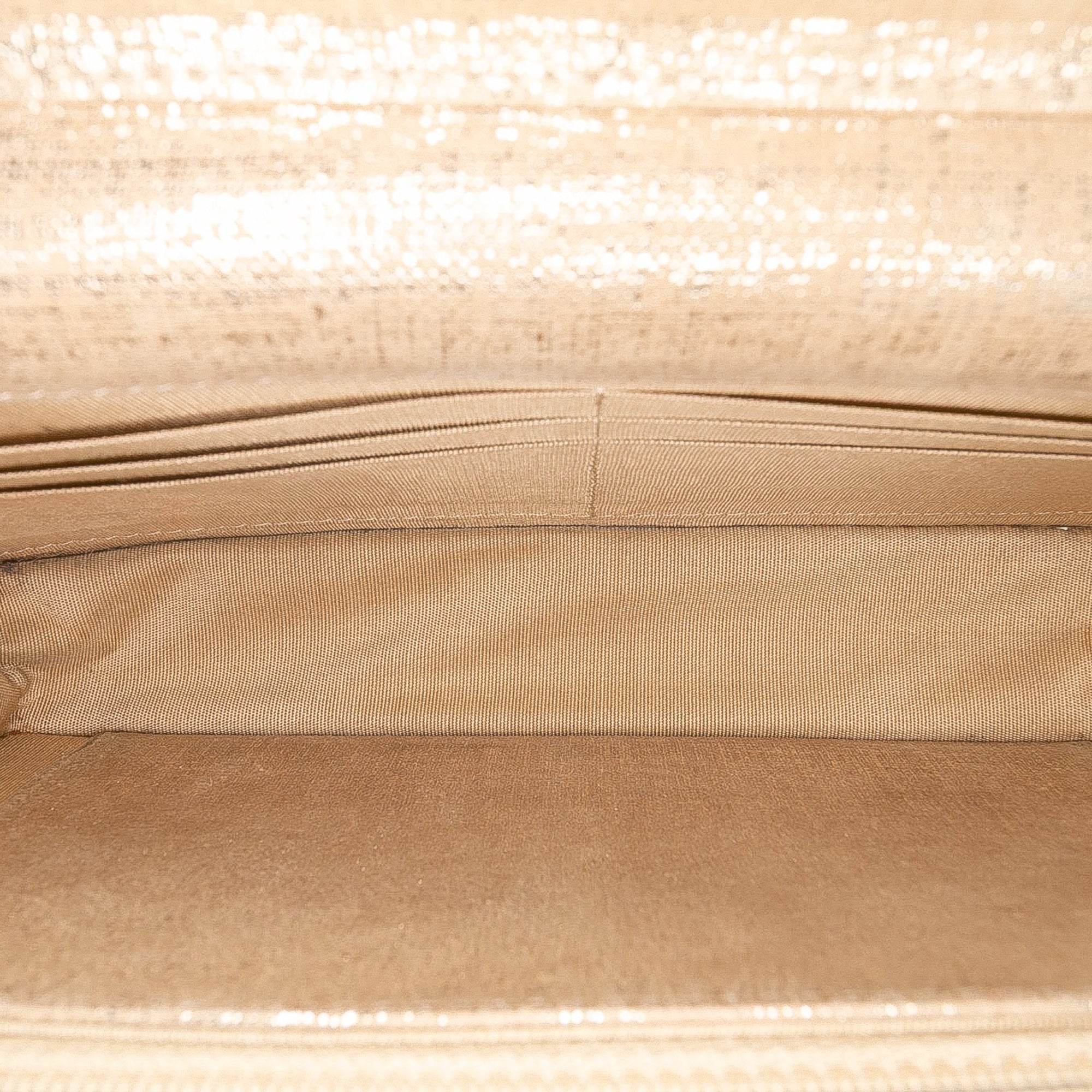 This wallet on chain features a quilted calfskin leather body, a leather-woven chain link strap, a front flap with a magnetic closure, an interior zip compartment, and interior zip and slip pockets. Retail Price: 1700.00