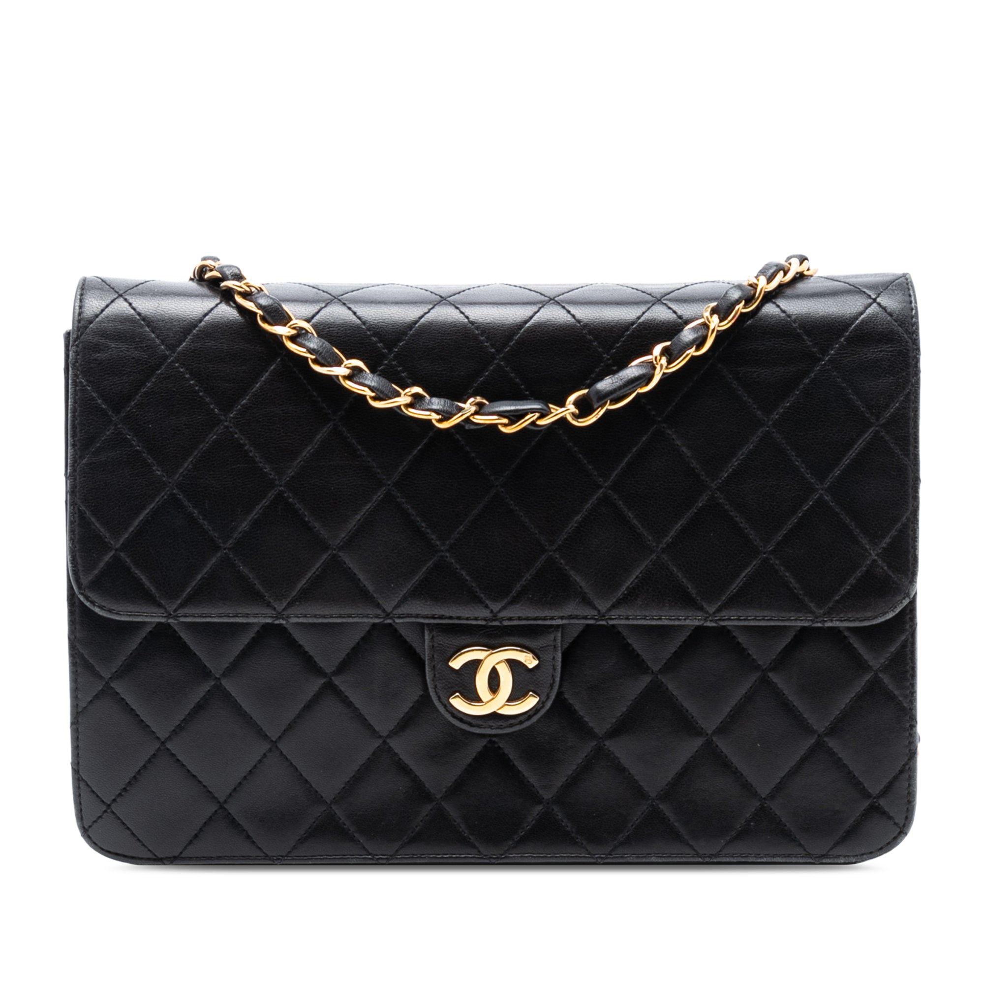 This crossbody bag features a quilted lambskin leather body, a leather woven chain link strap, a front flap with magnetic snap closure, and an interior zip pocket. Retail Price: 4400.00