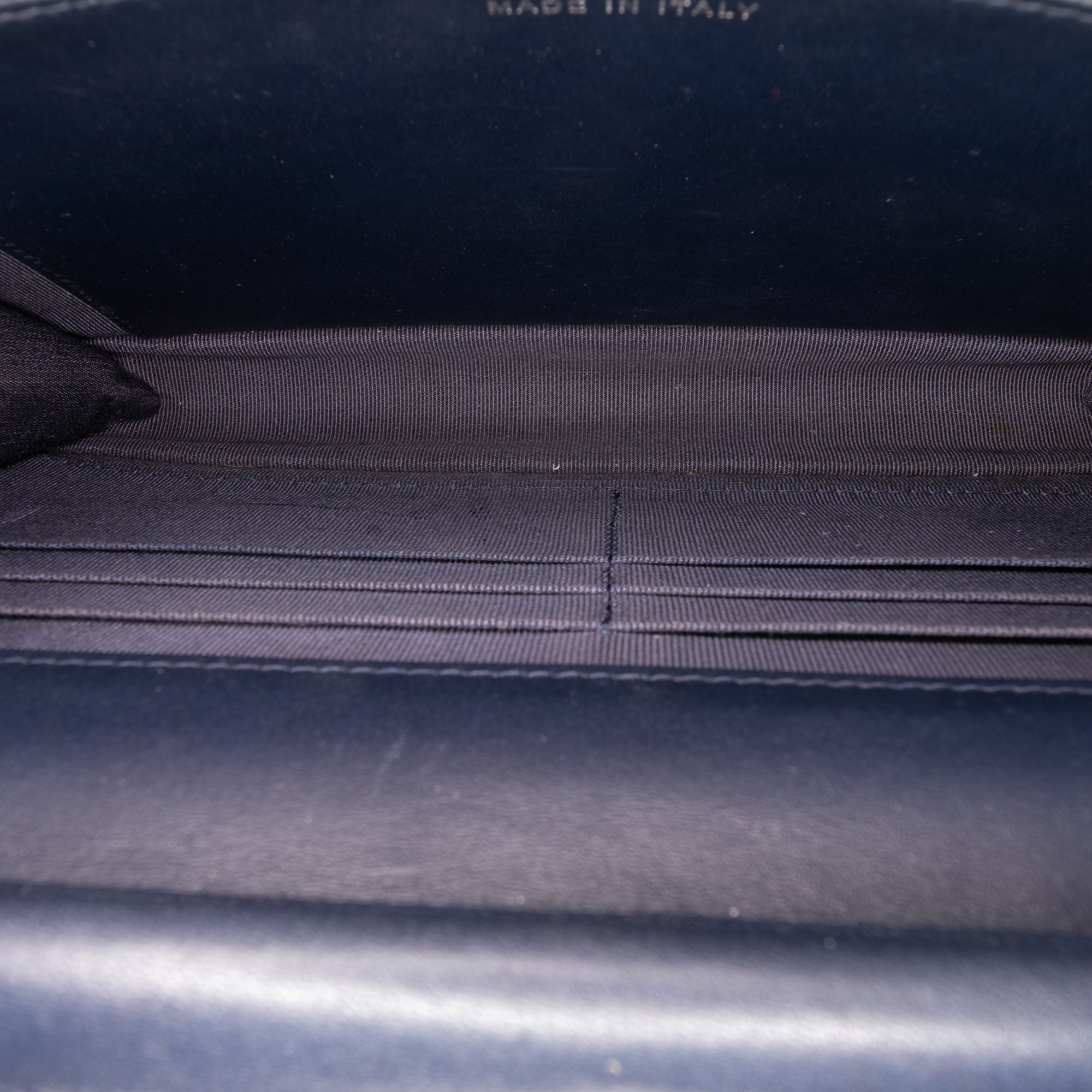 This wallet on chain features a quilted patent leather body, a leather woven chain link strap, a front flap with snap closure, an interior zip compartment, and interior zip and slip pockets. Retail Price: 2450.00