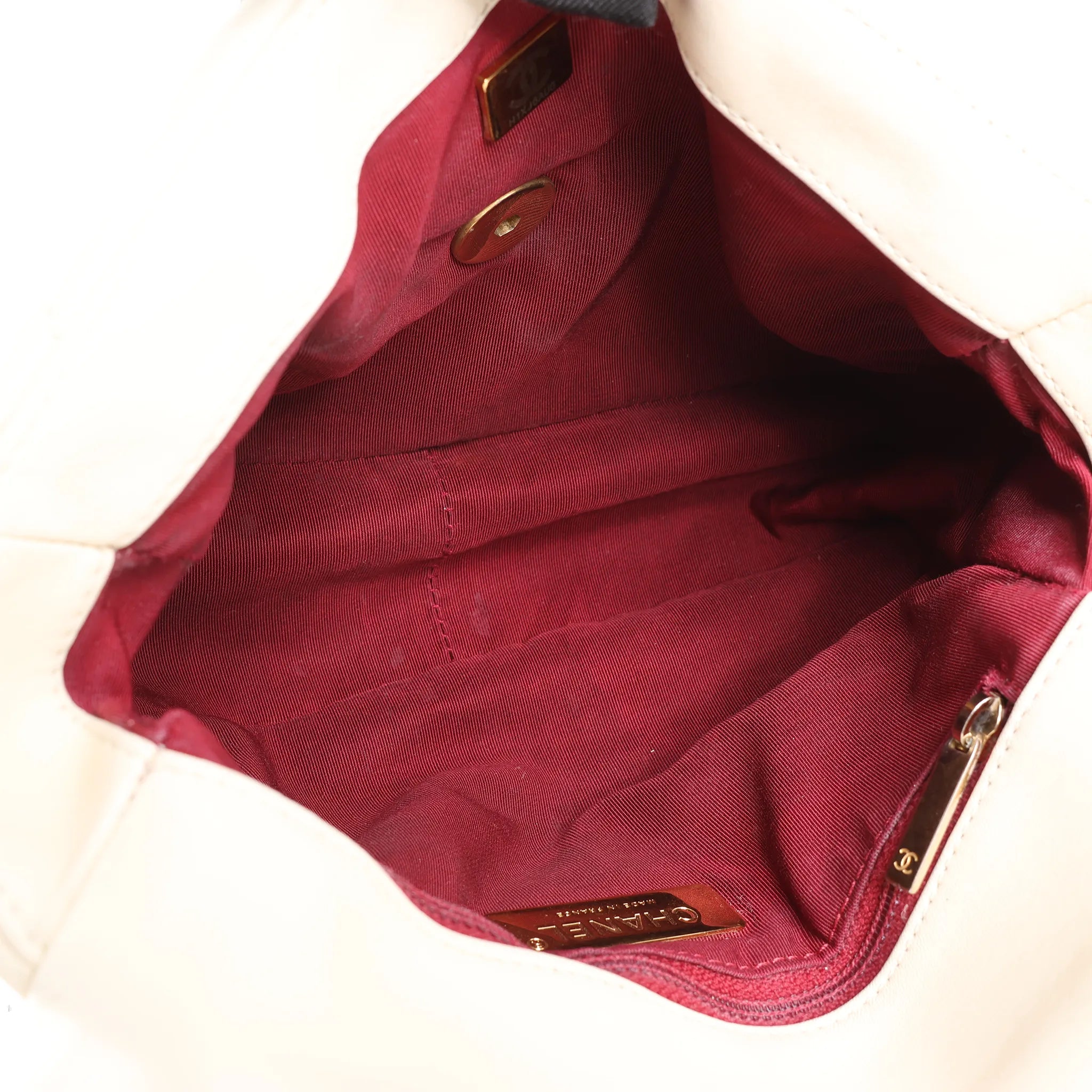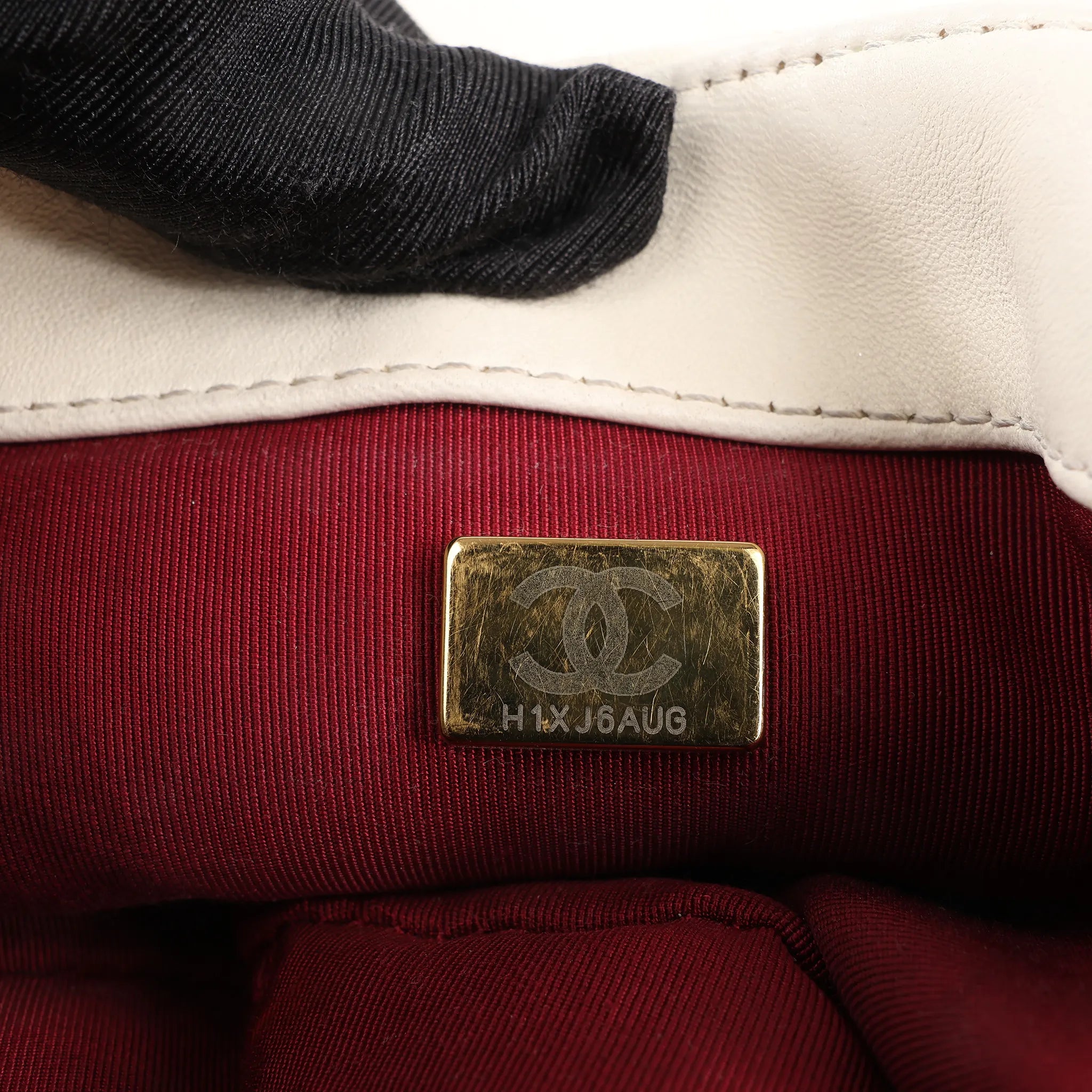Brand: Chanel Model: Chanel 19Size: LargeWidth: 25 cmHeight: 18 cmExterior Condition: ExcellentInterior Condition: ExcellentCondition Details: The exterior leather is clean and in great condition, the color was restored. The hardware chain and turn lock is still bright and crisp with some seamless surface scratches. The interior lining is in excellent condition, except some small stains. Date code: H1XJ6AUGColour: EcruInterior Colour: RedHardware Colour: Gold, SilverMaterial: LeatherComes With: Box, dustbag, brand care guidline