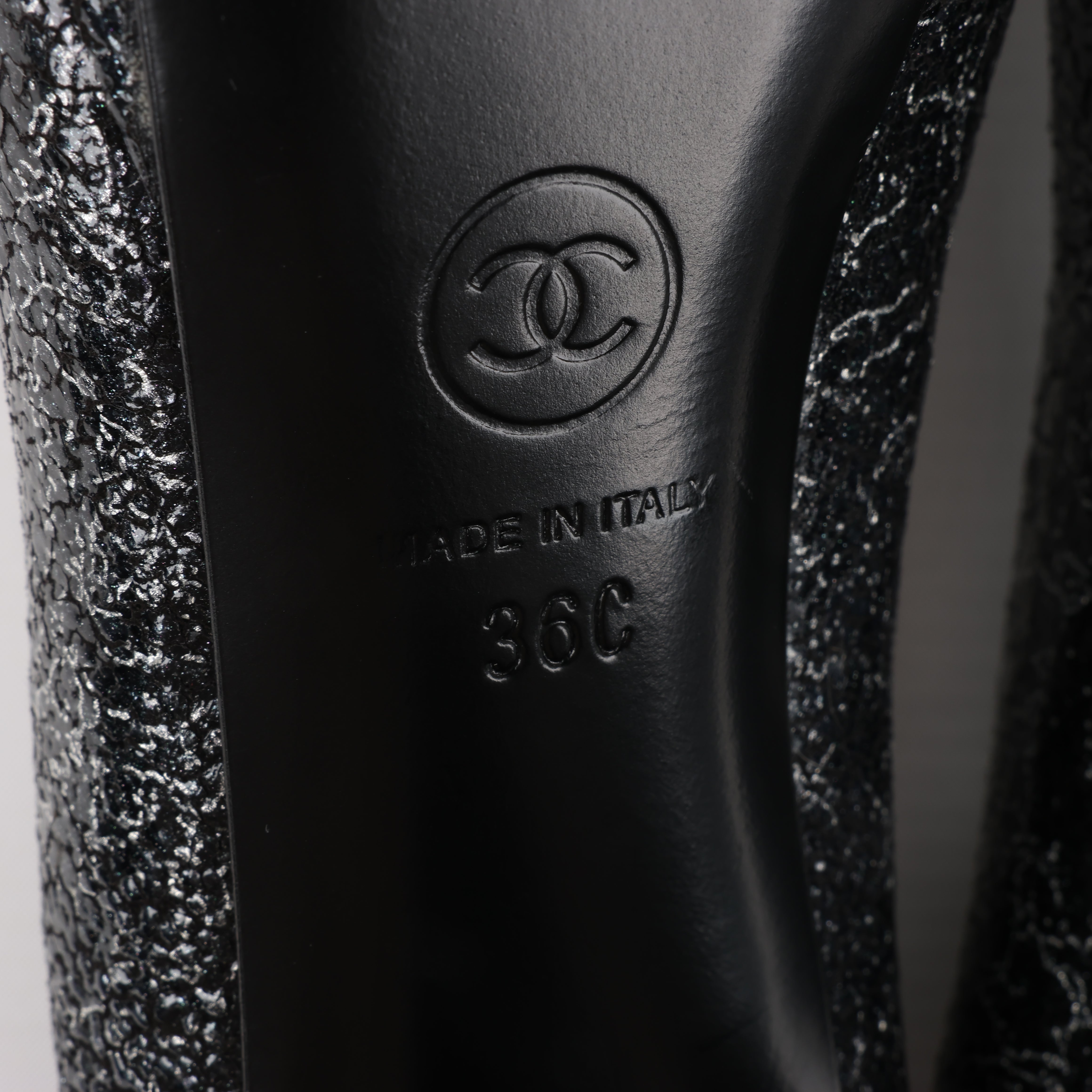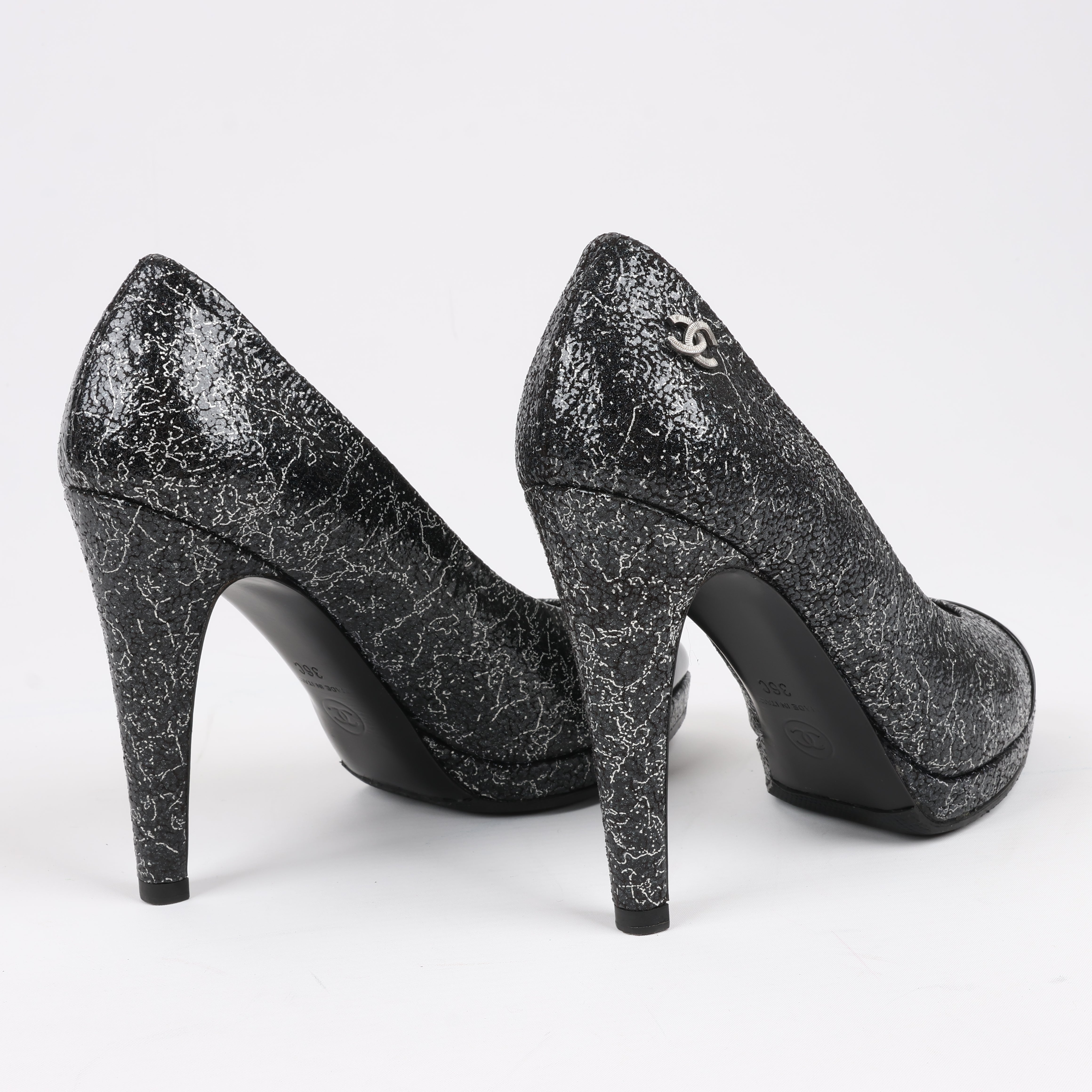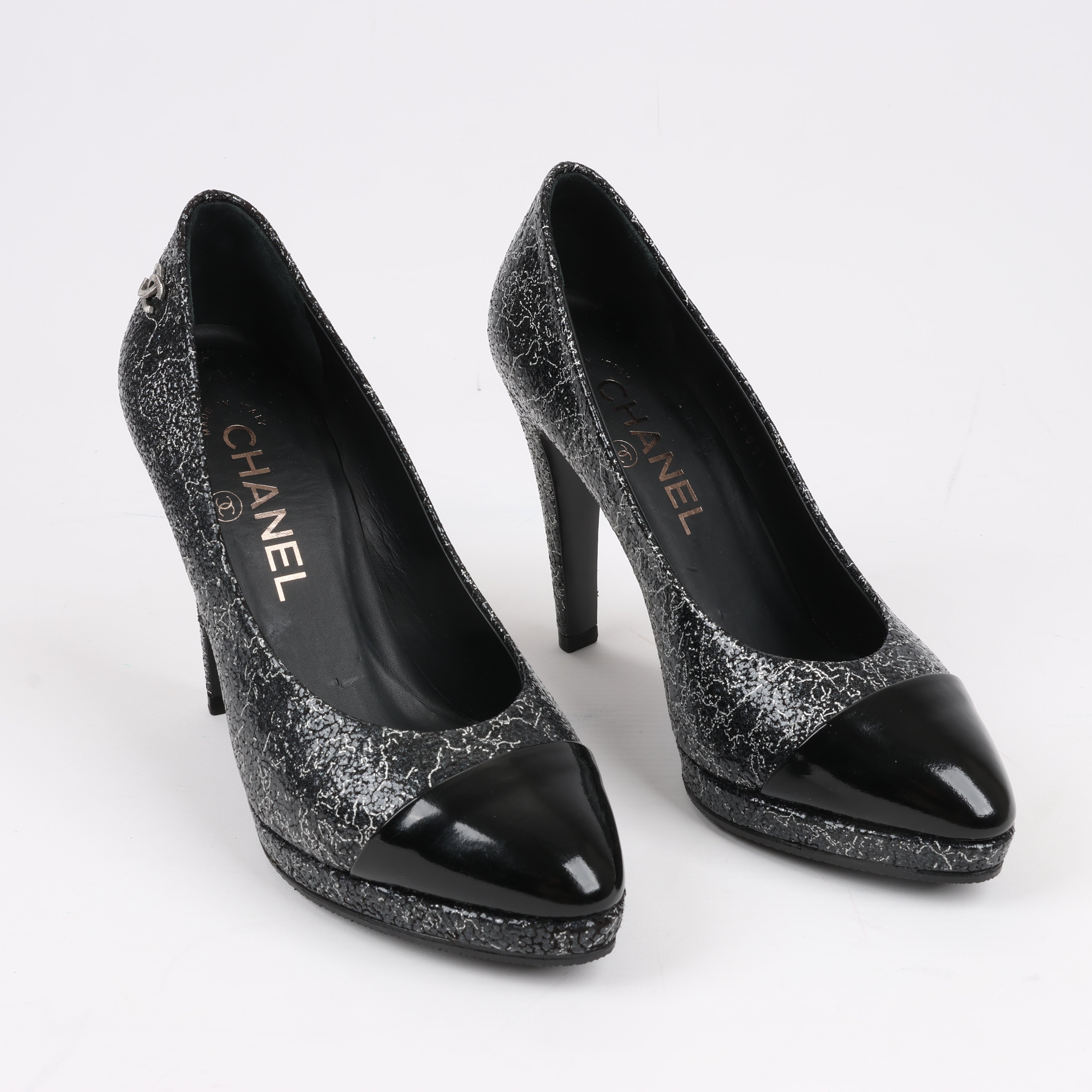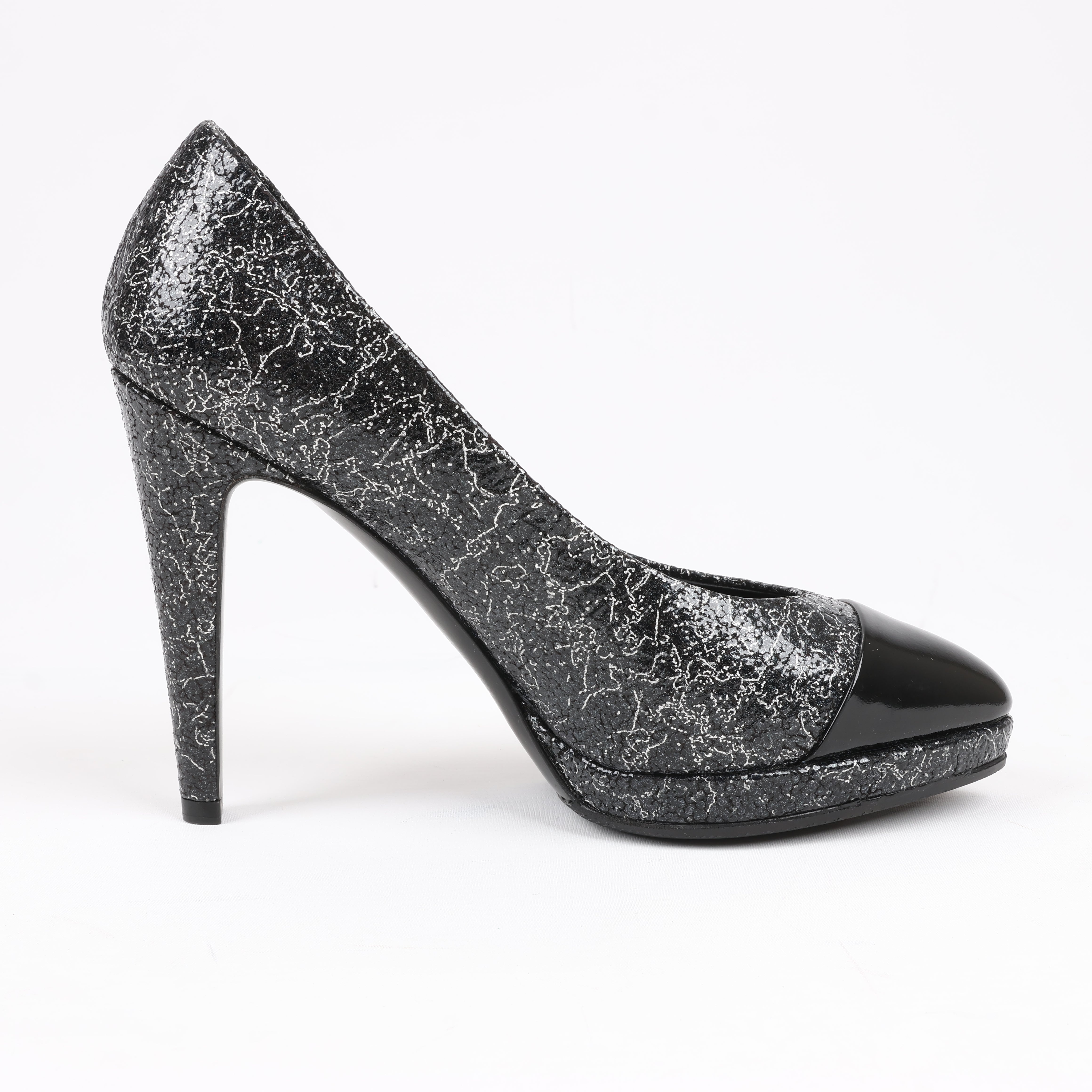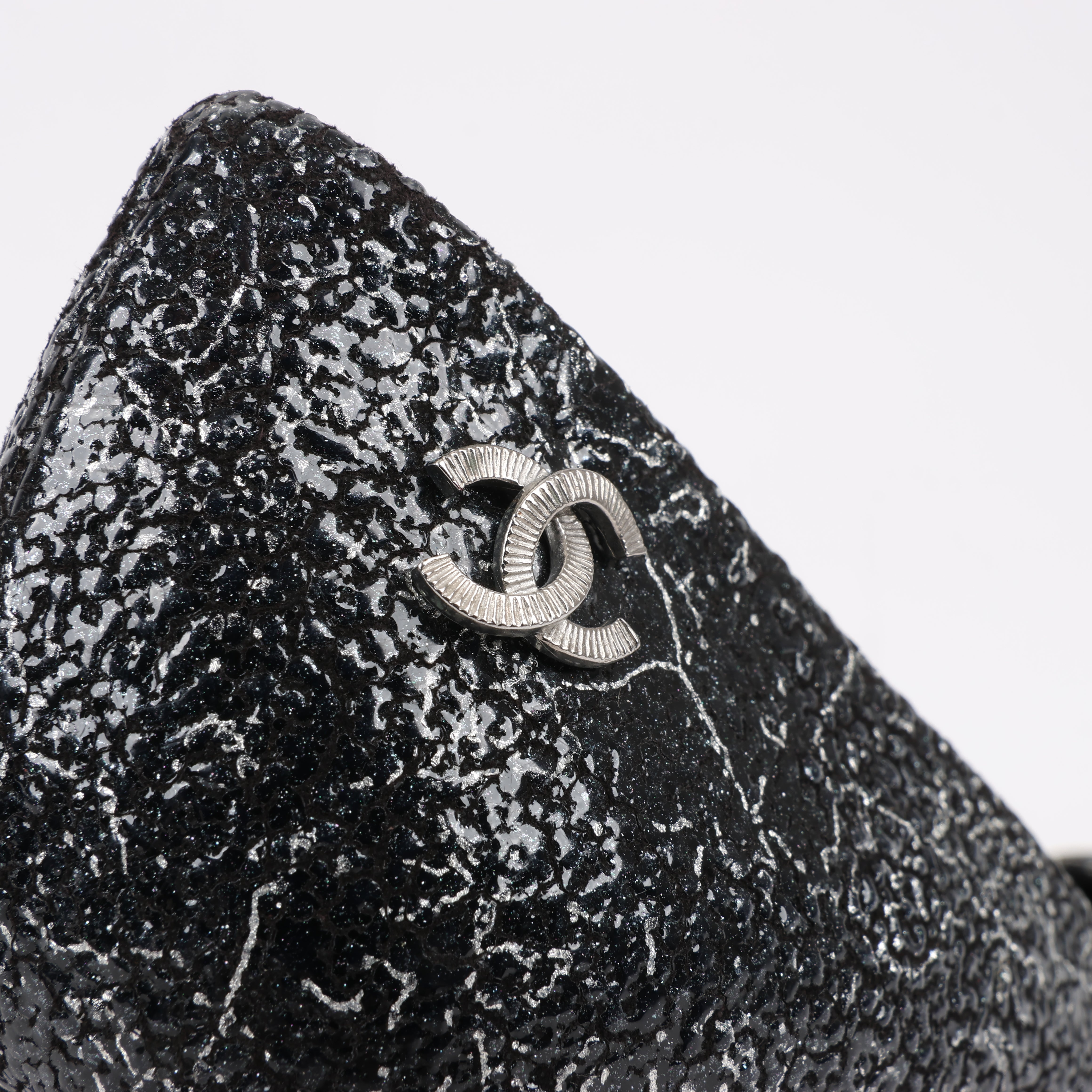 Chanel Coco Mark leather heels in black and silver, size 36 EU. Featuring a striking cracked metallic finish, signature cap toe, and elegant silhouette, these pumps exude timeless sophistication. A perfect blend of classic Chanel style and modern edge.