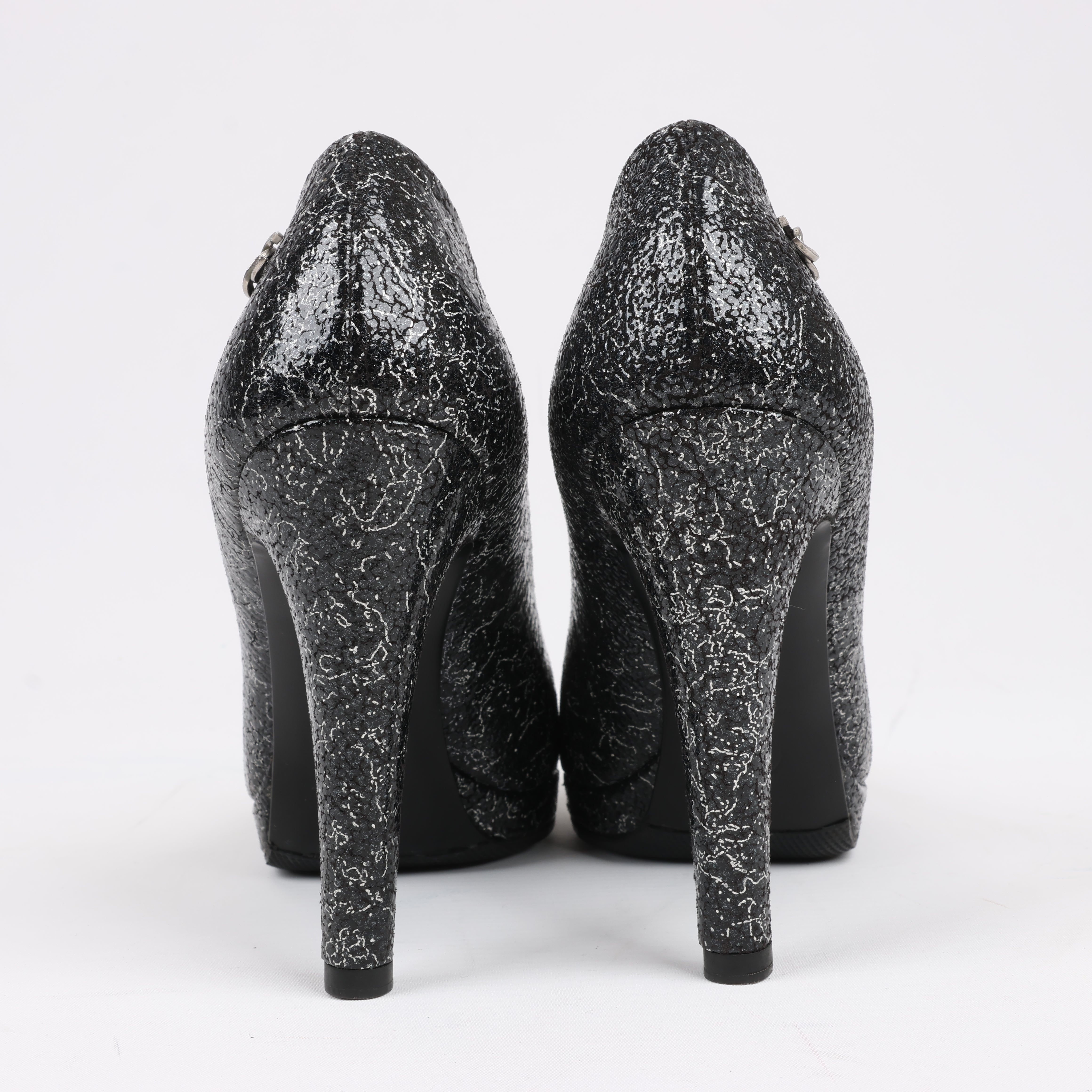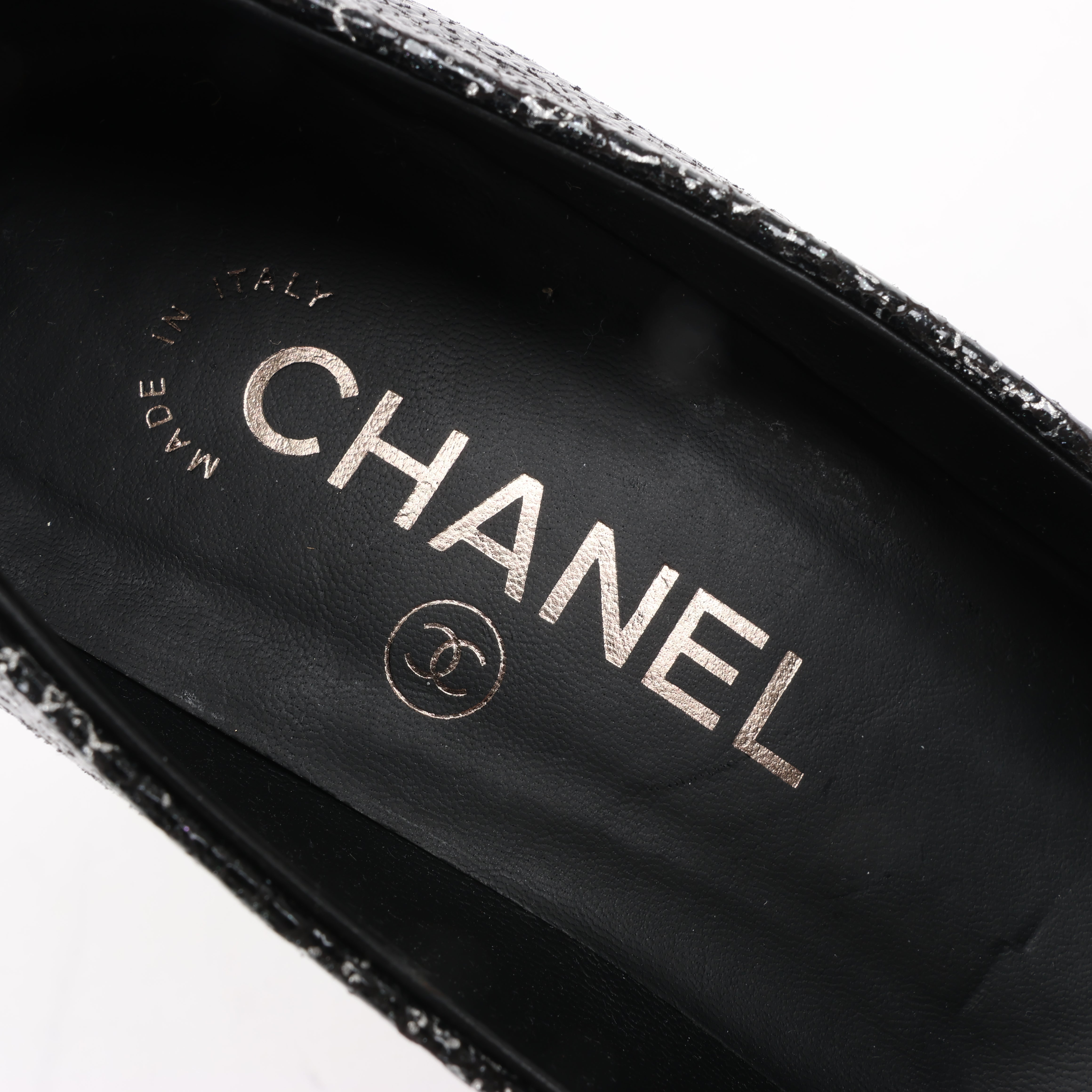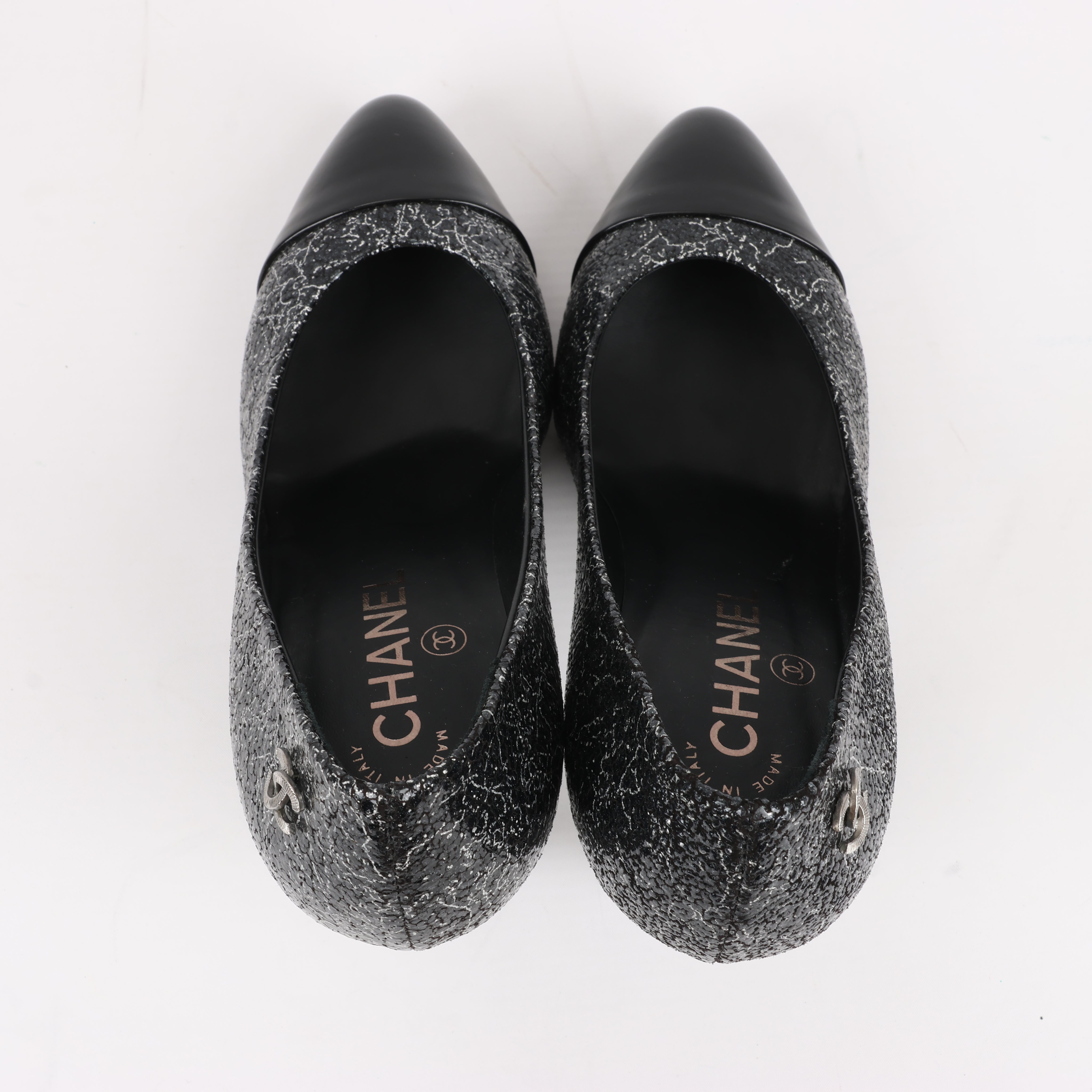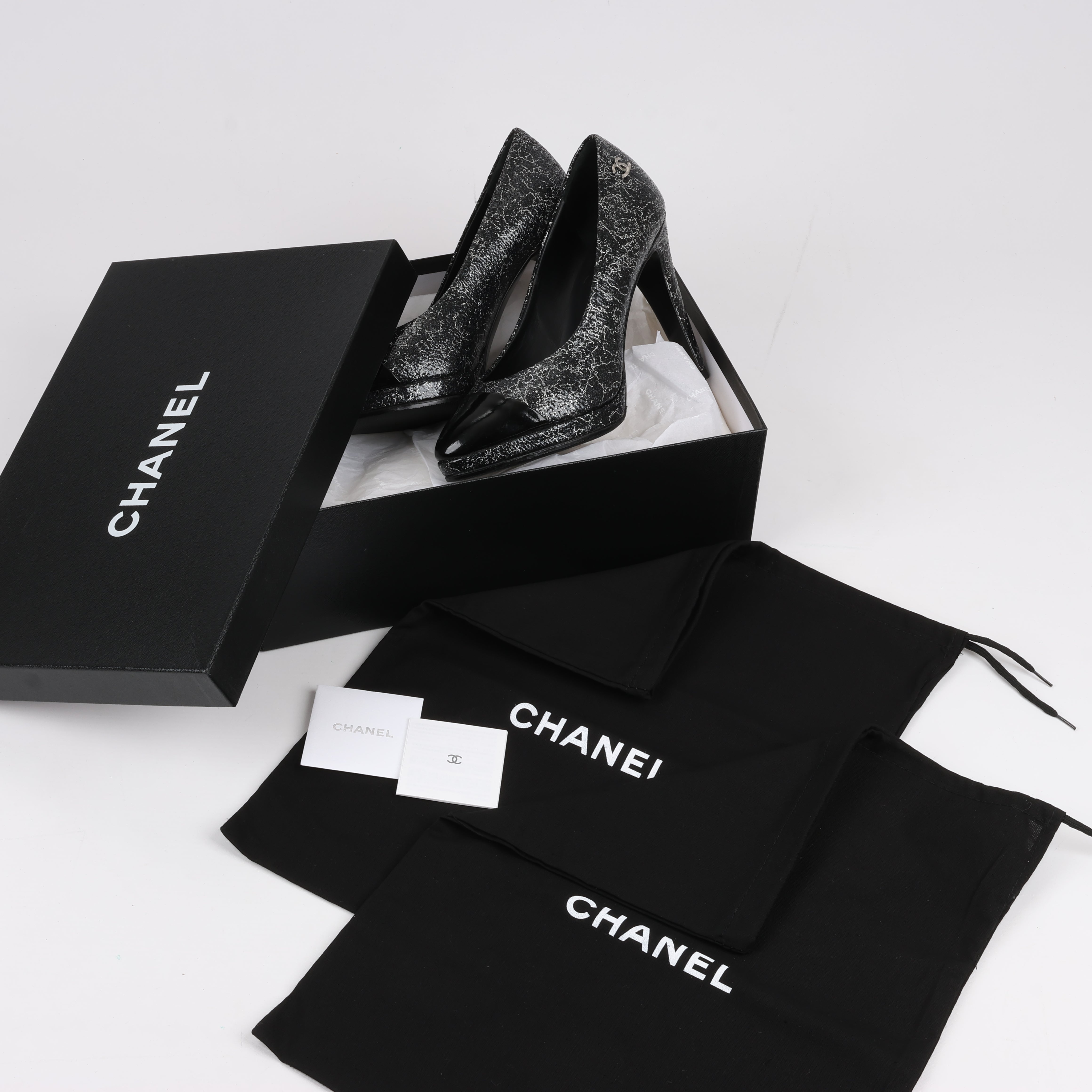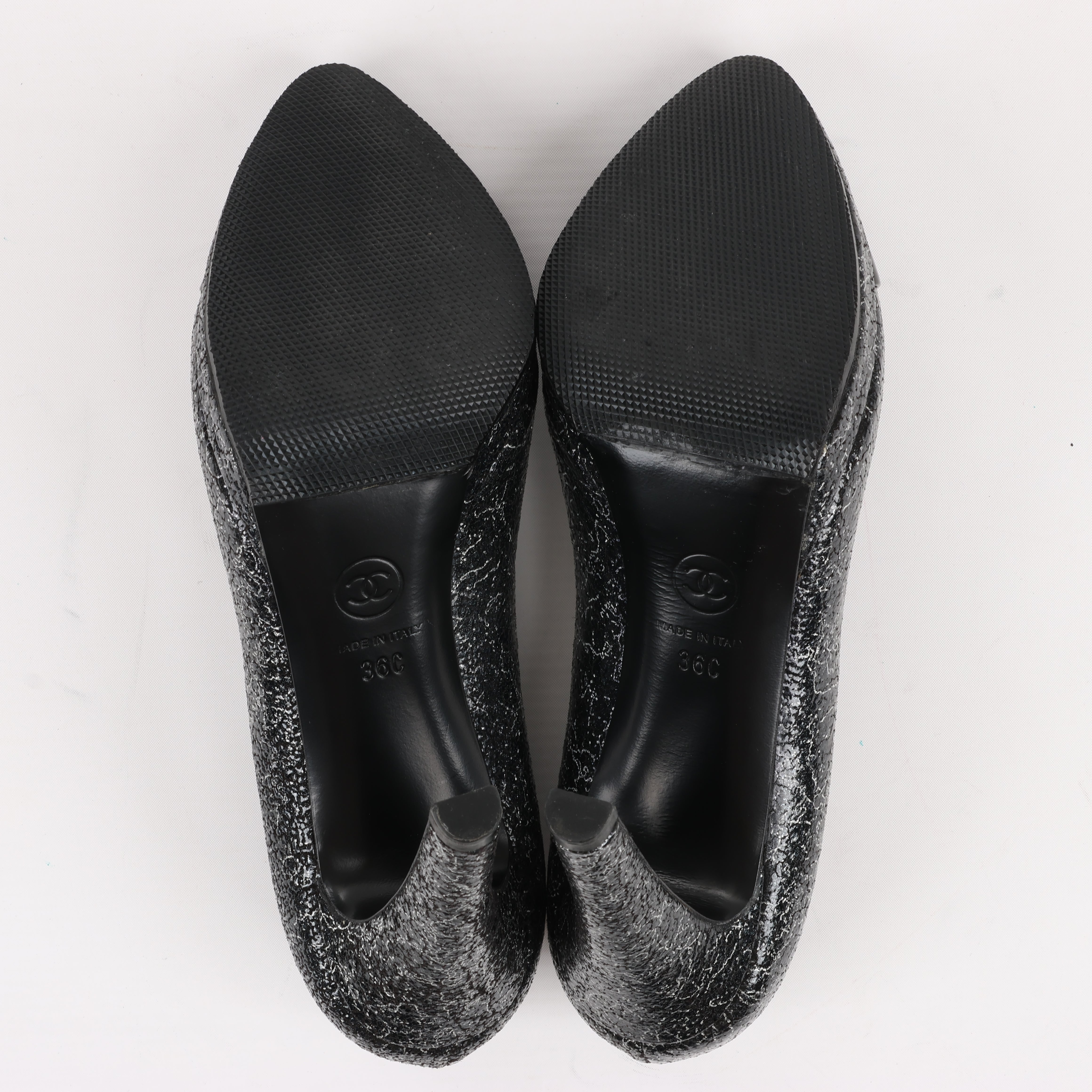 Chanel Coco Mark leather heels in black and silver, size 36 EU. Featuring a striking cracked metallic finish, signature cap toe, and elegant silhouette, these pumps exude timeless sophistication. A perfect blend of classic Chanel style and modern edge.