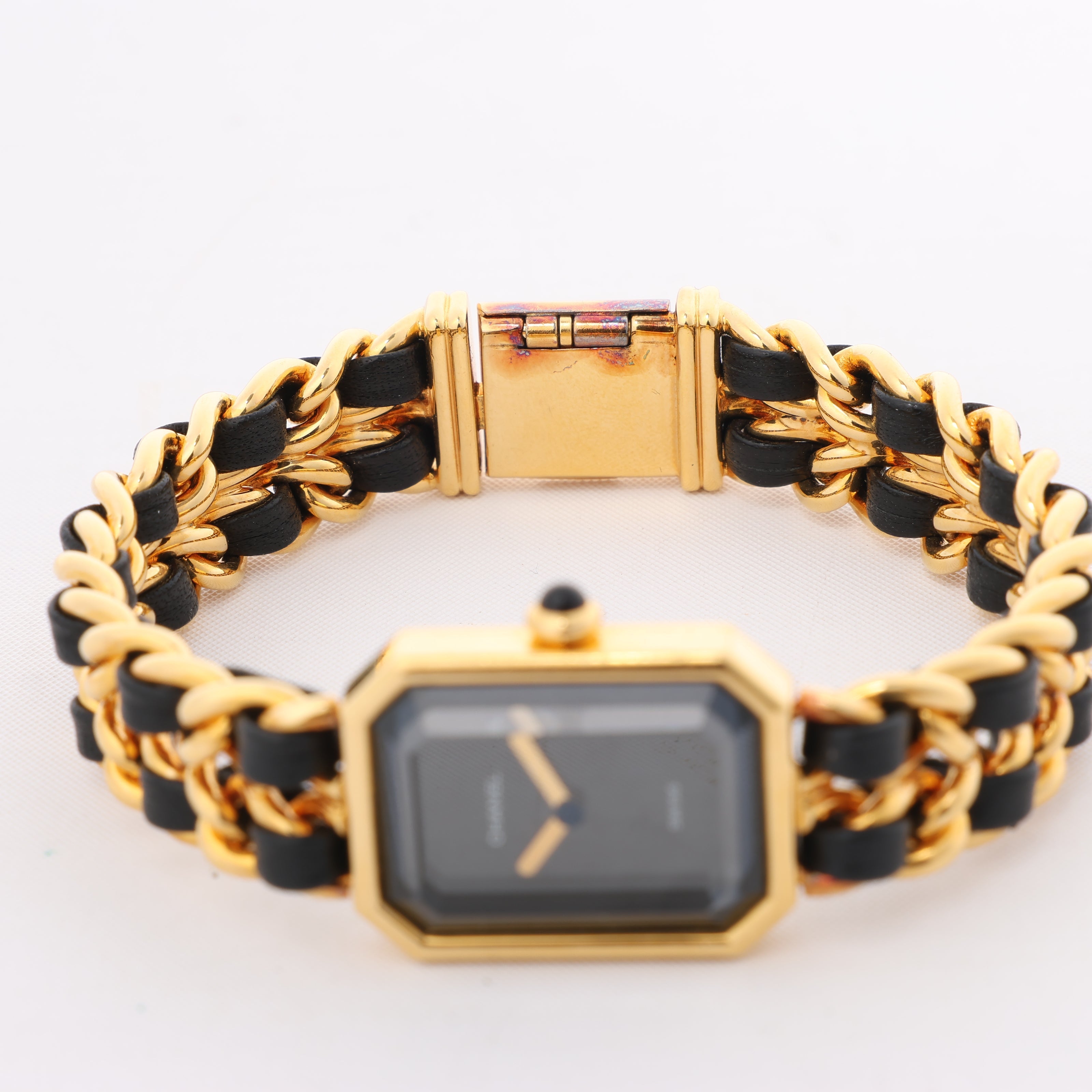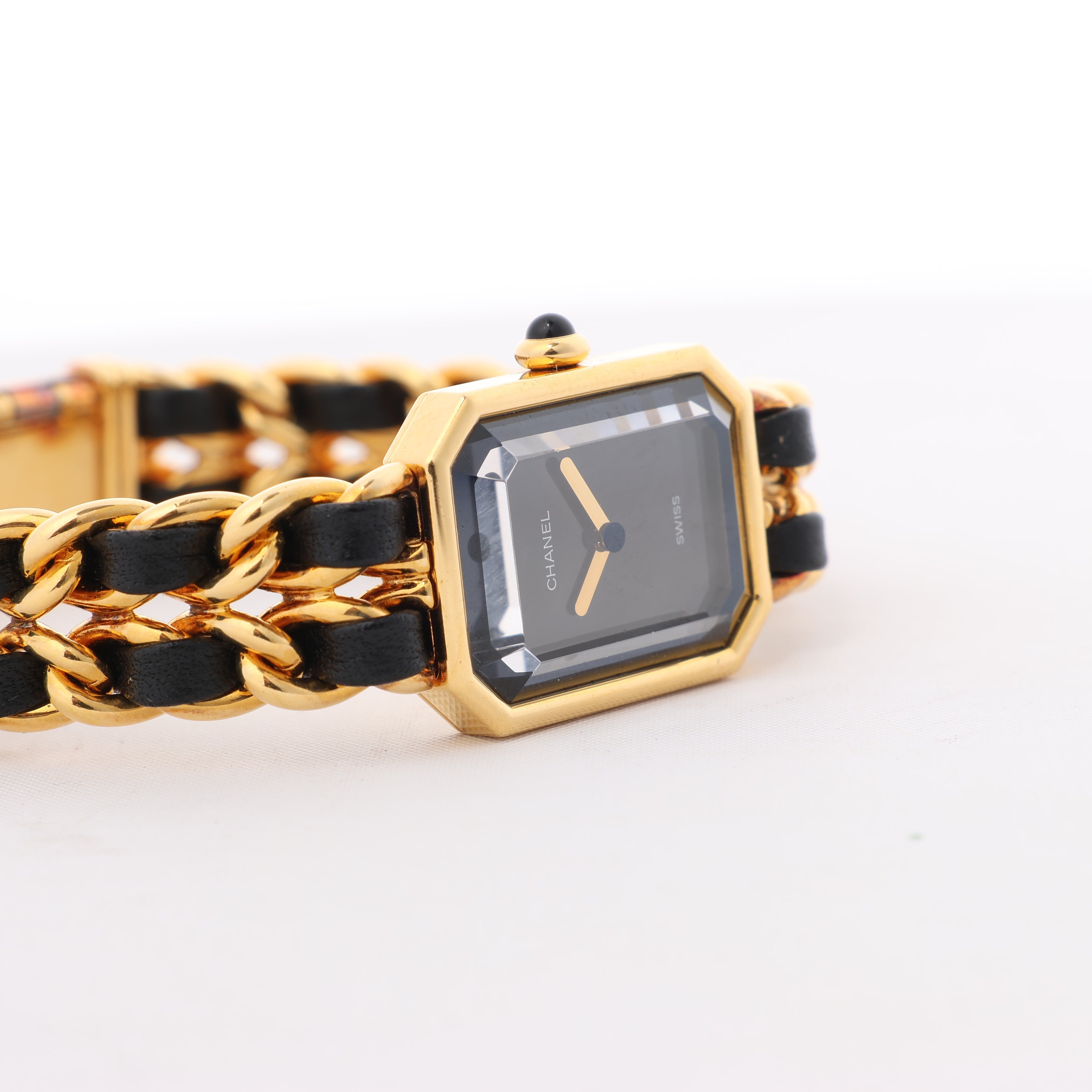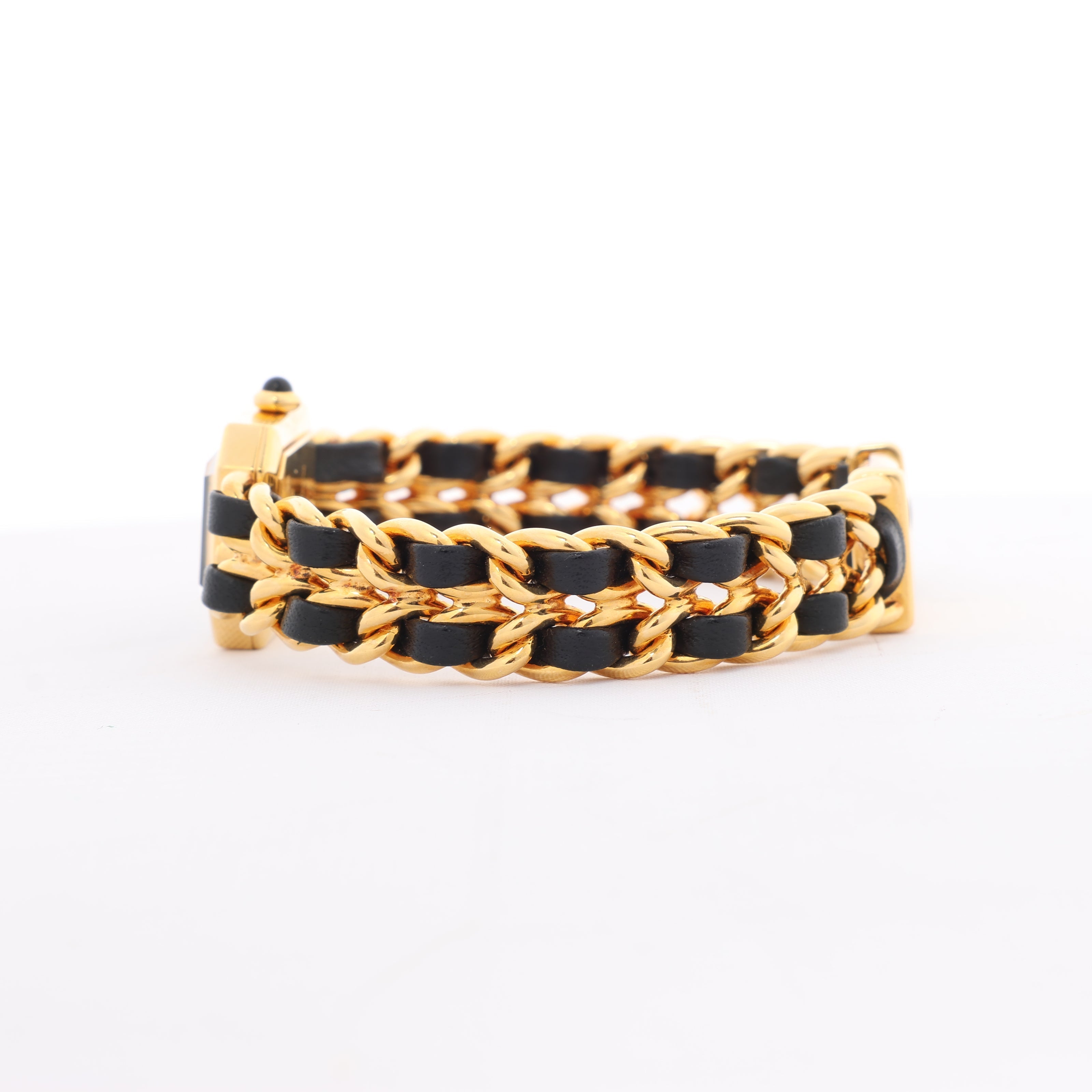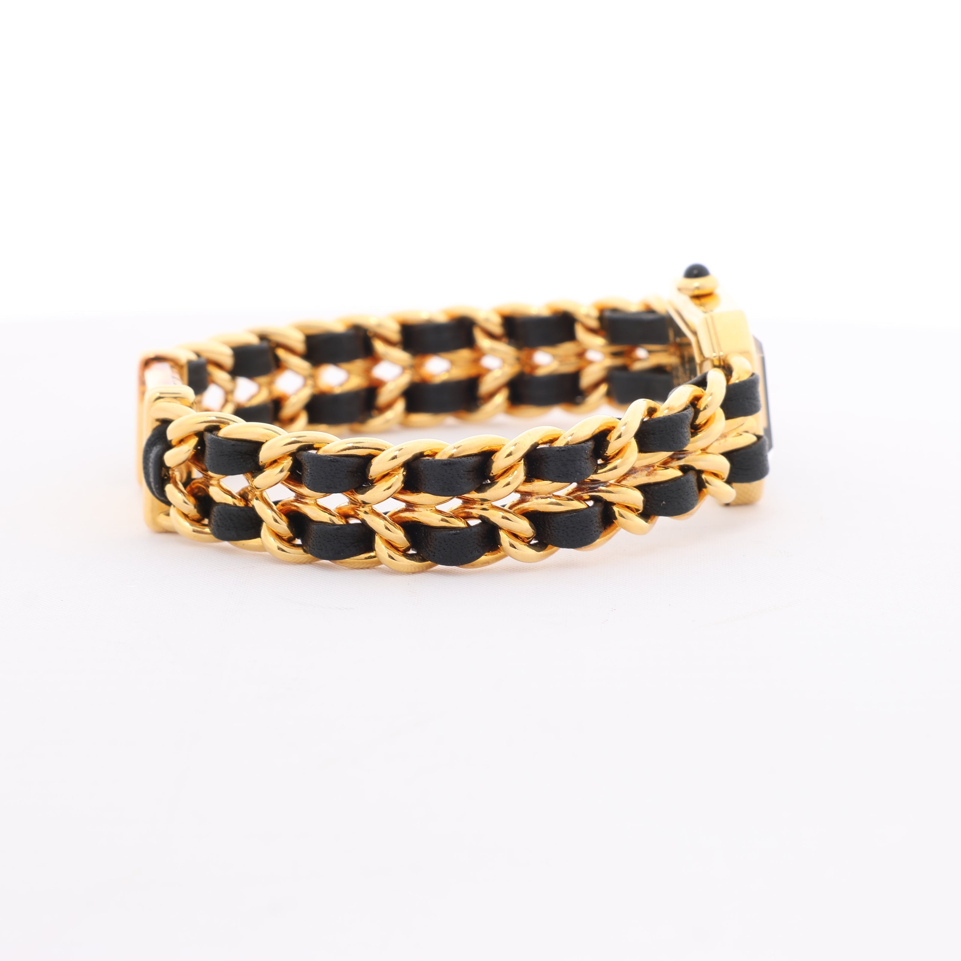 Brand: Chanel Model: Premiere XLReference: H0001Condition: ExcellentCondition Details: Light signs of use, including subtle surface marks barely visible to the eye. Minor surface discoloration on the clasp. Please see photos for the exact condition.Dial Colour: BlackCase Material: Gold PlatedStarp Colour: Gold, BlackStrap material: Gold Plated, LeatherMovement: QuartzFace Diameter: 26 x 20 mm Approx. max circumference: 17 cmComes With: Case, Warranty card, Service card