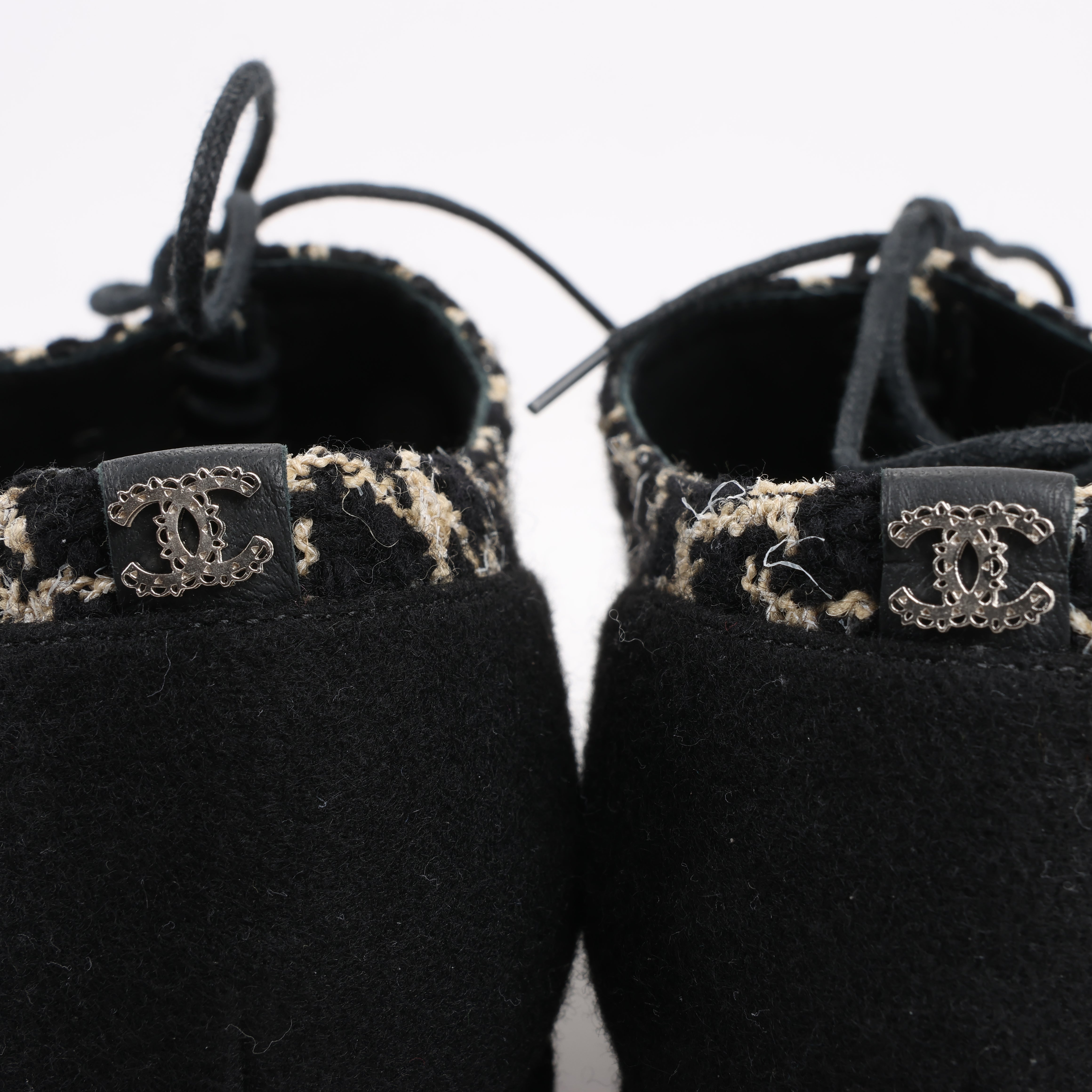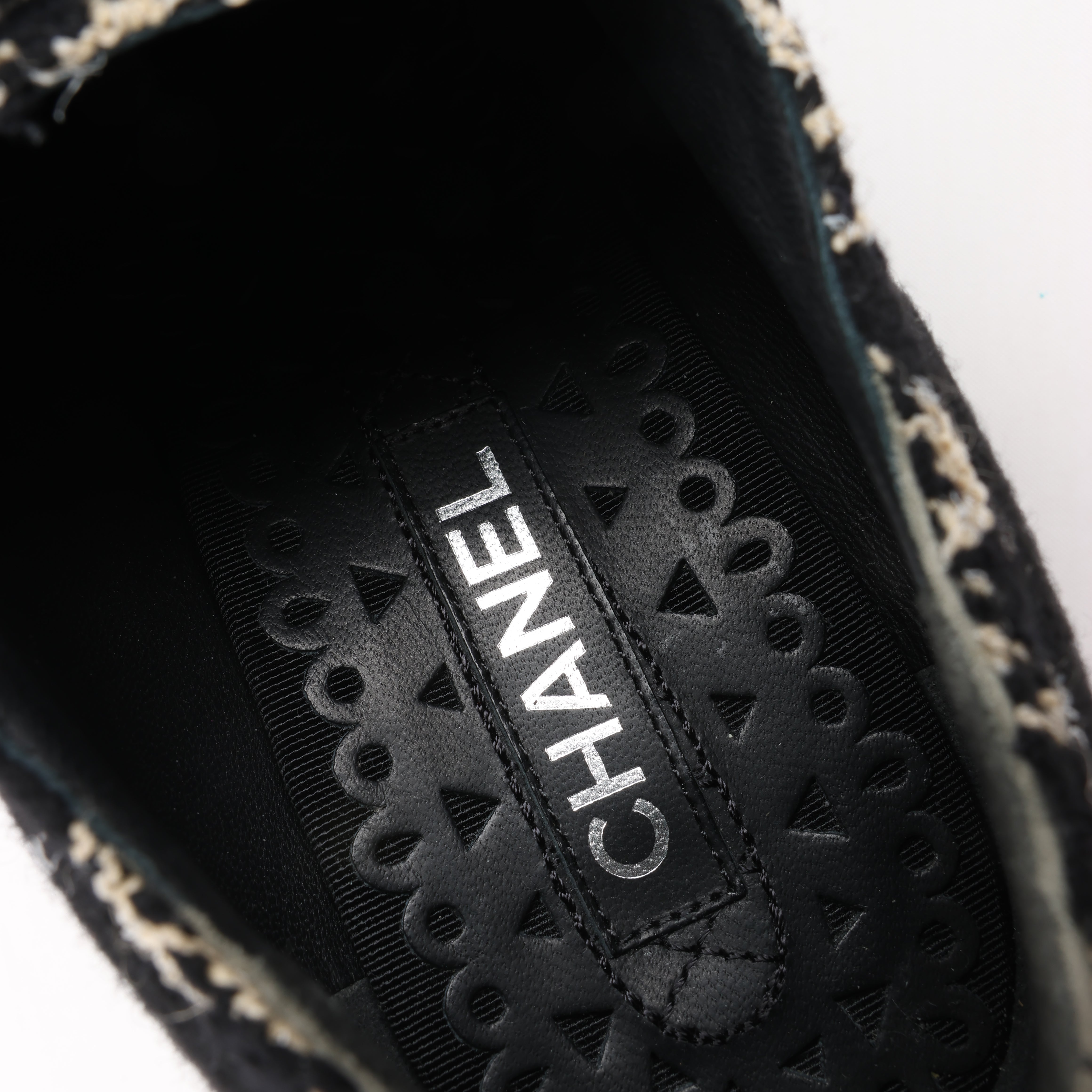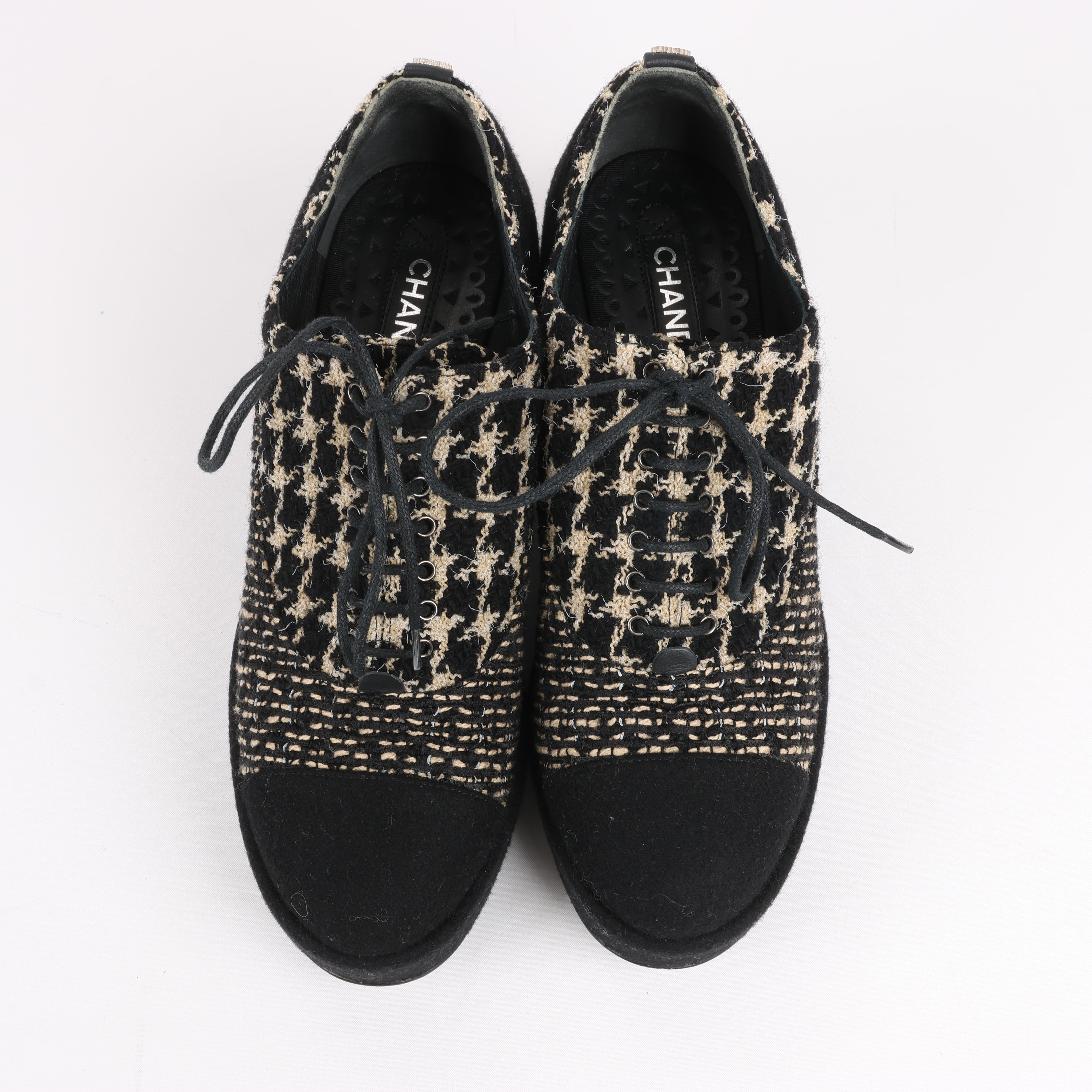 Elevate your style with these CHANEL Coco Tweed Felt Mark Boots. Crafted in black and beige tweed with luxurious fabric and leather details, these lace-up platform shoes exude timeless elegance. A bold yet sophisticated statement for any fashion-forward wardrobe. Size 37 EU.