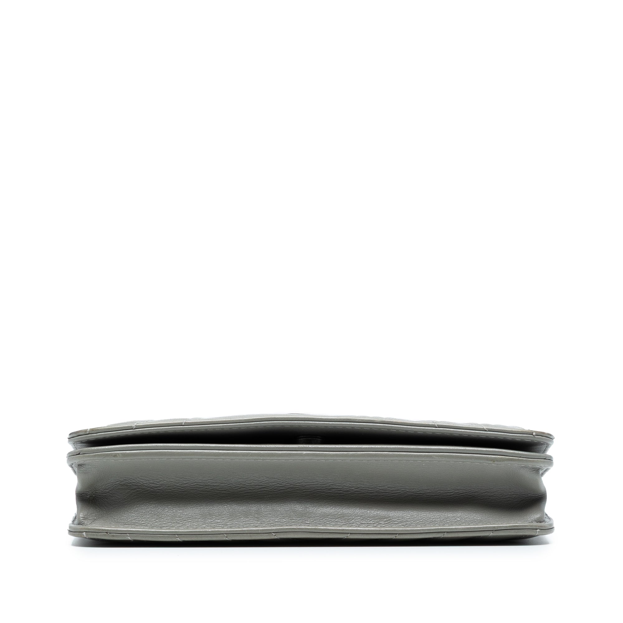 This wallet on chain features a quilted calf leather body, a silver-tone leather-woven chain link strap, a tassel detail, a front flap with magnetic snap closure, and interior zip and slip pockets. Retail Price: 3350.00