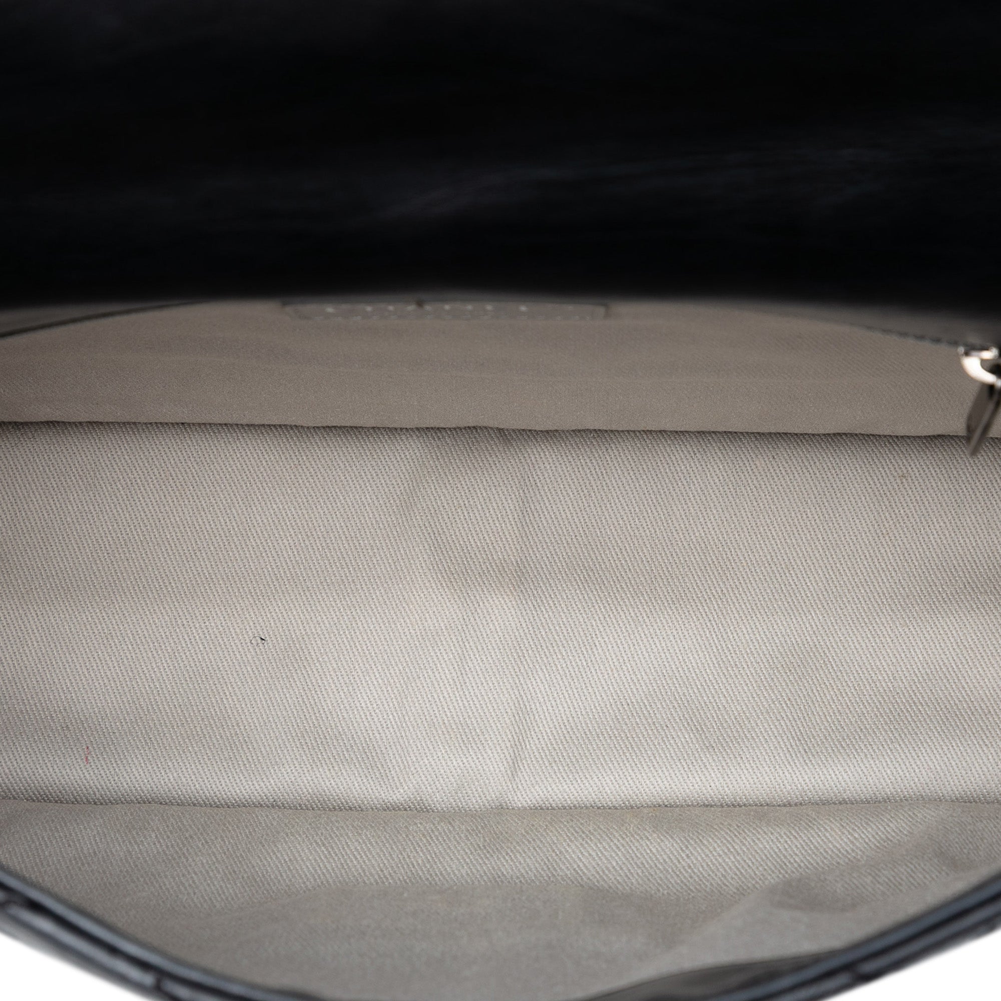 This shoulder bag features an aged calfskin leather body, leather woven chain straps with shoulder guard, a front flap with twist lock closure, and an interior zip pocket. Retail Price: 6500.00