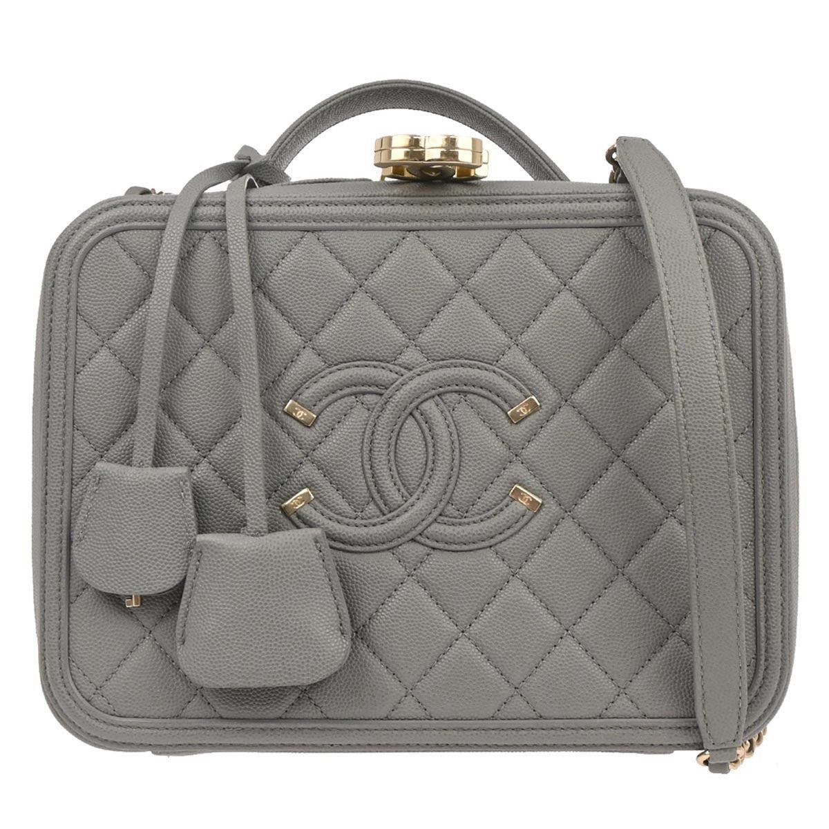 Brand : Chanel Model : Filigree vanity case Style : Quilted caviar Dimensions (W x H x D) : 24cm x 18cm x 10cm Serial number : 291***** Inclusions : Padlock,padlock cover,key,key cover,serial sticker,authenticity card,metal mirror