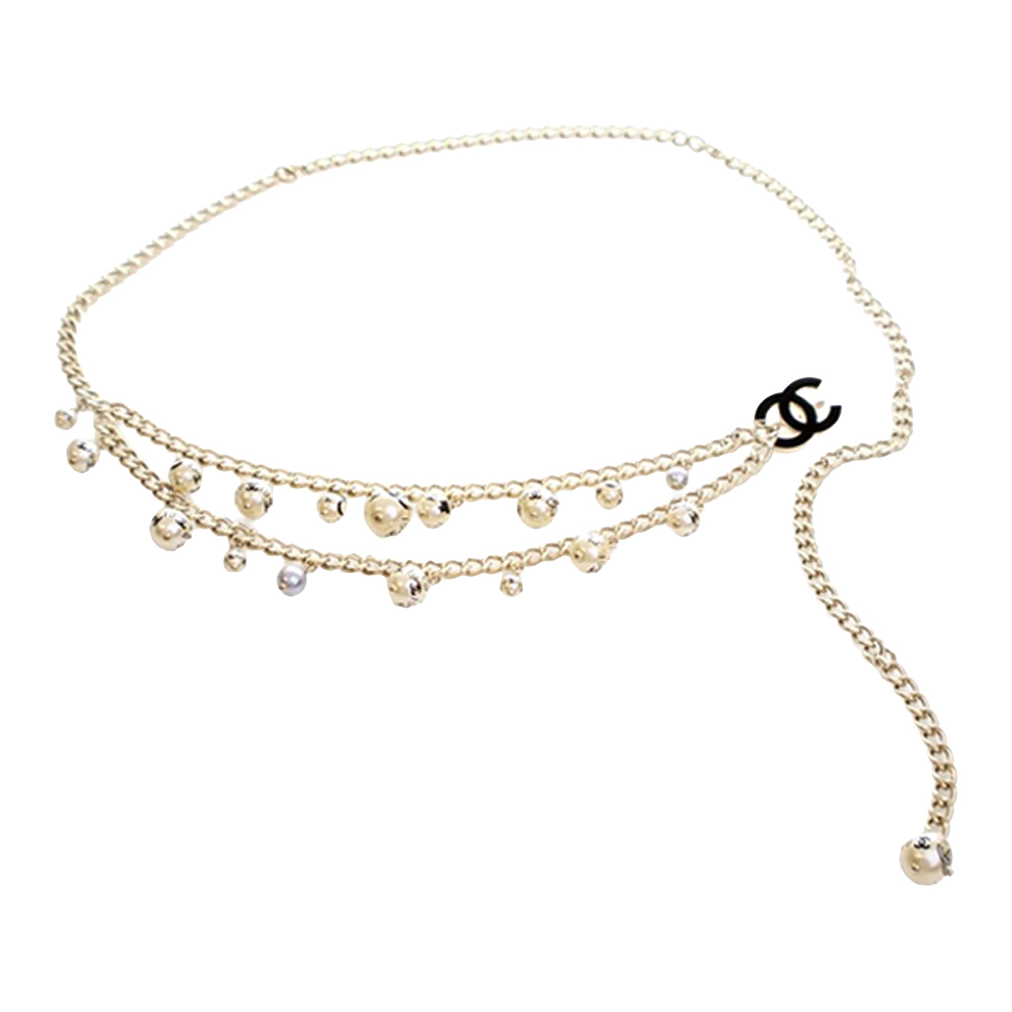 This belt features a gold-plated body with faux pearls embellishments, a CC logo, and a hook closure. Inclusion: box. Retail Price: 1852.00