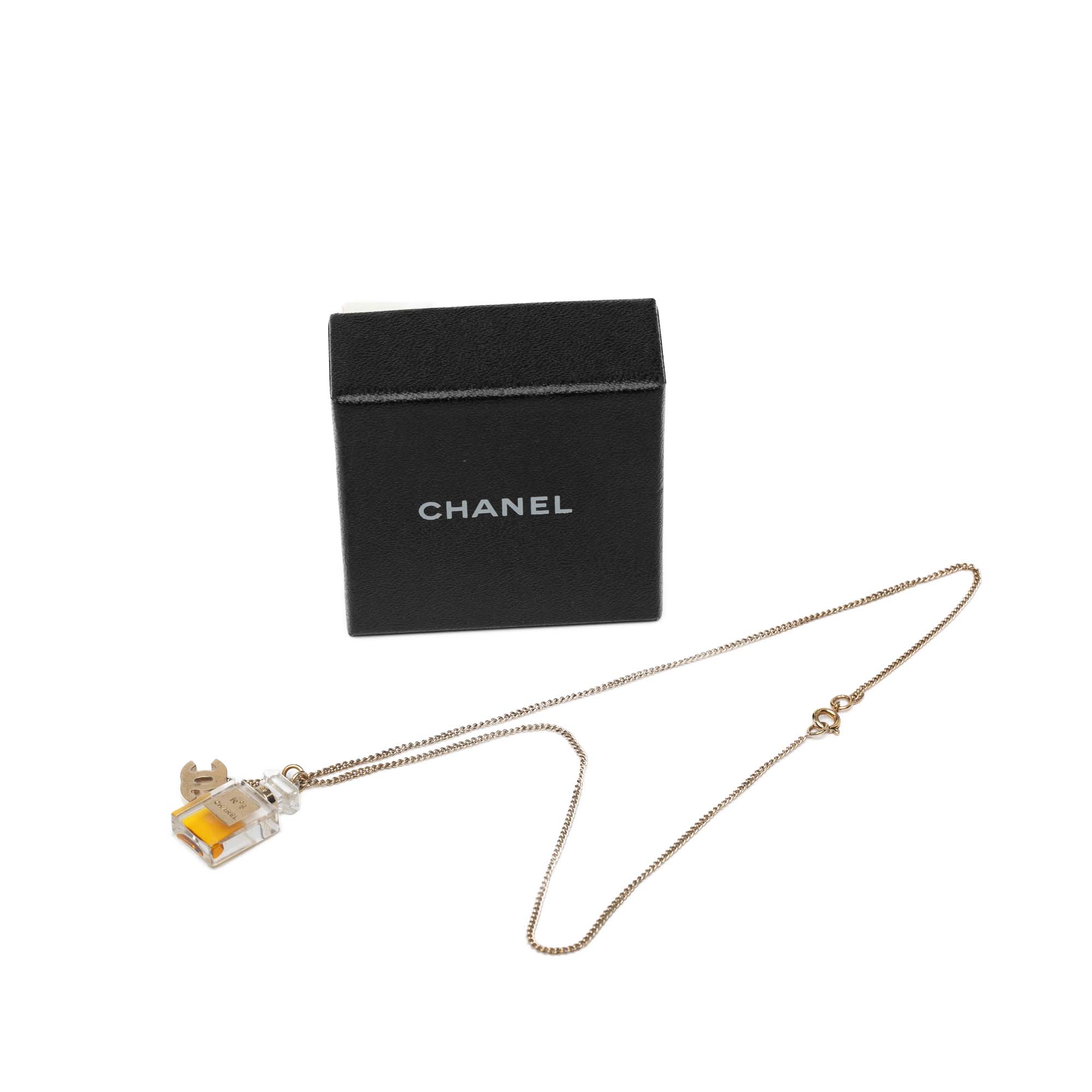 This necklace features a gold-tone chain, a resin fragrance bottle charm and a gold-tone CC logo pendant, and a spring ring closure. Inclusion: box. Retail Price: 650.00