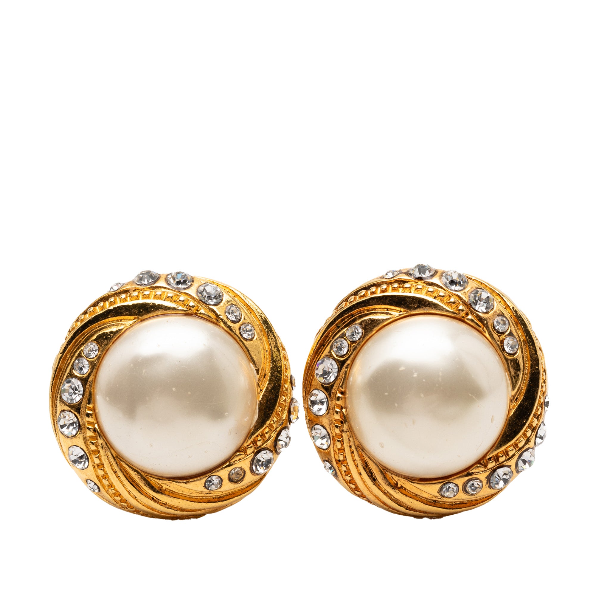 Chanel Gold Plated Faux Pearl Swirl Crystal Clip On Earrings