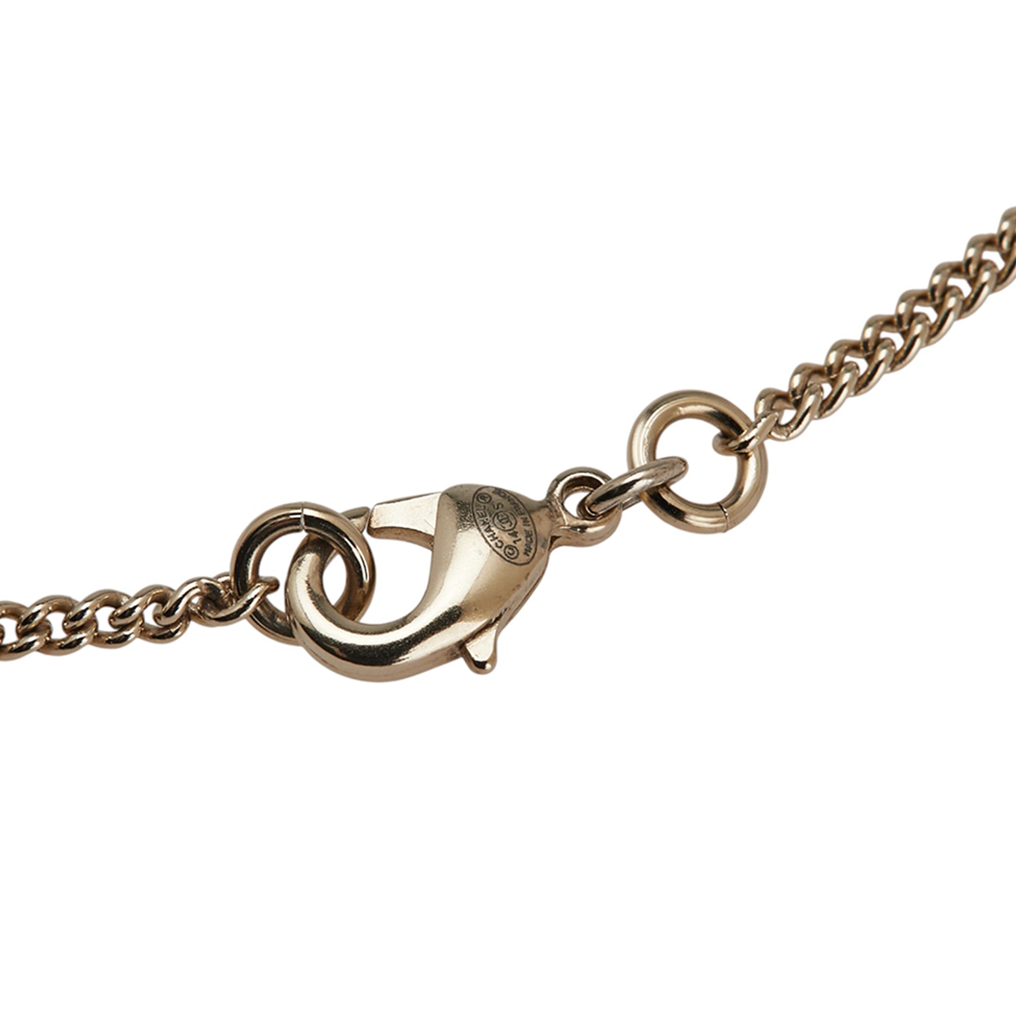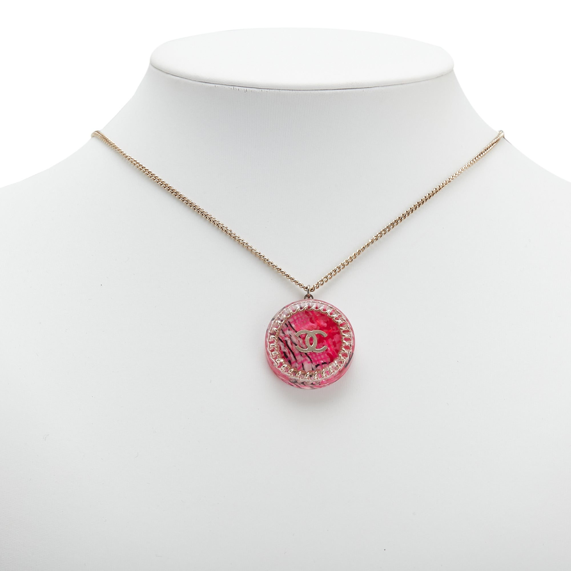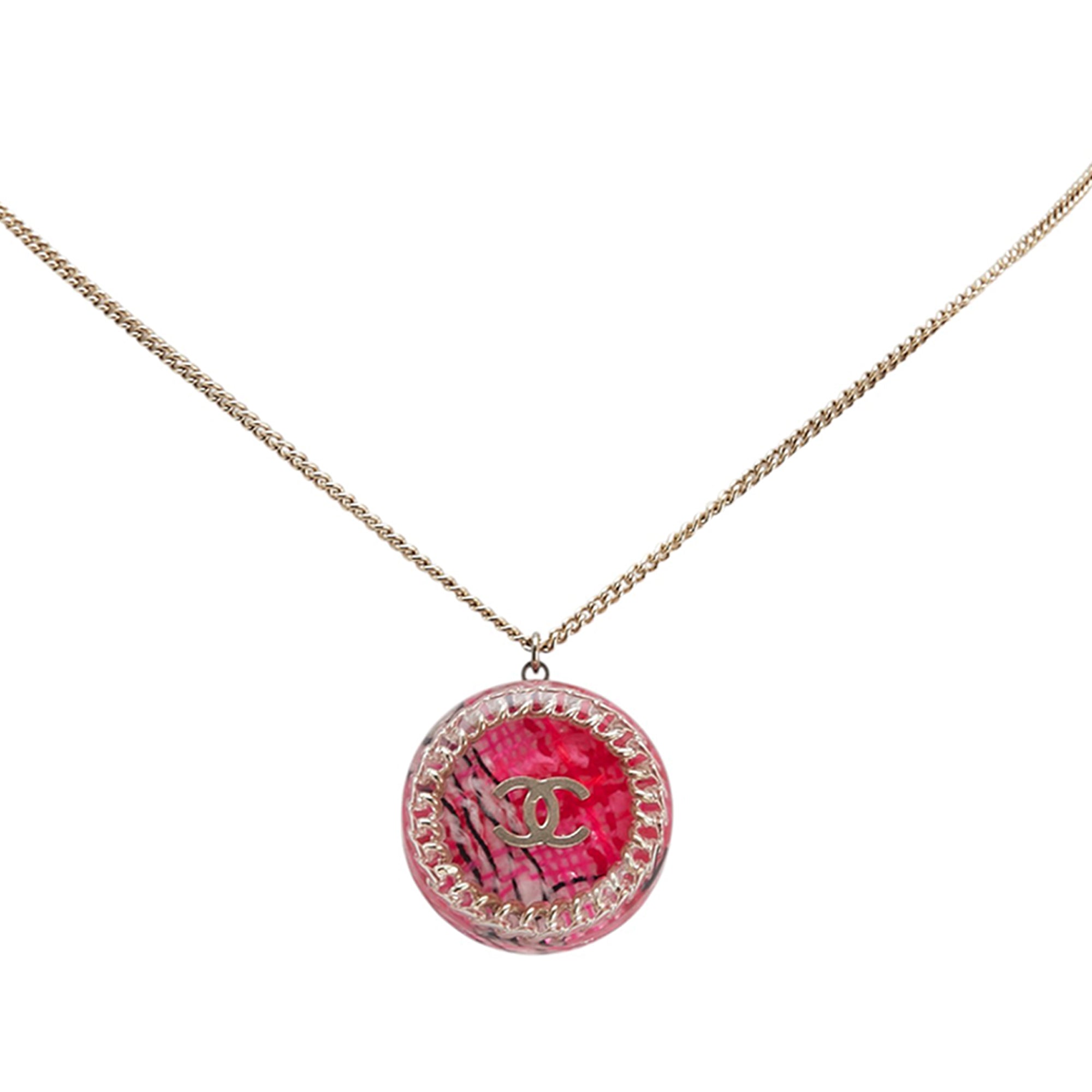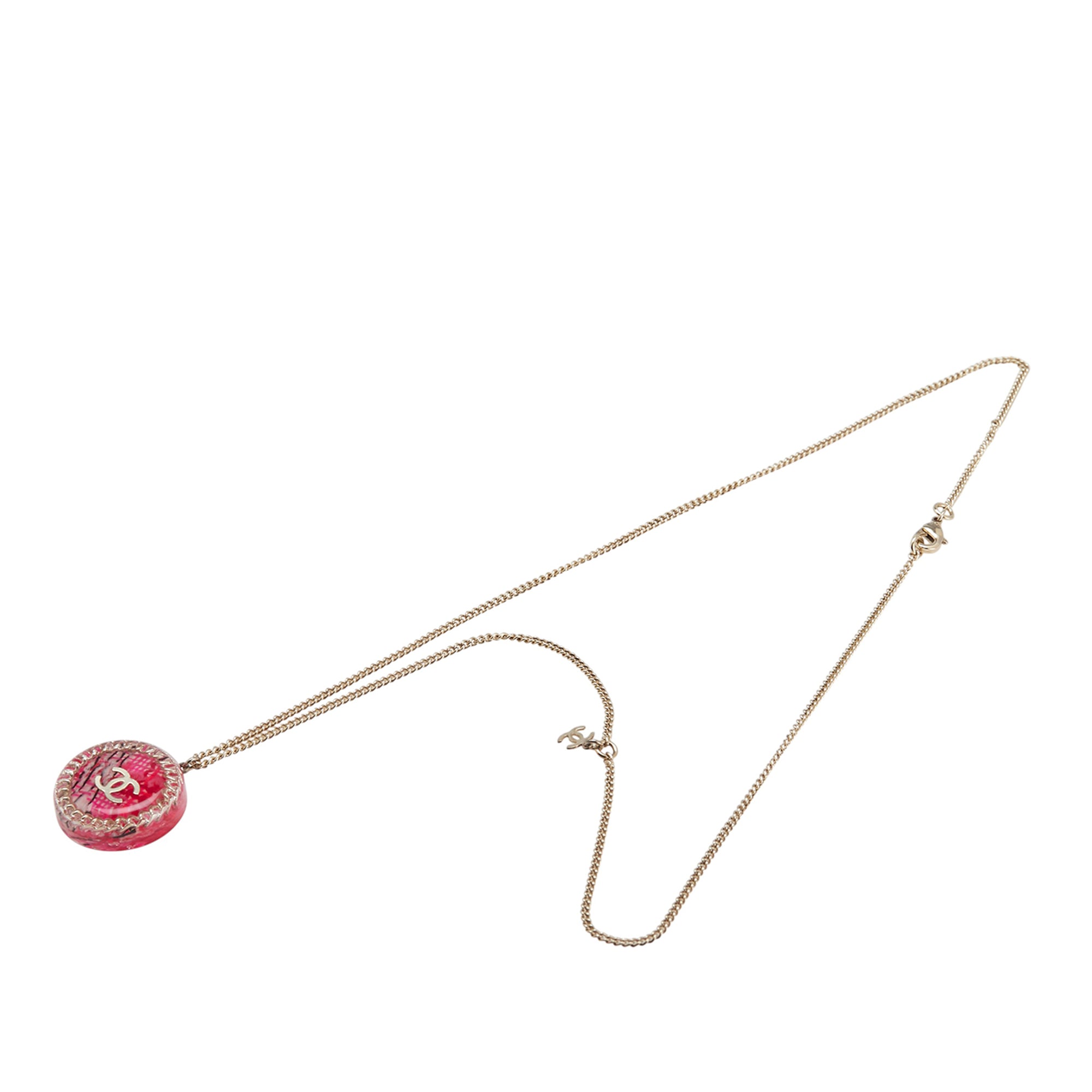 This necklace features a gold-plated metal body, a round resin pendant with CC logo details, and a lobster clasp closure. Retail Price: 750.00
