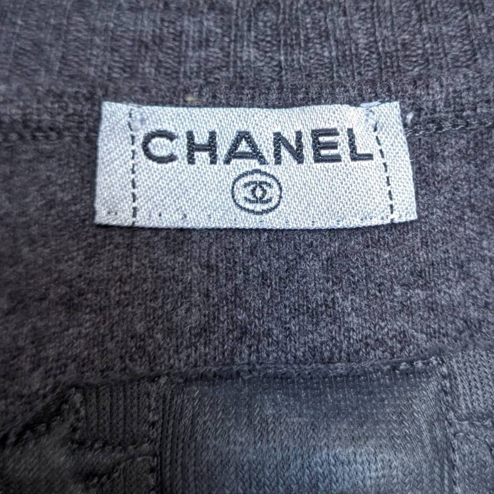 Chanel 2010s grey wool top with embossed motif. Ribbed crewneck, cap short sleeves, tone-on-tone trompe-l'oeil necklace motif with padding, elasticated waist and ruffled hem.