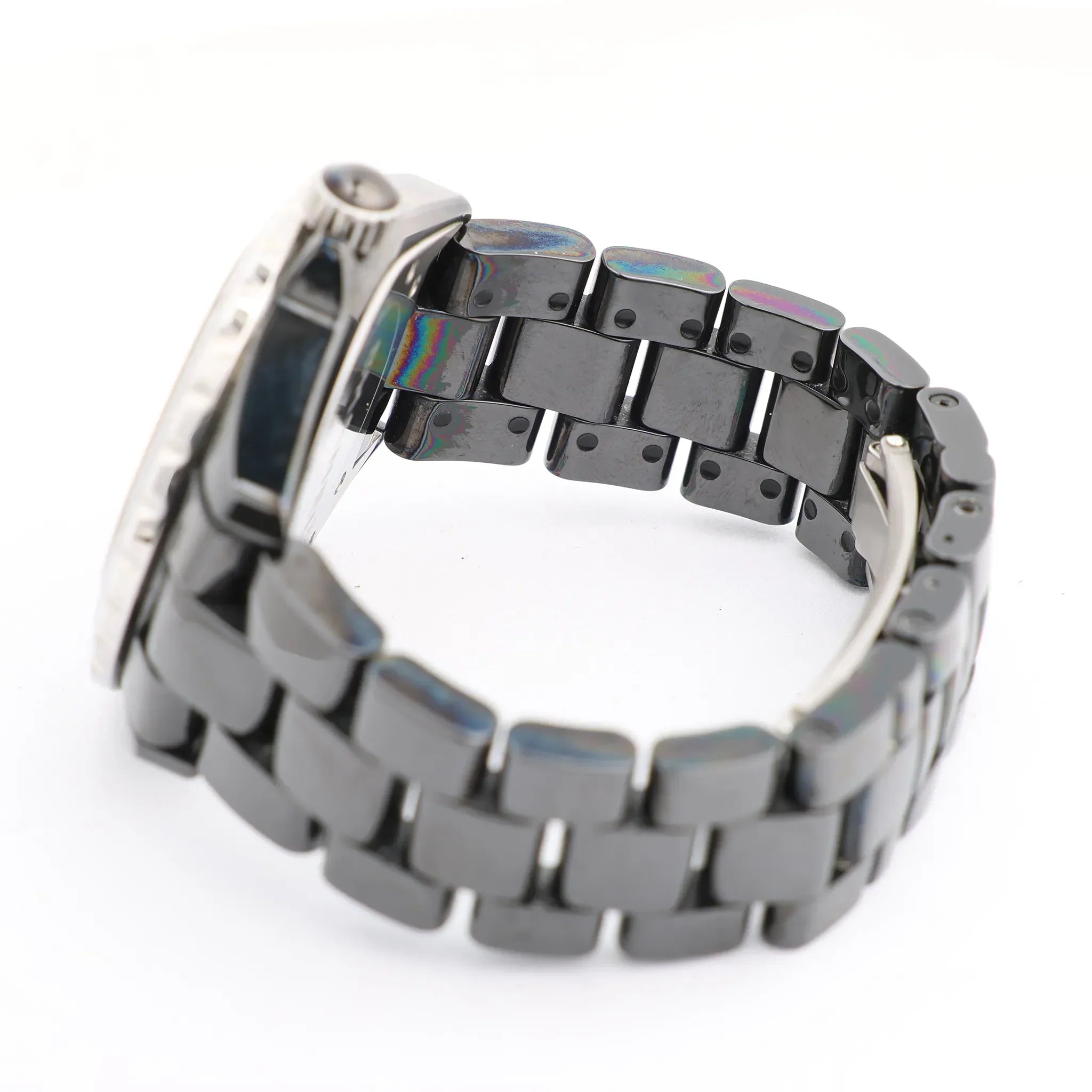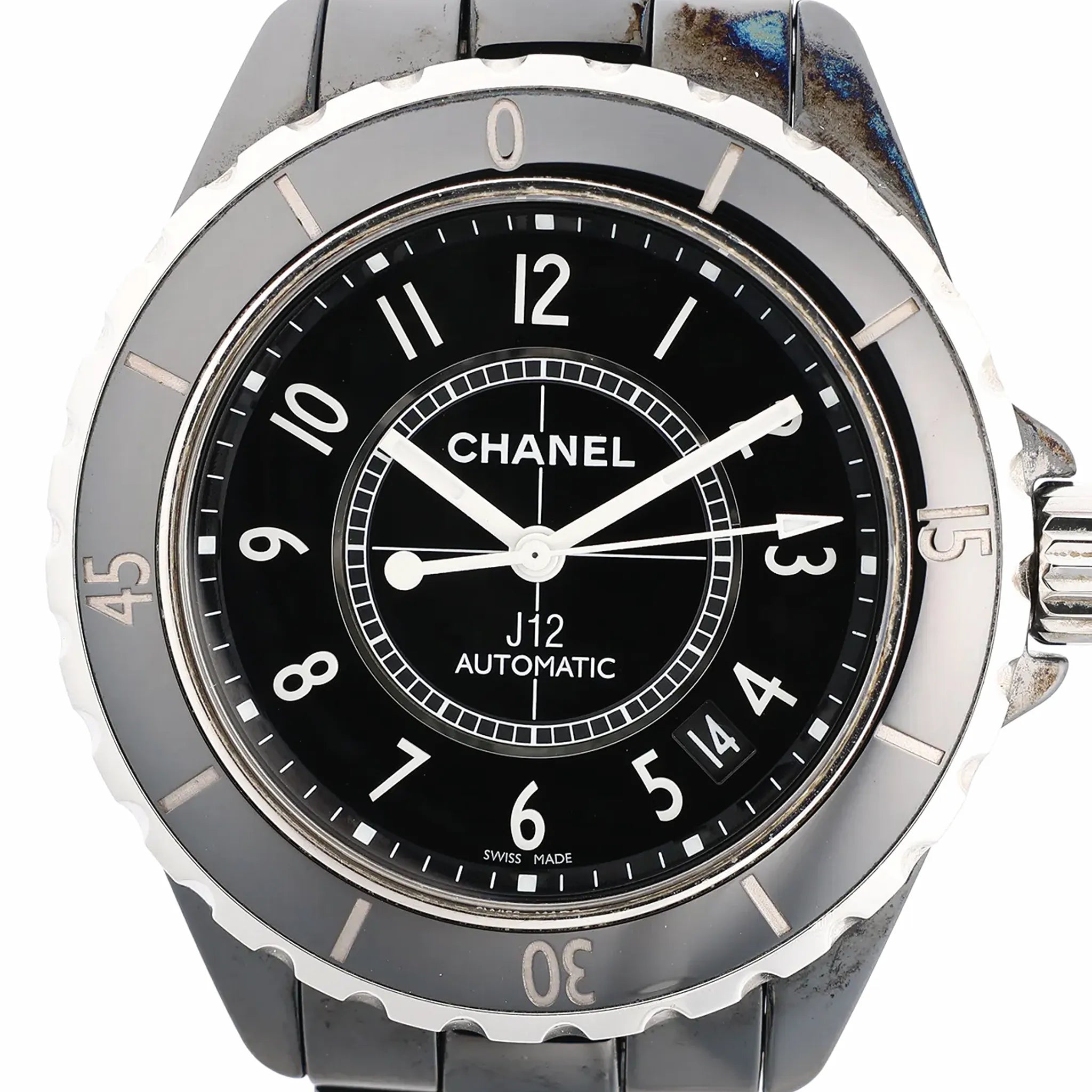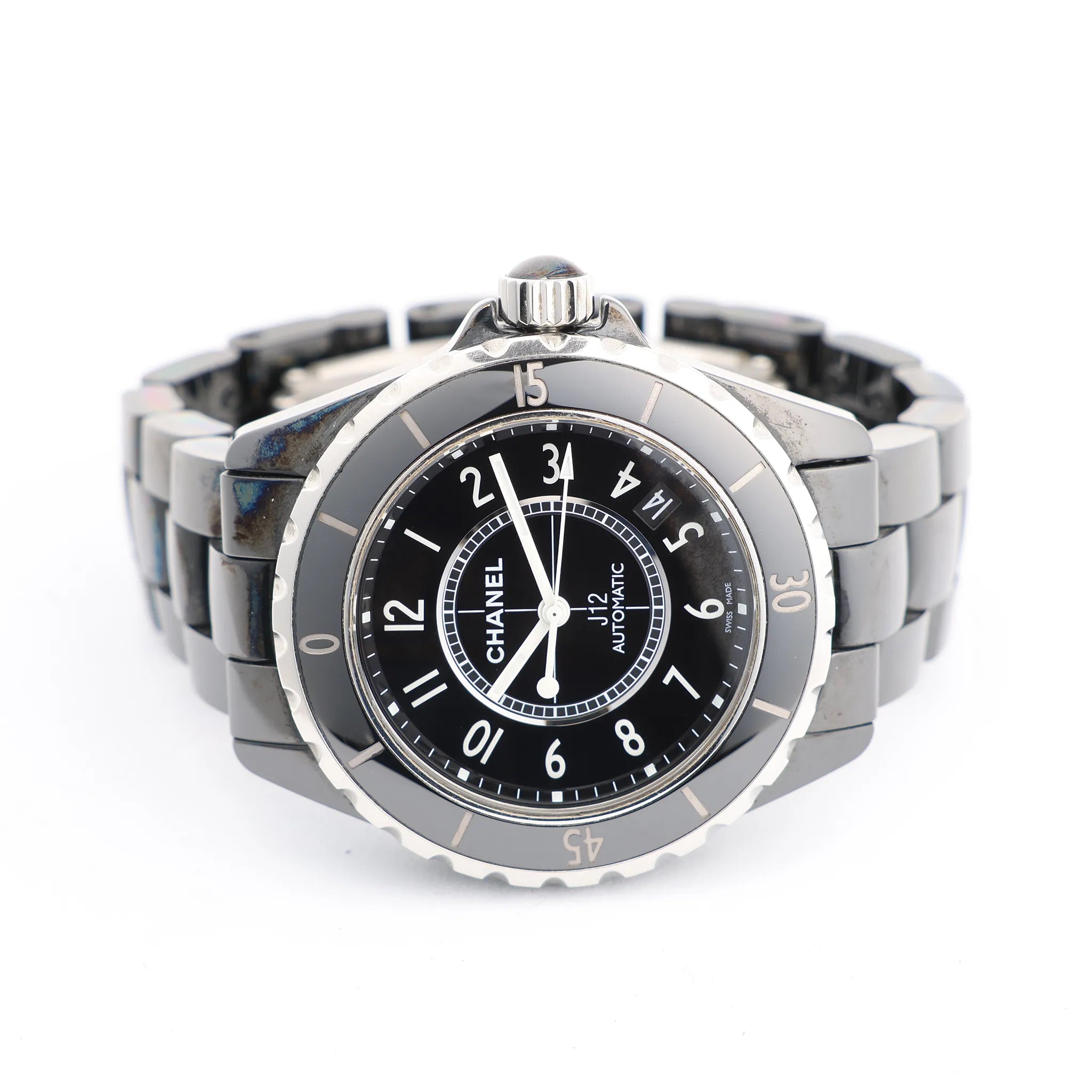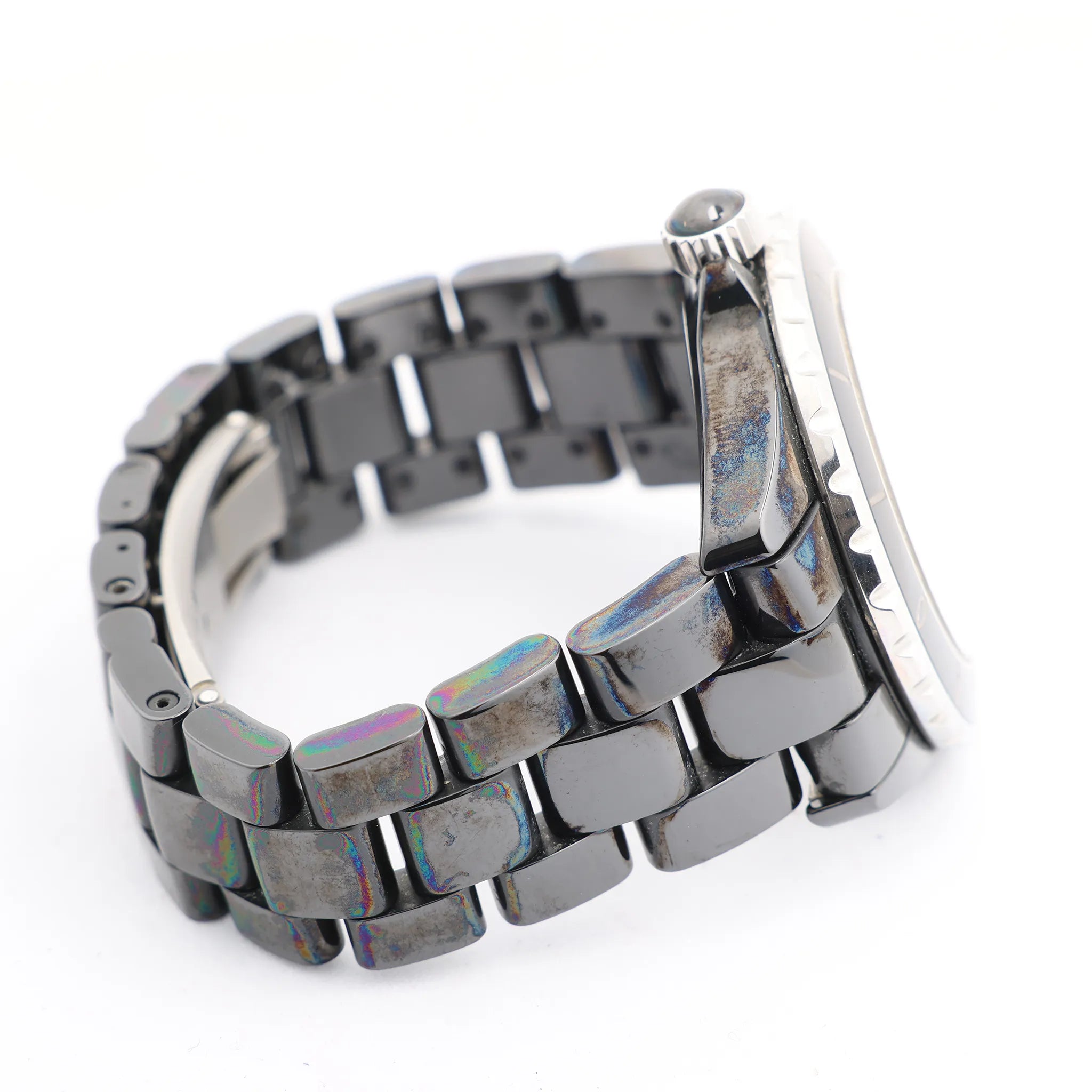 Brand: Chanel Model: J12Reference: H1009Serial No.: D.M.C.66835Condition: Very goodCondition Details: Some signs of use, such as surface marks and light abrasions. The colorful stains are oxidation. Overall in good condition - see photos for exact appearance.Dial Colour: BlackCase Material: Ceramic, Stainless steelStarp Colour: BlackStrap material: Ceramic, Stainless steelMovement: AutomaticFace Diameter: 39 mmApprox. max circumference: 18 cmComes With: Box, Brand Booklet, Extra links, paper, Service card