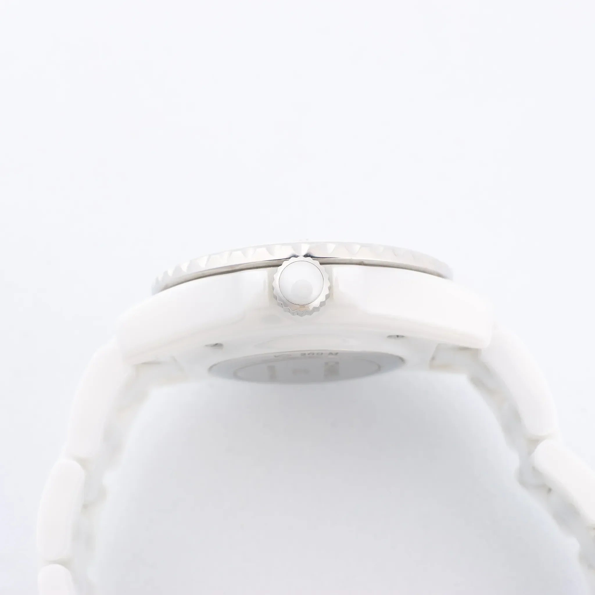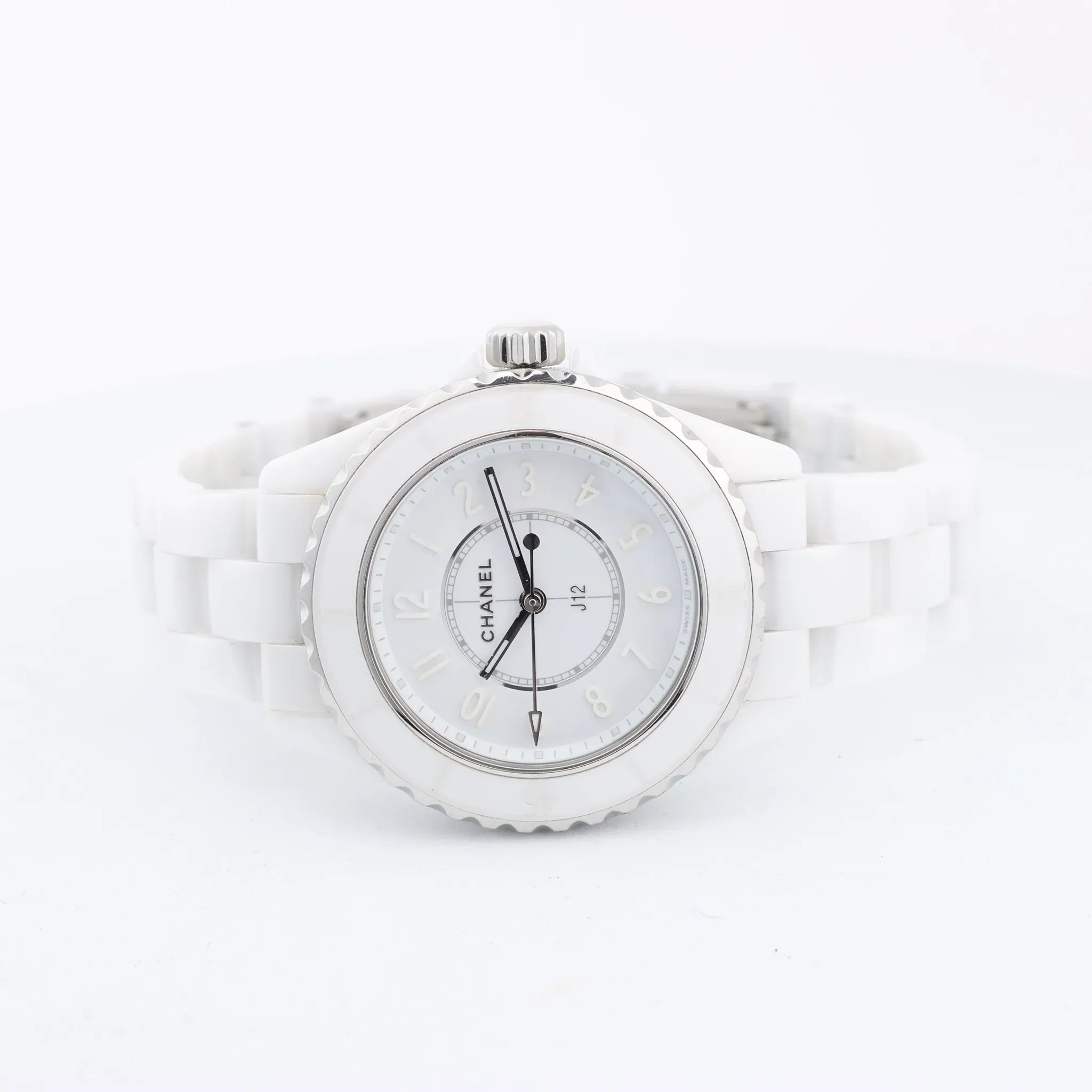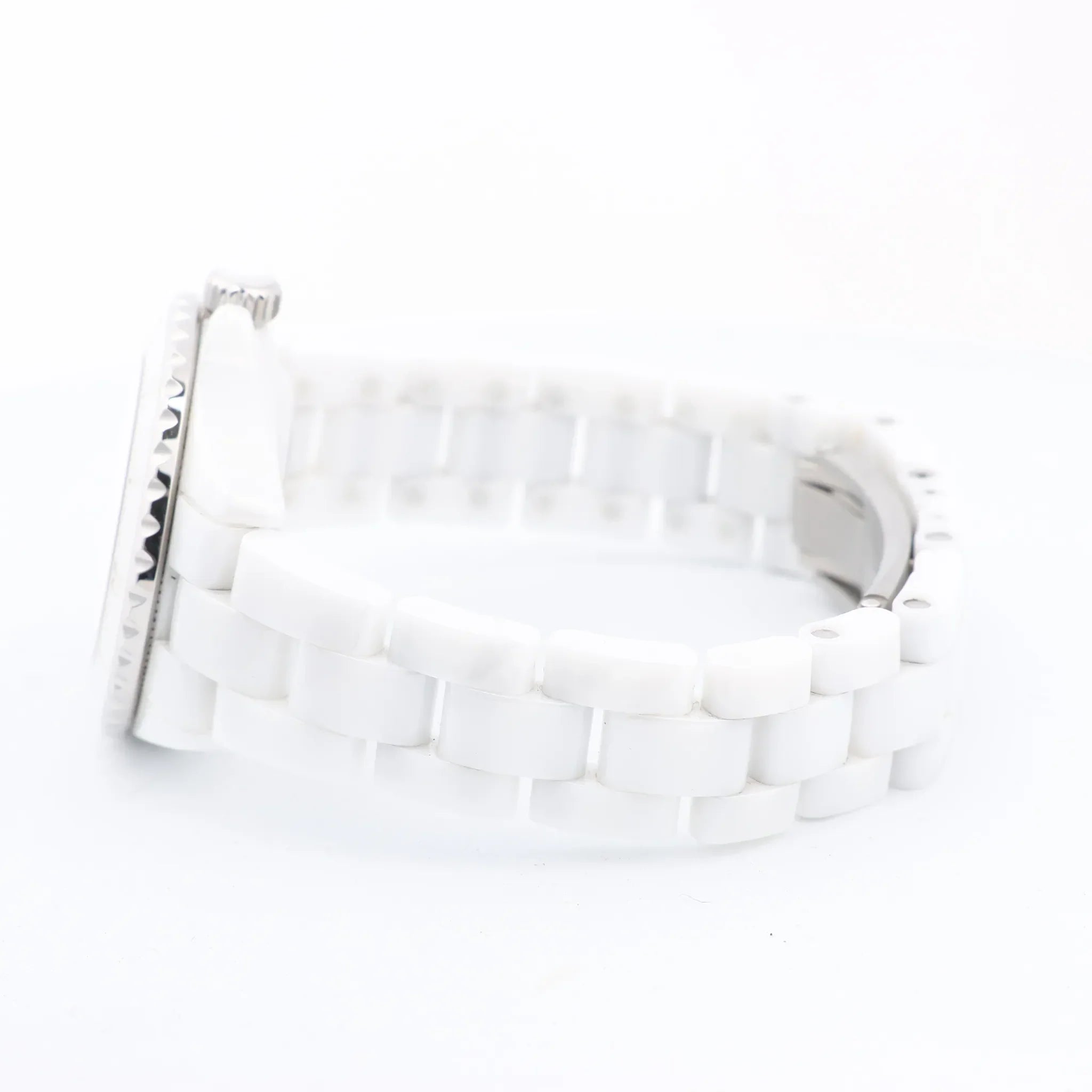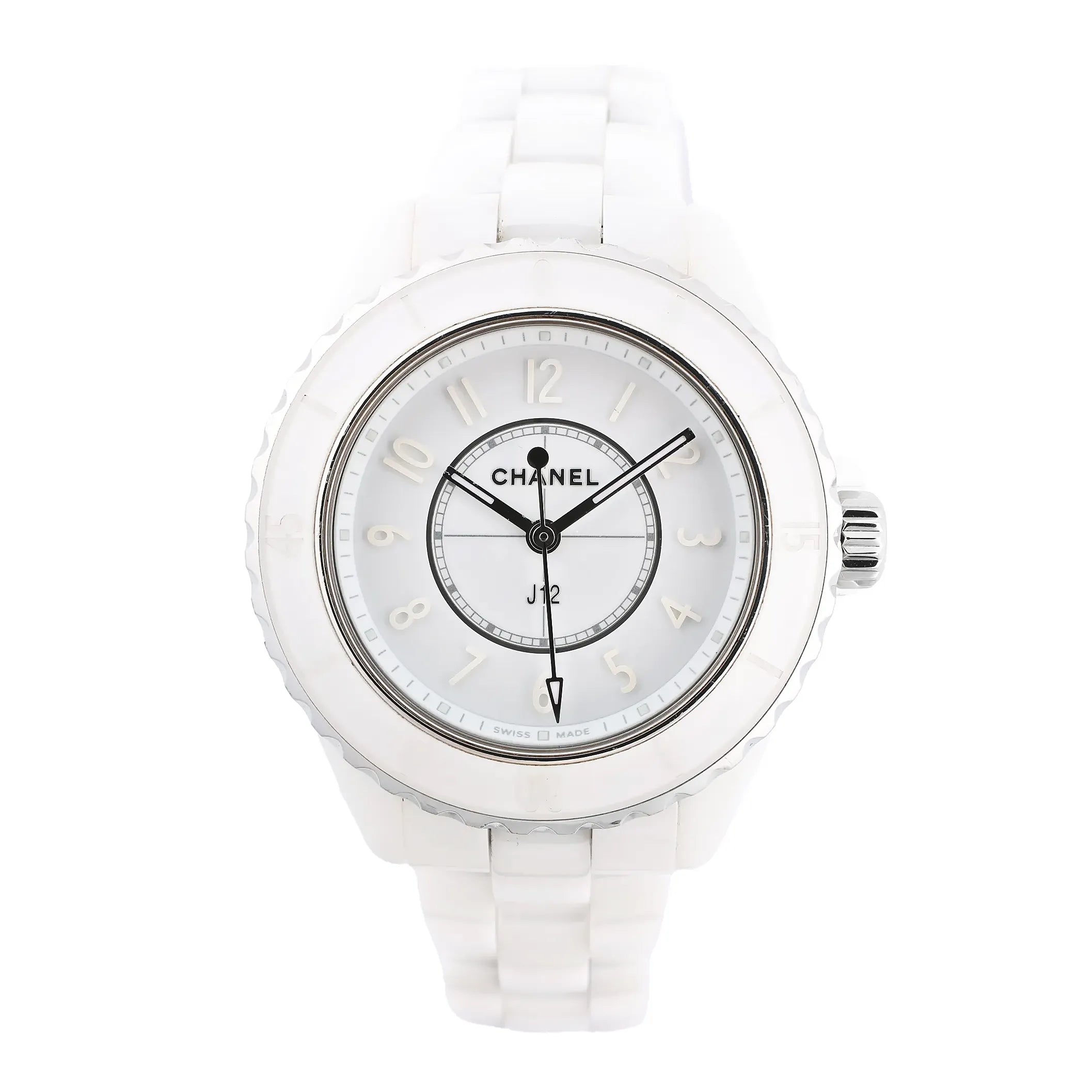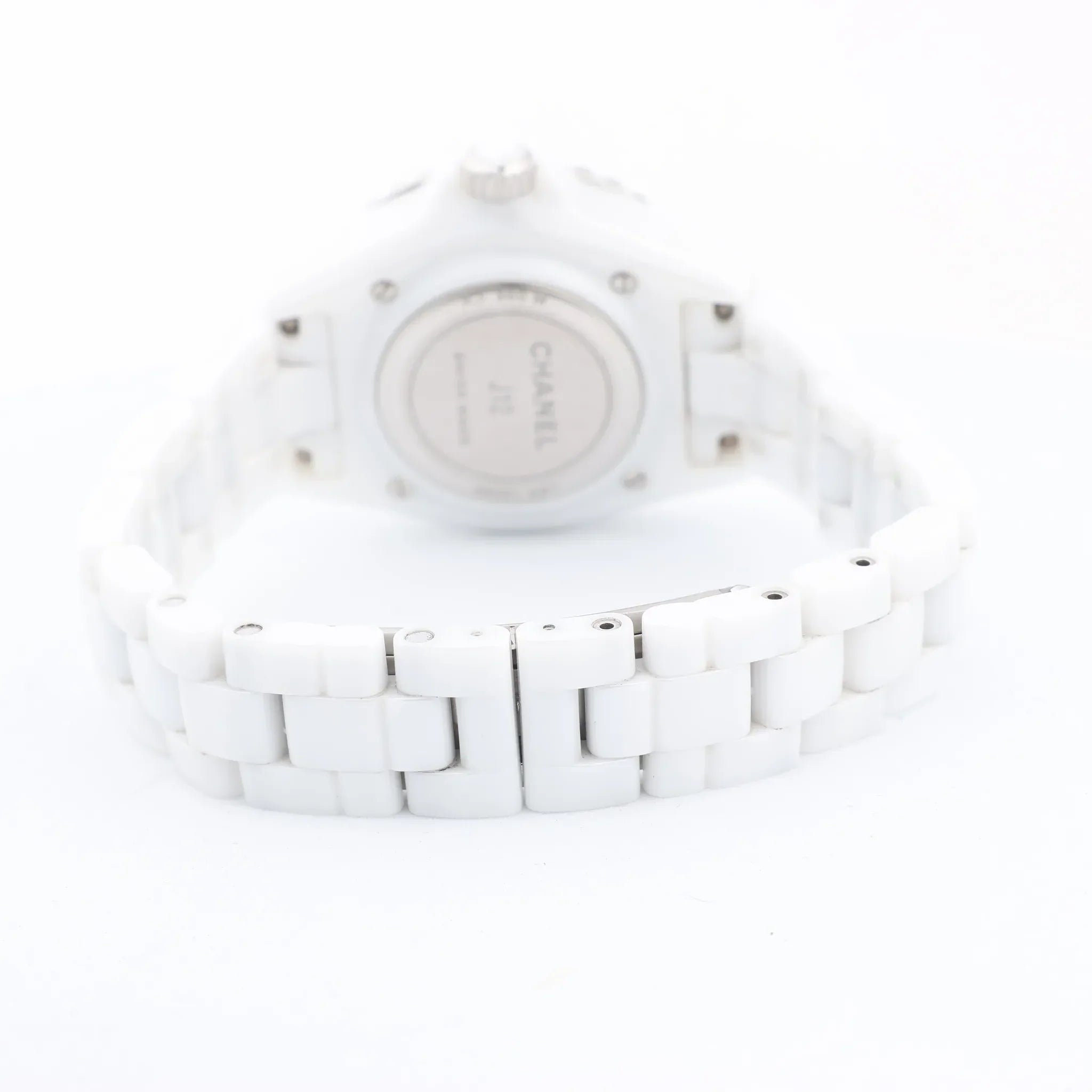 Brand: ChanelModel: J12Reference: H6345Condition: ExcellentCondition Details: Light signs of use, including subtle surface marks barely visible to the eye. Please see photos for the exact condition.Dial Colour: WhiteCase Material: Ceramic, Stainless SteelStarp Colour: WhiteStrap material: CeramicMovement: QuartzFace Diameter: 34 mmApprox. max circumference: 16.5 cmComes With: Box, Certificate, Booklet, Service card