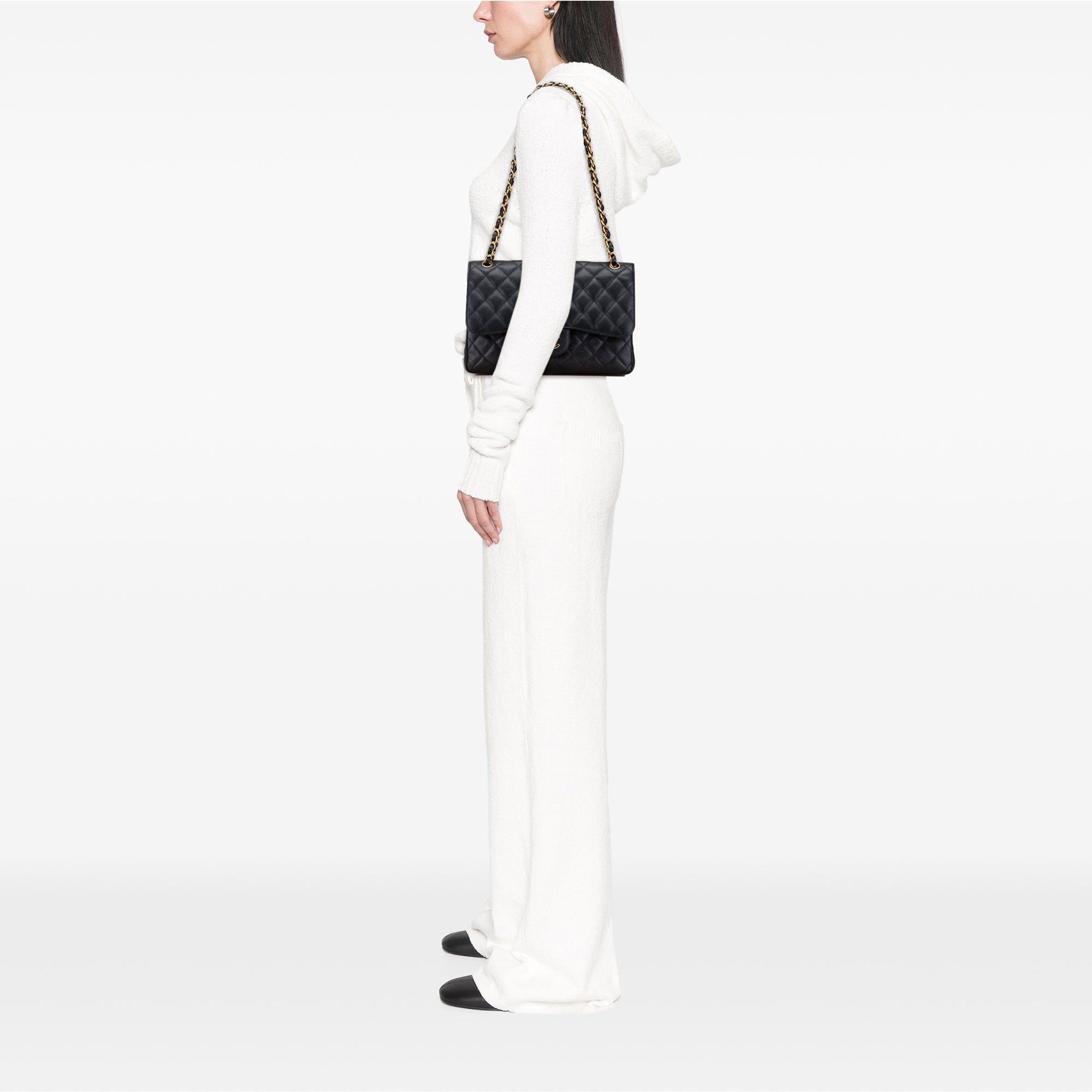 This shoulder bag features a quilted caviar leather body, leather woven chain straps, a double top flap with CC turn-lock closure, an exterior back slip pocket, and interior zip and slip pockets. Retail Price: 10700.00