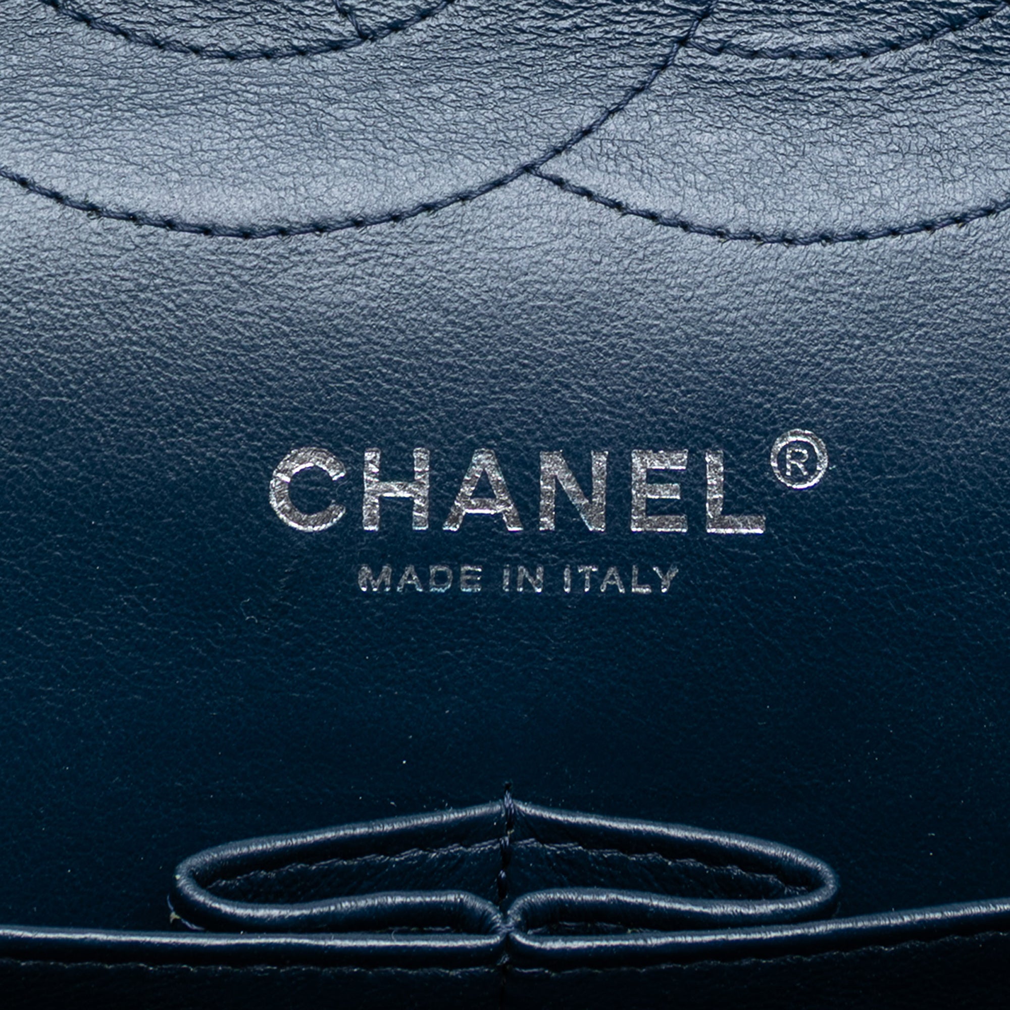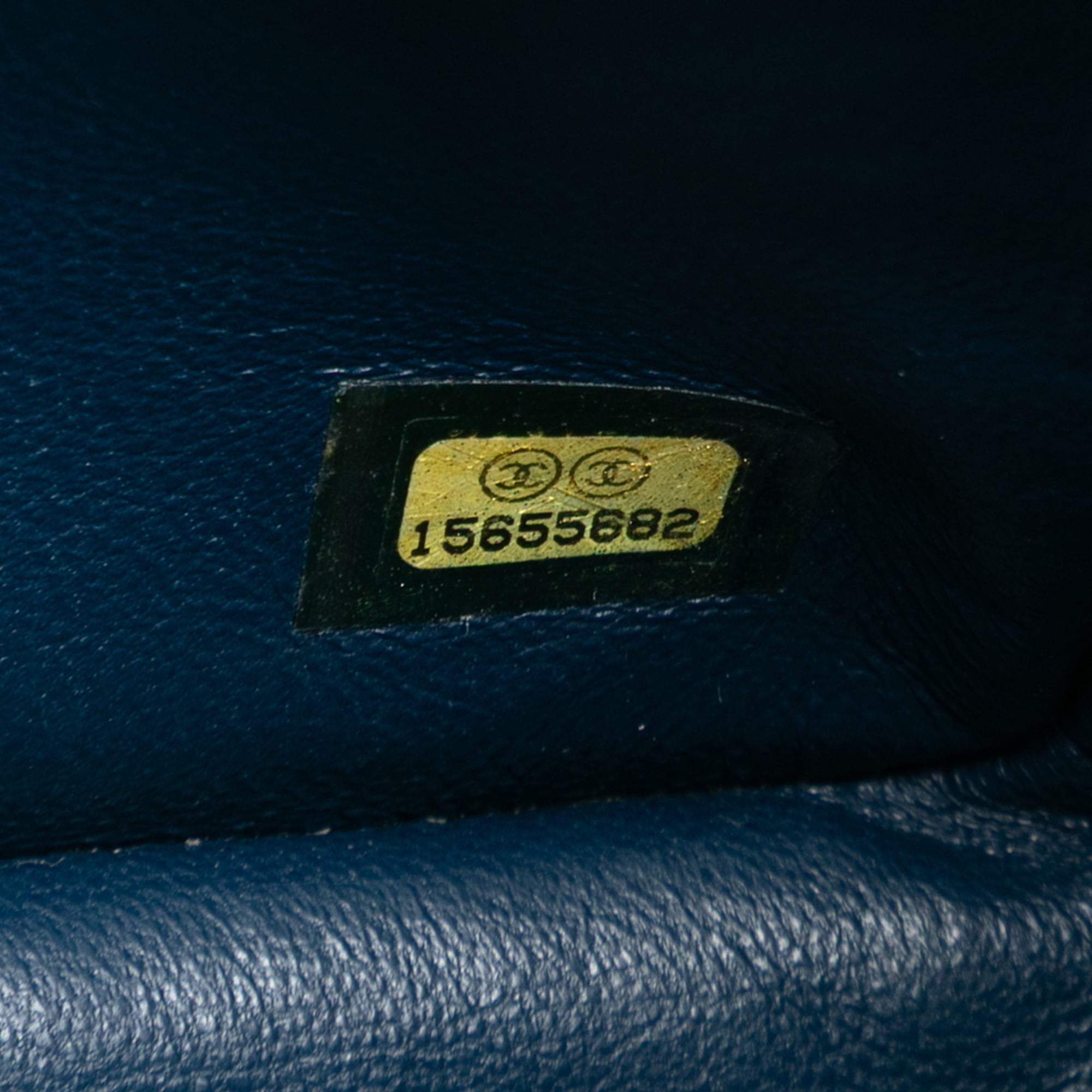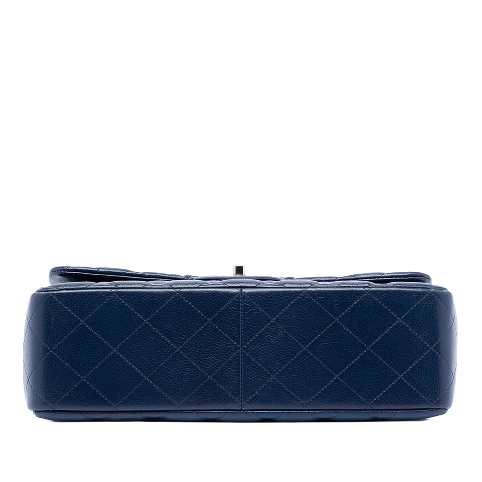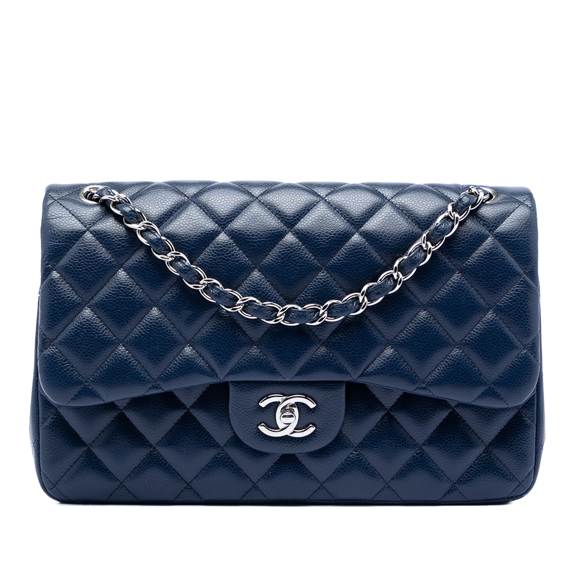 This shoulder bag features a quilted caviar leather body, leather woven chain straps, a double top flap with CC turn-lock closure, an exterior back slip pocket, and interior zip and slip pockets. Retail Price: 10200.00