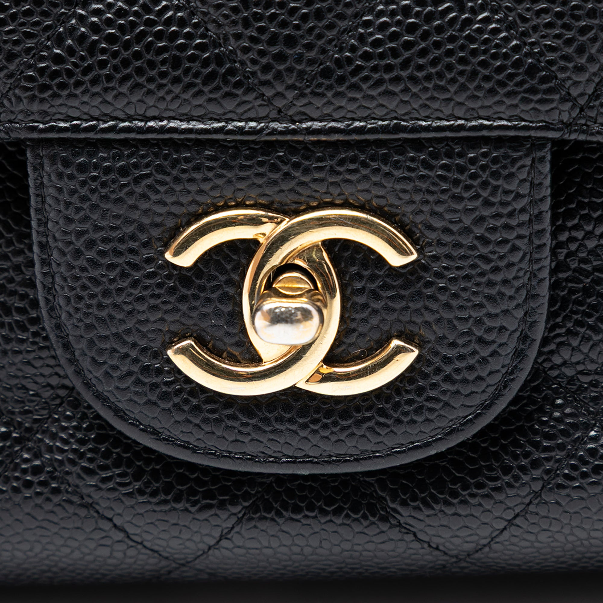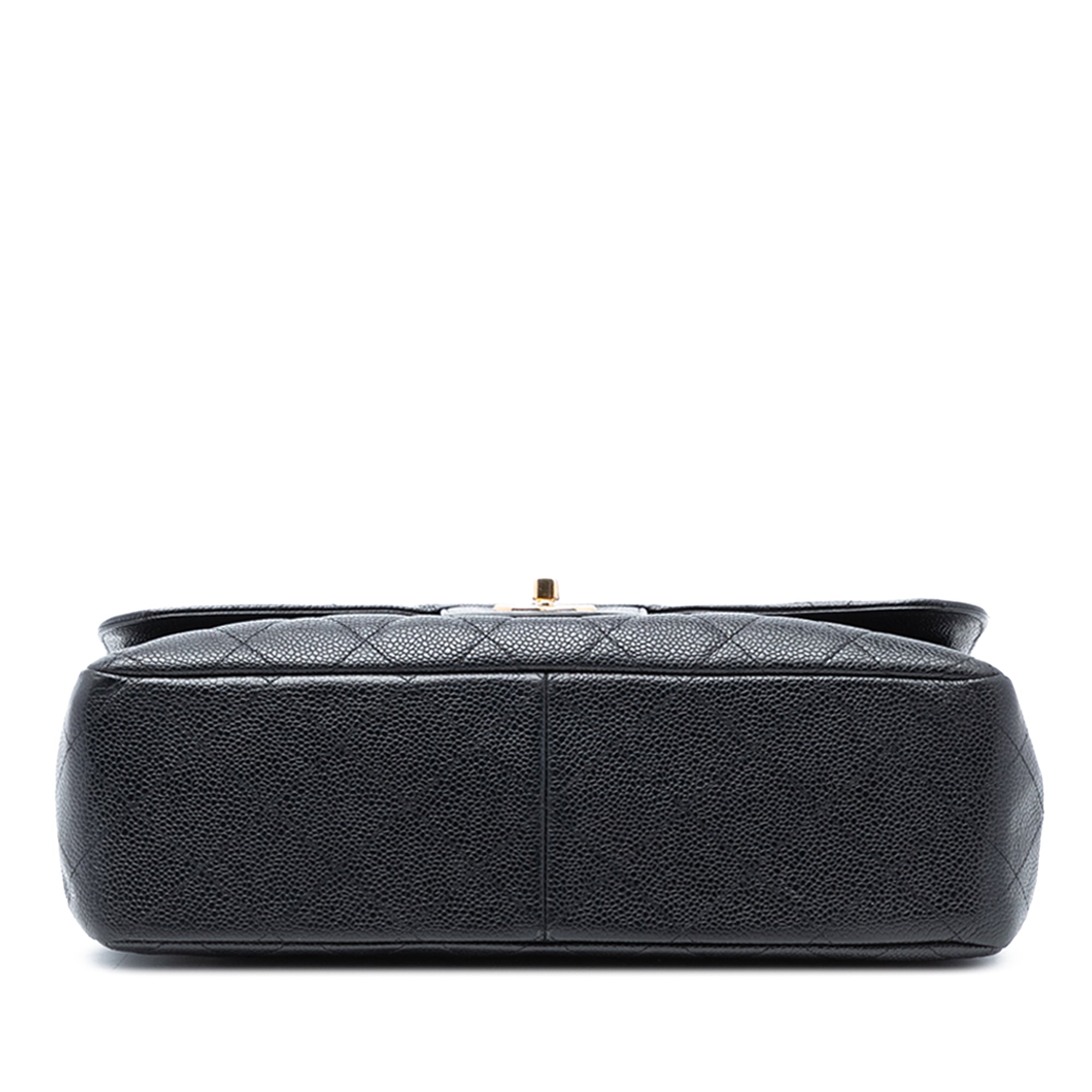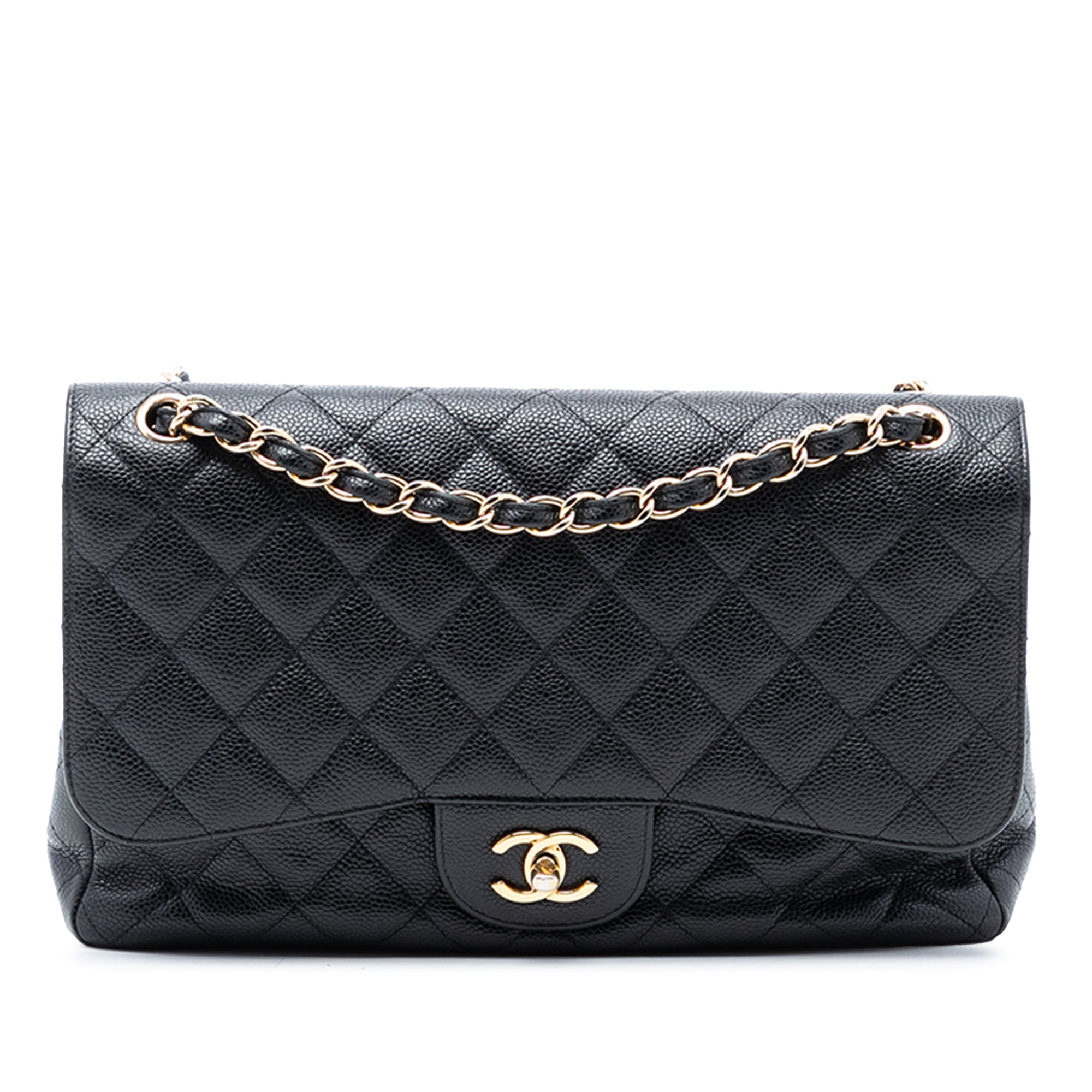 This shoulder bag features a quilted caviar leather body, leather woven chain straps, a double top flap with CC turn-lock closure, an exterior back slip pocket, and interior zip and slip pockets. Retail Price: 10700.00