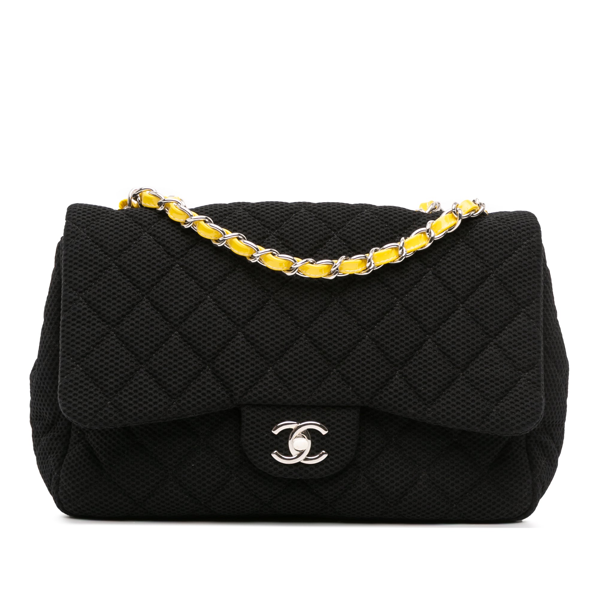 This flap features a quilted jersey body, woven chain shoulder straps, a front flap with CC turn-lock closure, an exterior back slip pocket, and interior zip and slip pockets. Inclusion: authenticity card. Retail Price: 6000.00