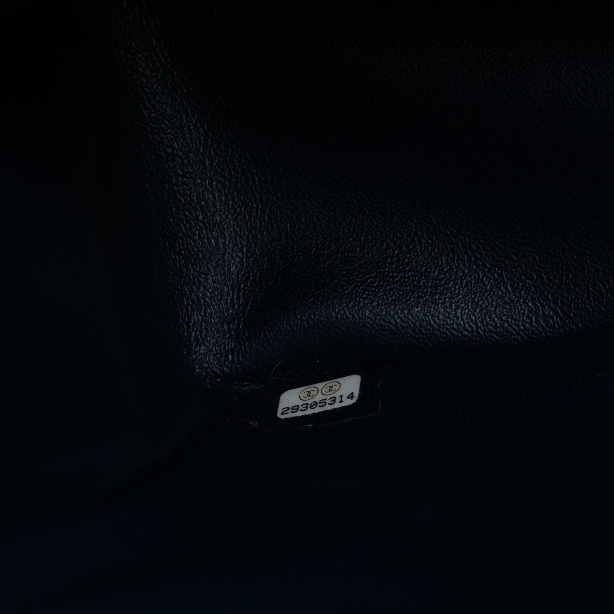 This shoulder bag features a quilted lambskin leather body, an exterior back slip pocket, leather-woven chain straps, double front flaps with CC turnlock closure, and interior slip pockets. Retail Price: 11700.00
