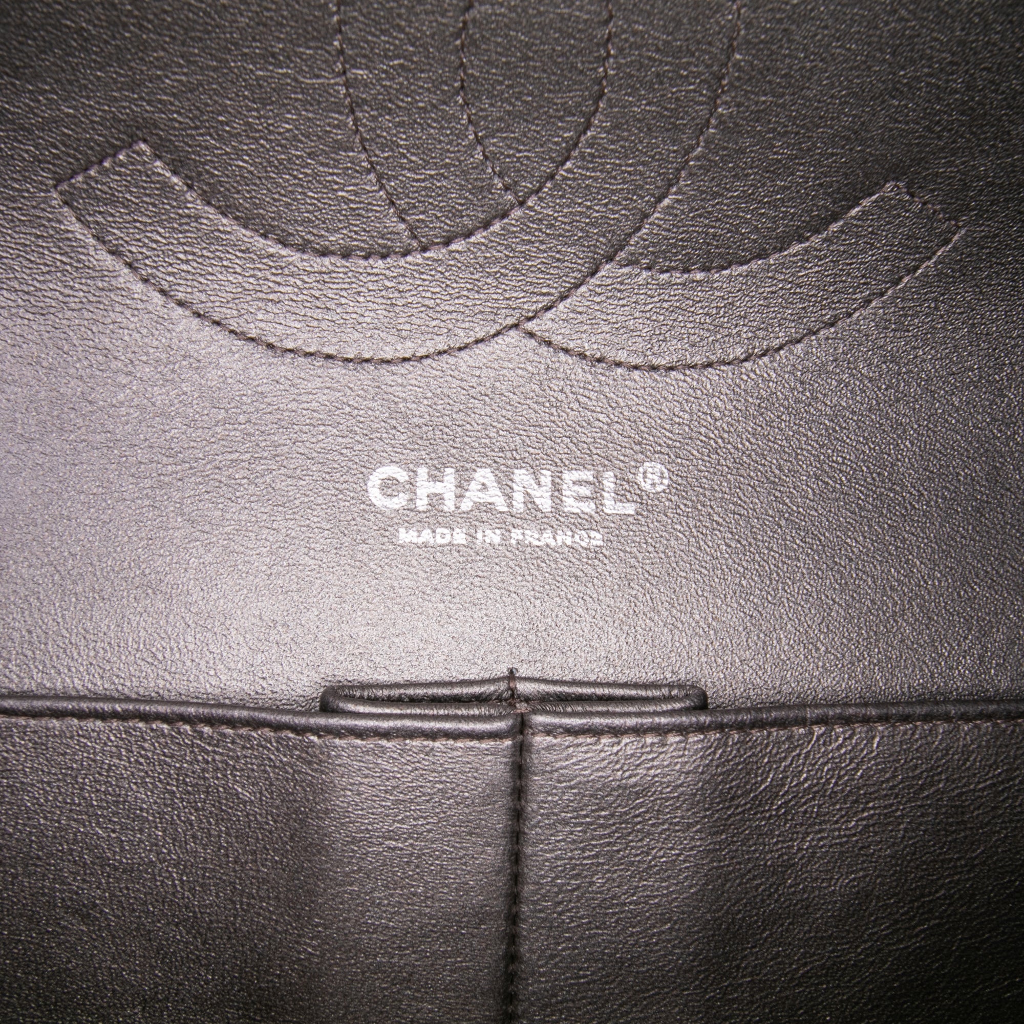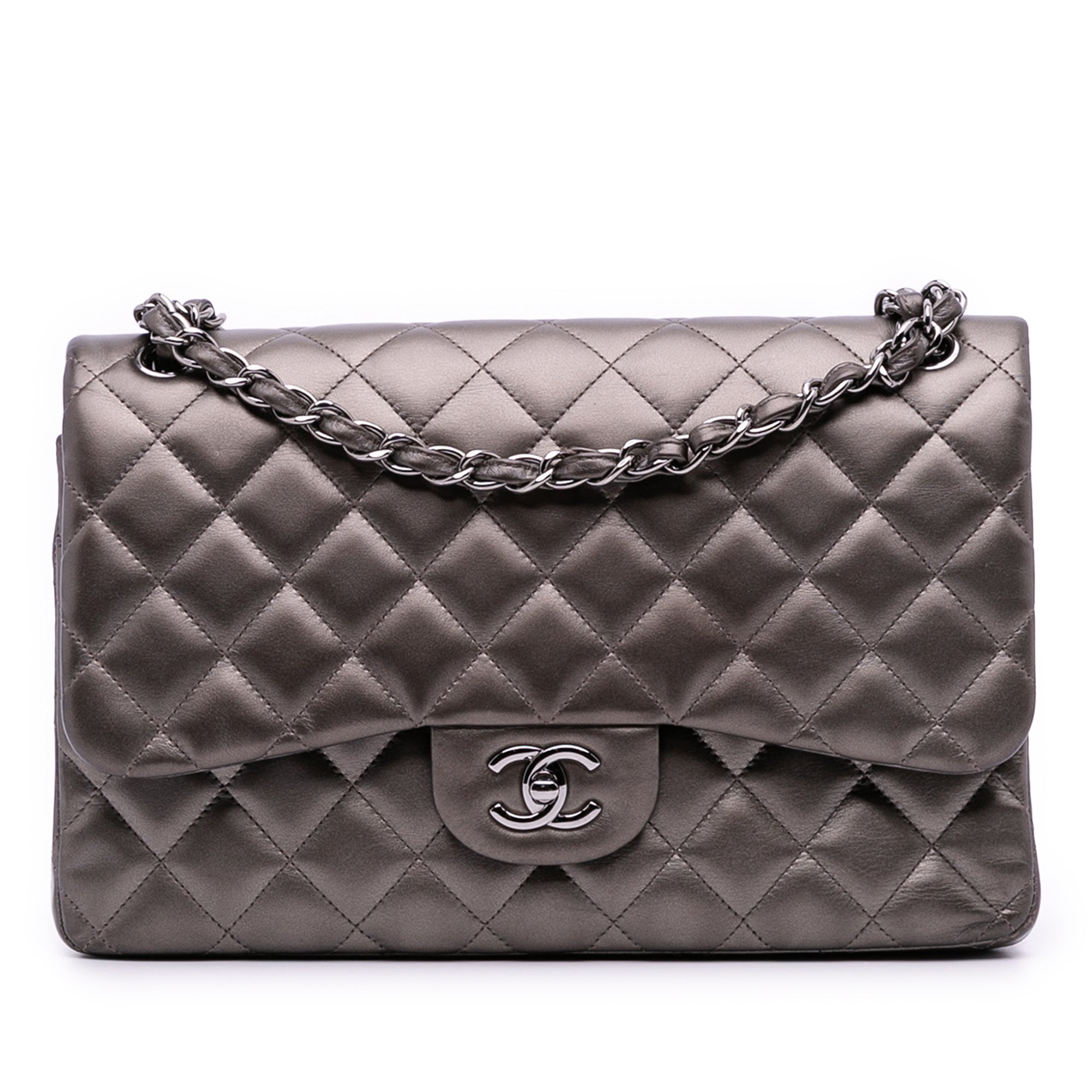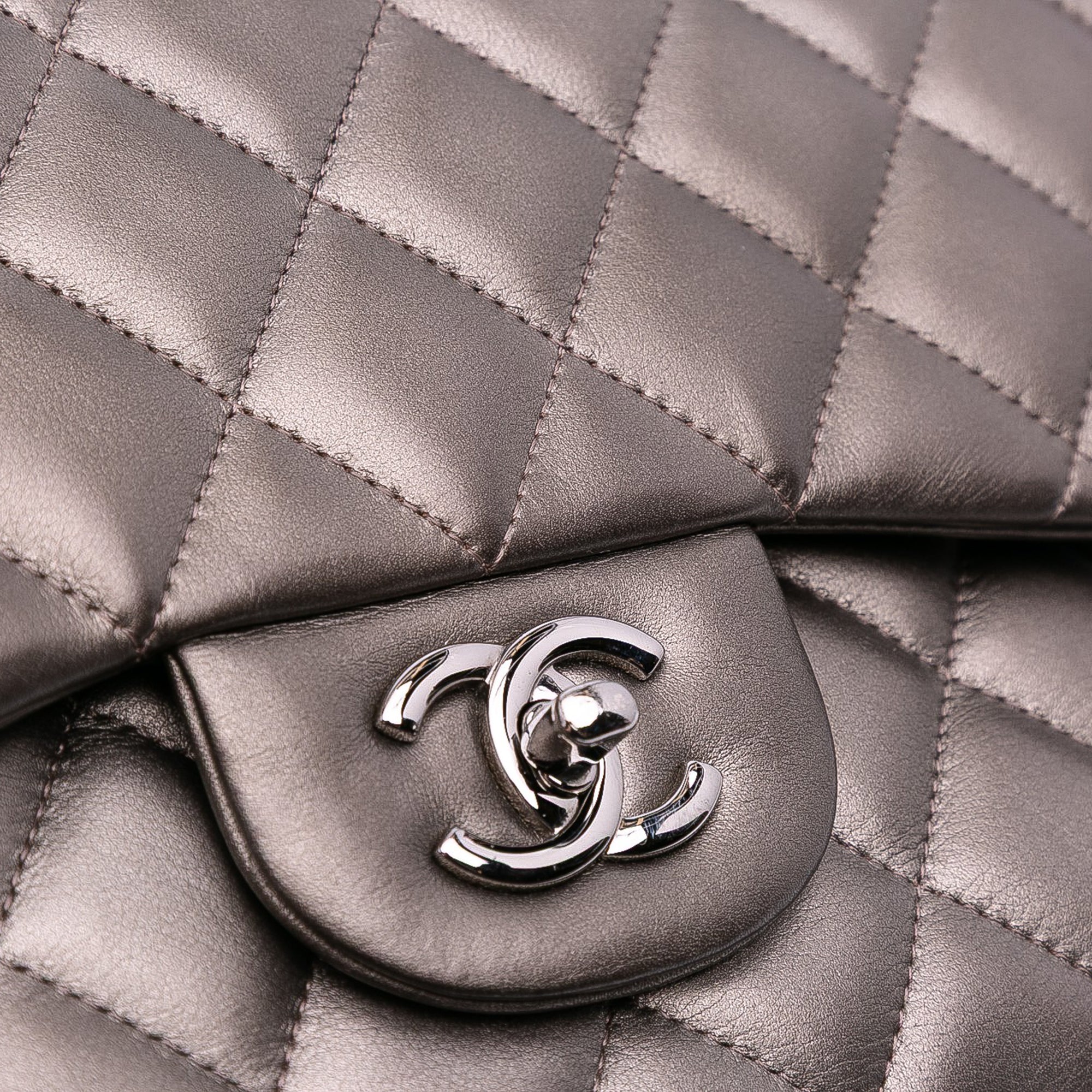 This shoulder bag features a quilted lambskin leather body, leather-woven chain straps, double front flaps with CC turn-lock closure, an exterior back slip pocket, and interior zip and slip pockets. Retail Price: 11216.00