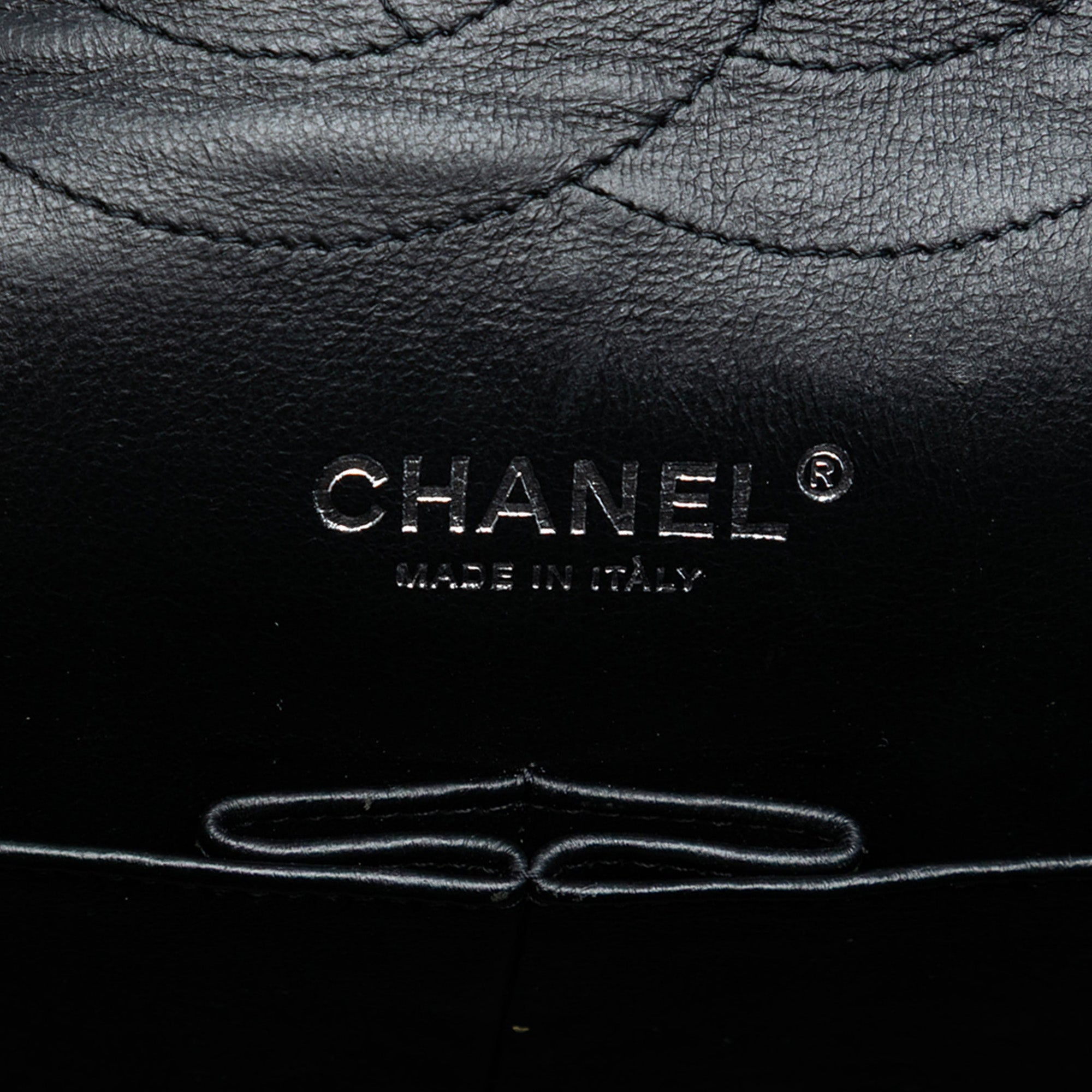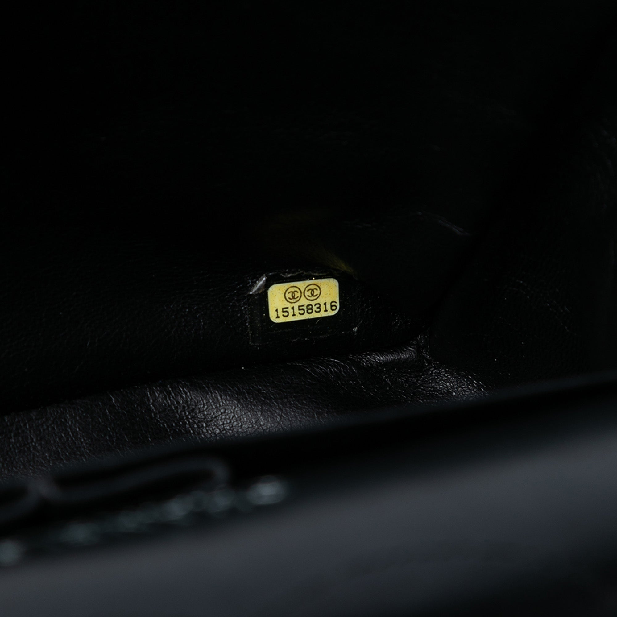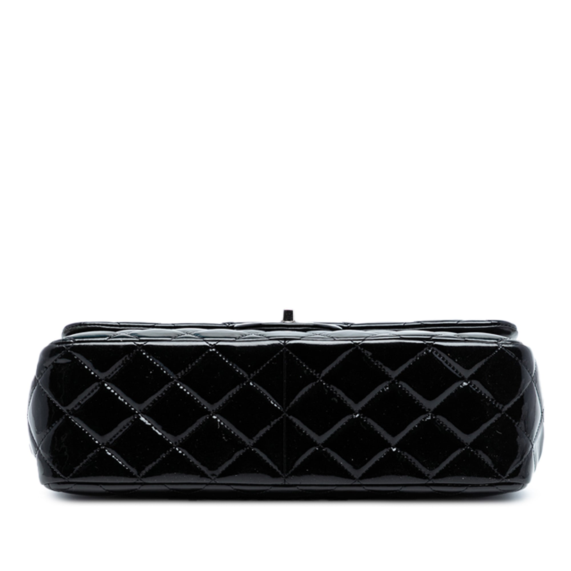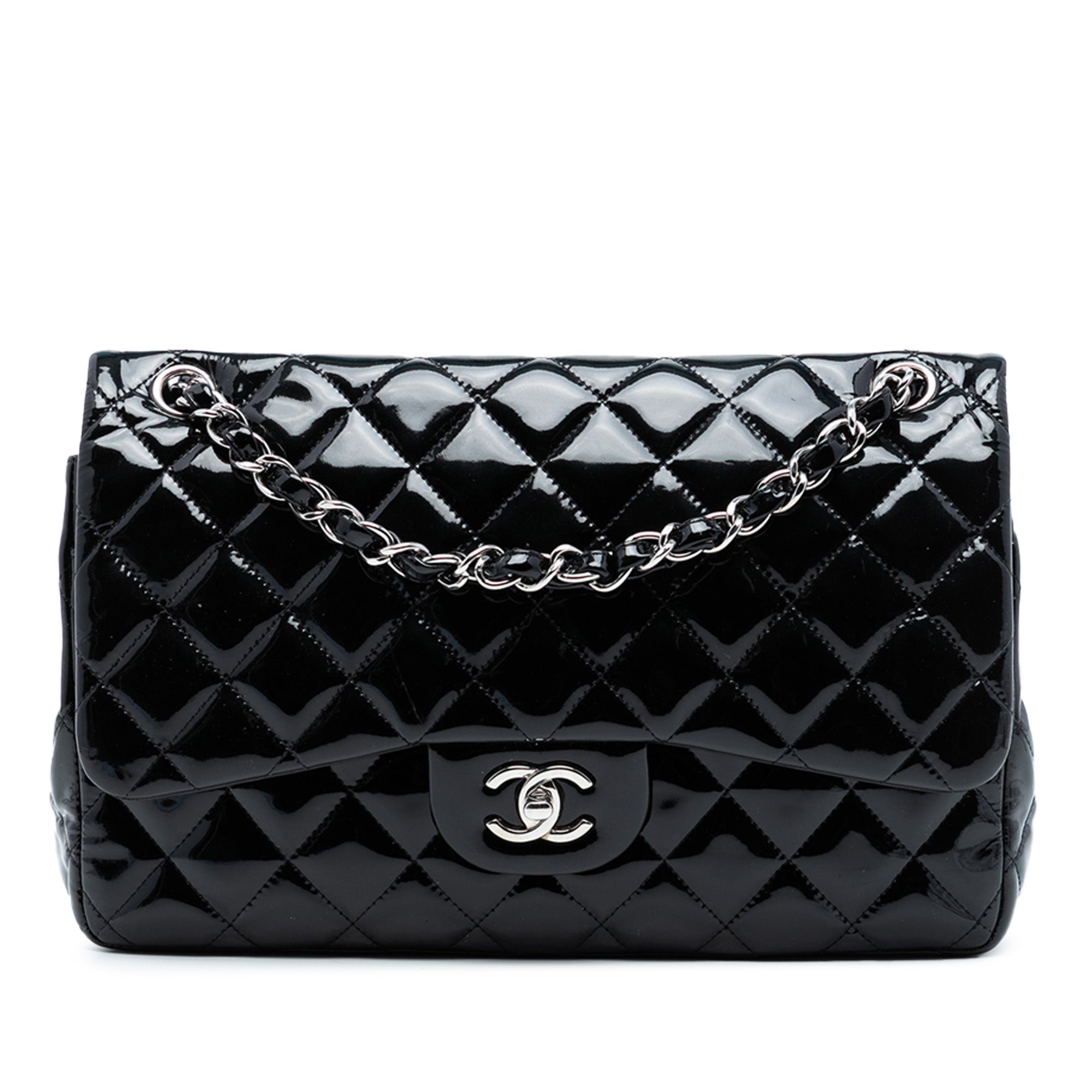 The Classic Medium features a quilted patent leather body, a silver-tone leather woven chain link straps, double front flaps with interlocking Cs and a twist lock closure, an exterior back slip pocket, and interior zip and slip pockets. Retail Price: 11700.00