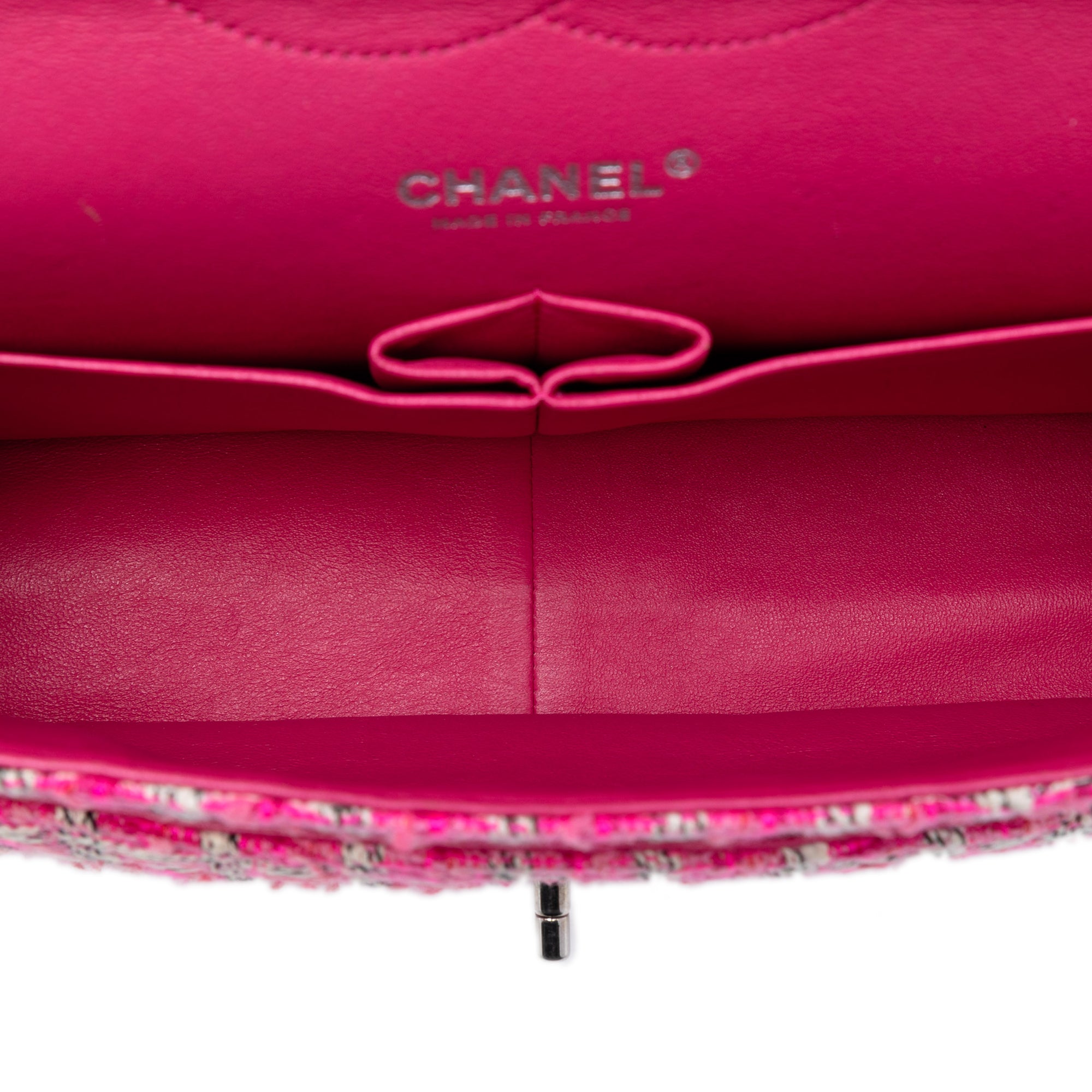 The Jumbo Classic Flap features a quilted tweed body, leather-woven chain straps, double front flaps with interlocking Cs and twist lock closure, an exterior back slip pocket, and interior zip and slip pockets. Retail Price: 6400.00
