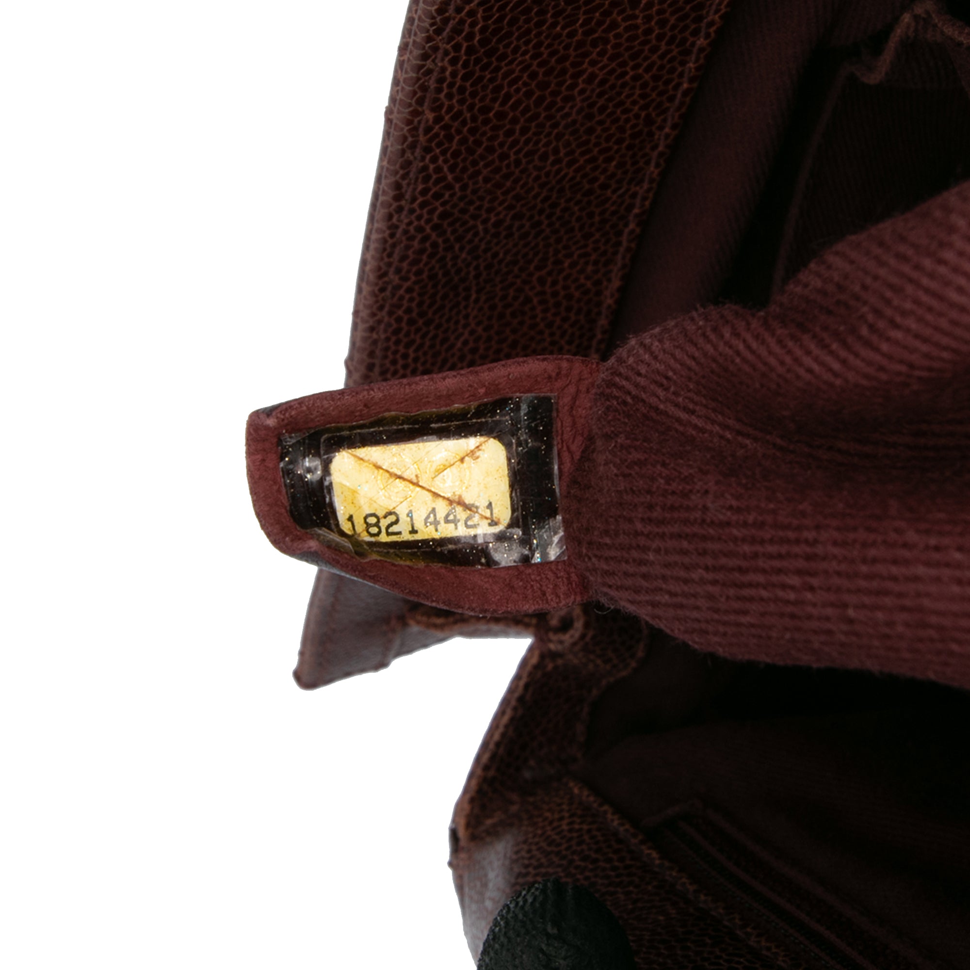 This flap bag features a quilted glazed caviar leather body, a leather-woven chain strap with leather shoulder guard, a front flap with twist lock closure, and interior zip and slip pockets. Retail Price: 3100.00