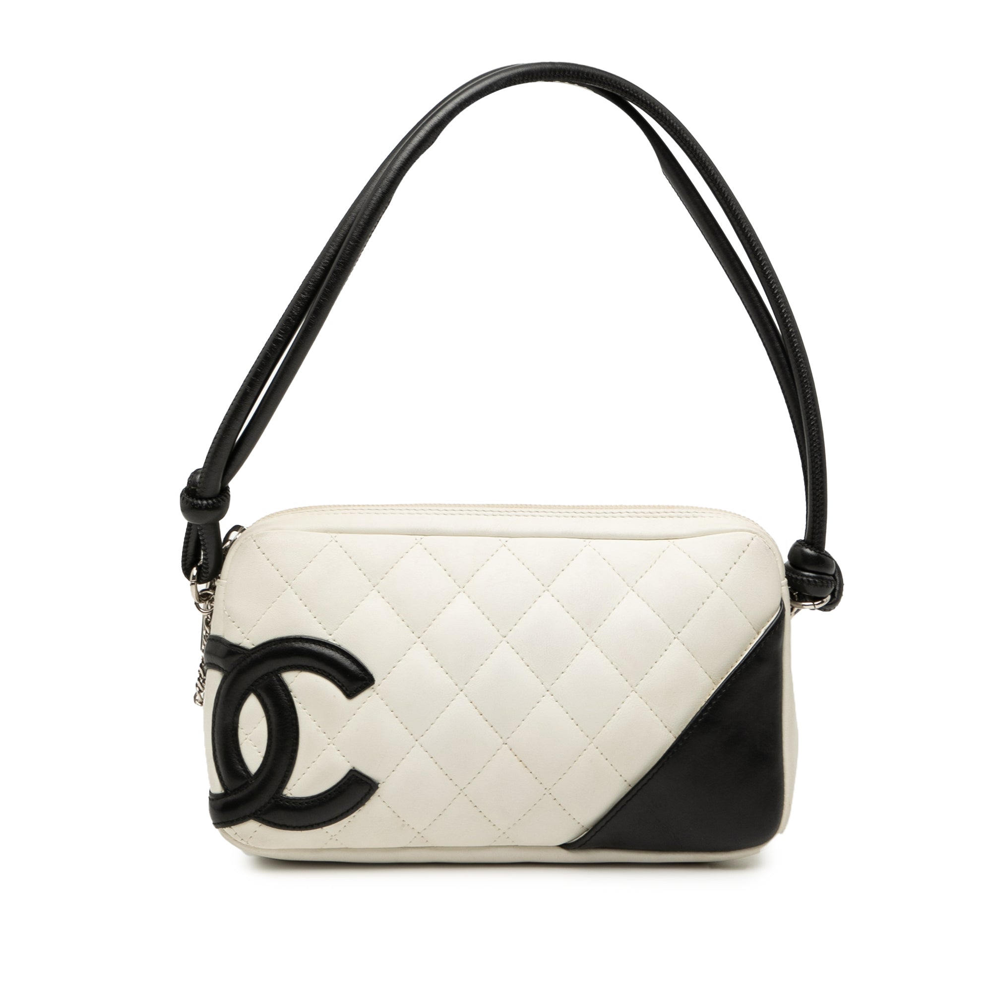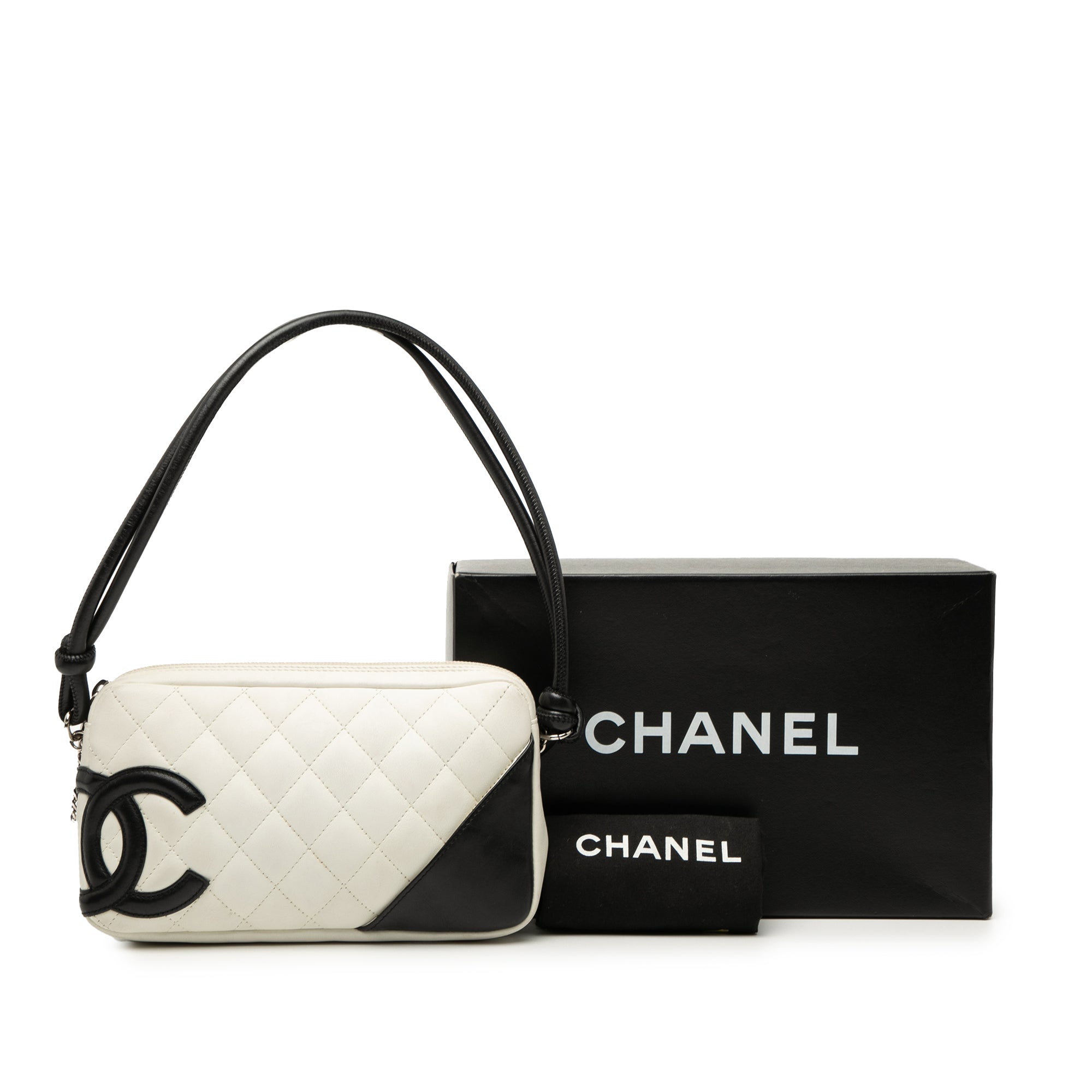 The Cambon Ligne Pochette features a quilted lambskin leather body with interlocking Cs, rolled leather handles, a top zip closure, an exterior back slip pocket, and an interior zip pocket. Inclusion: Dust bag, box. Retail Price: 2750.00