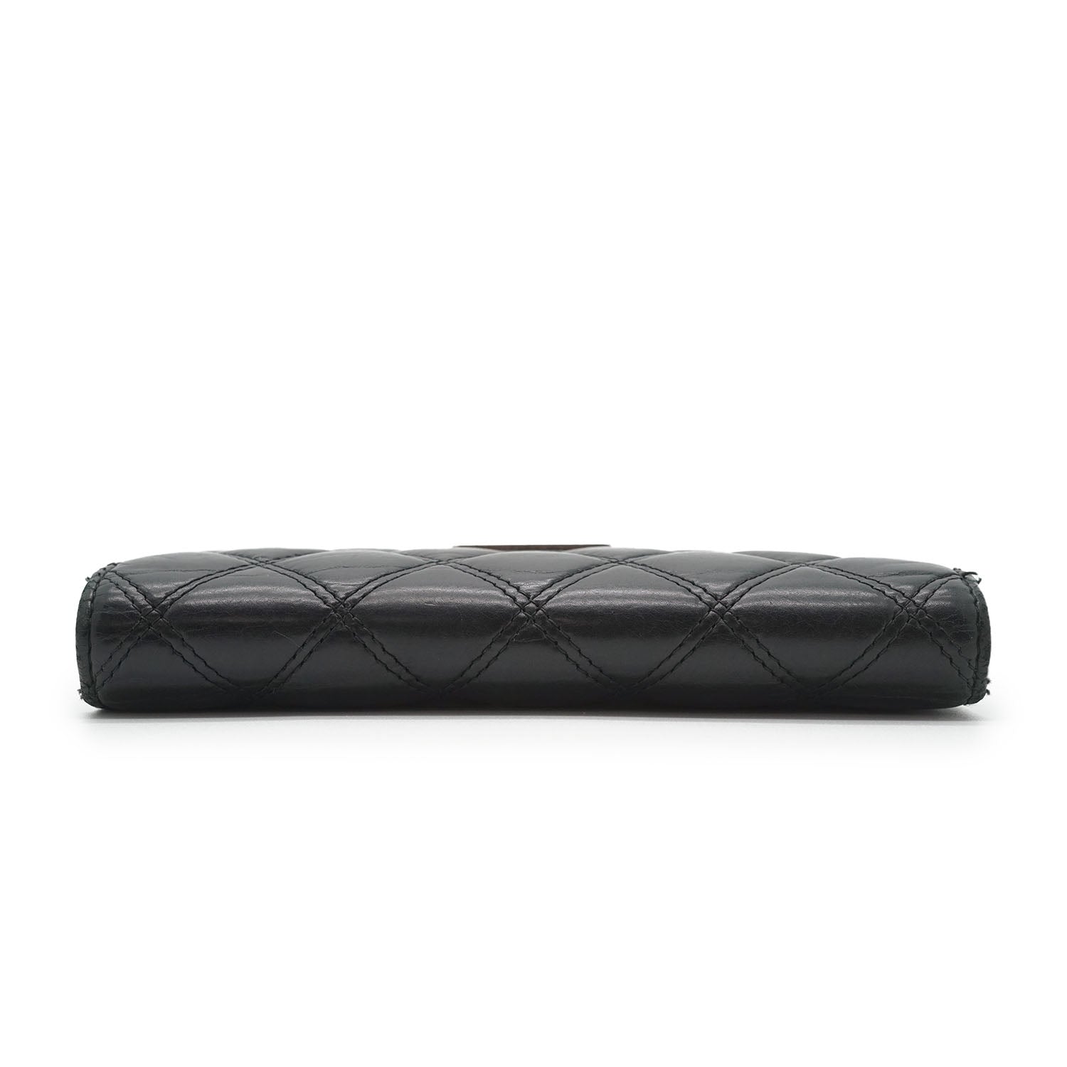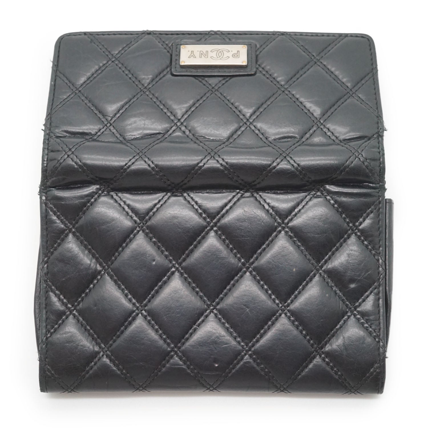 Lambskin Matelasse 2006 Paris NY Bi-fold Wallet Black LeatherDepth: 2cmHeight: 10.5cmWidth: 16cmOutside Rank: BCInside Rank: BDiscoloration: Some tarnish on the front logo plate, slight discoloration throughout the inside fabricScratch: Some scratches overall, corner rubPeeling: Some leather creasing overallWorn: In general, with a few loose stitches all along the edgesOdor: Slight storage smellMissing: The zipper pull of the inside pocket is missing Serial code: 10846785SKU: 7060083