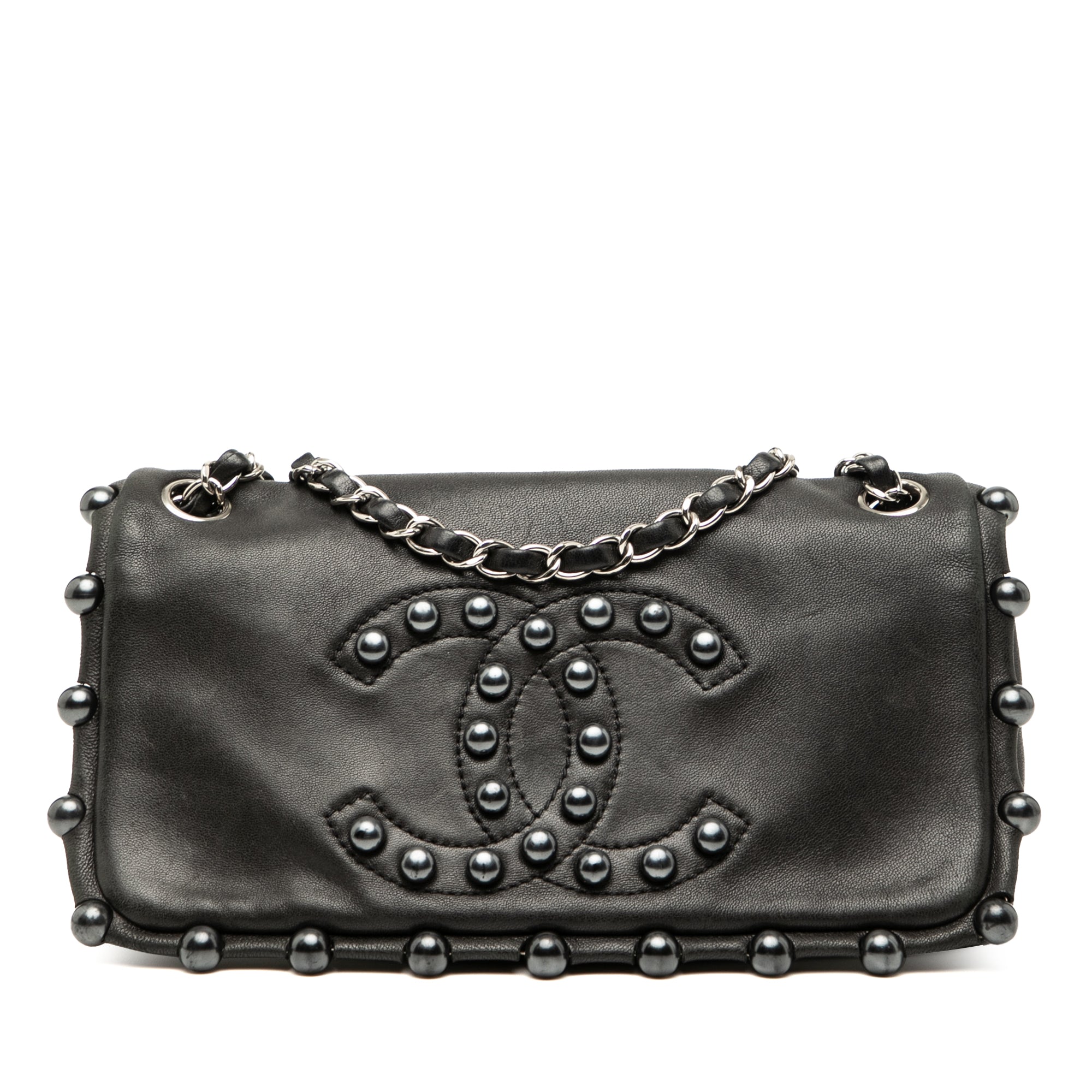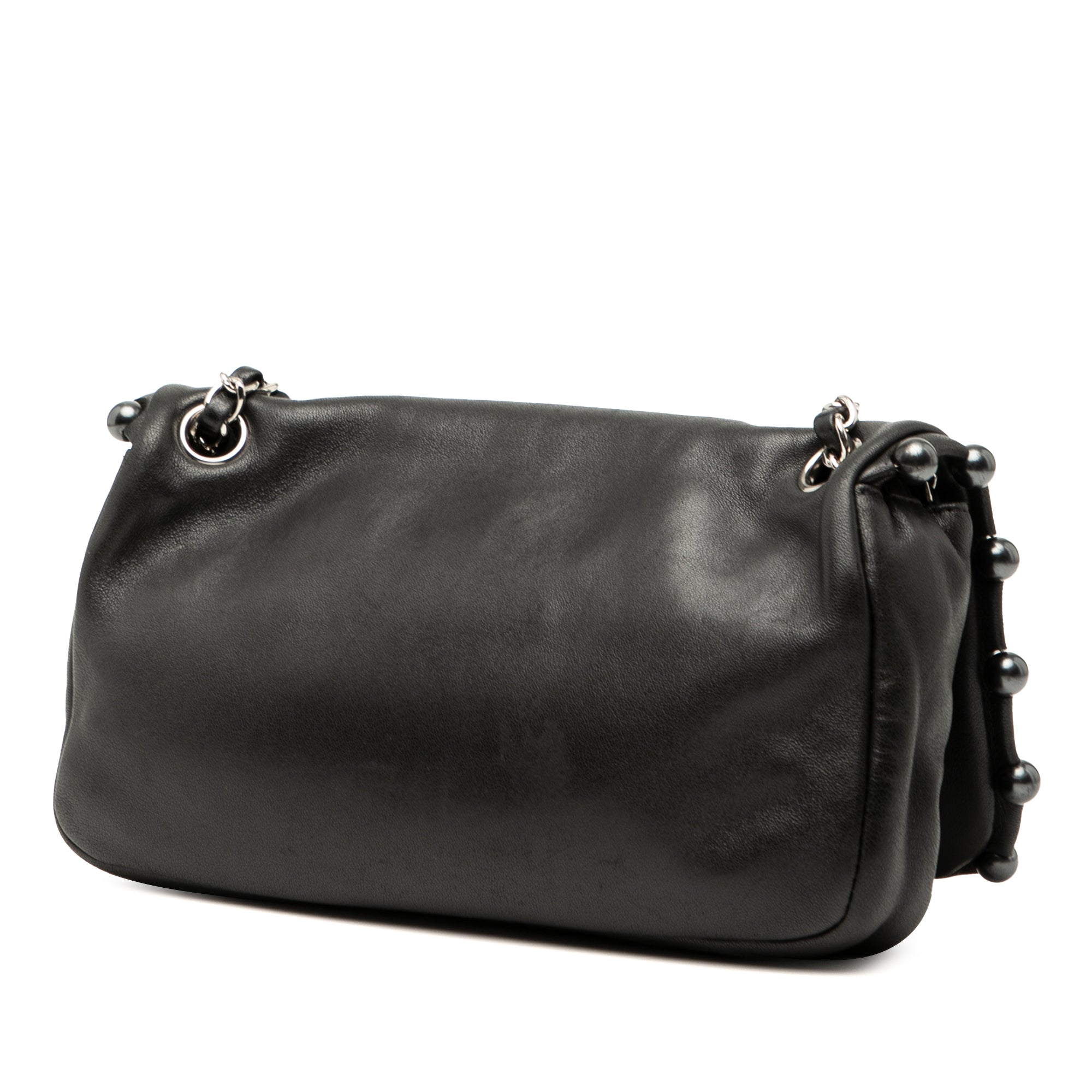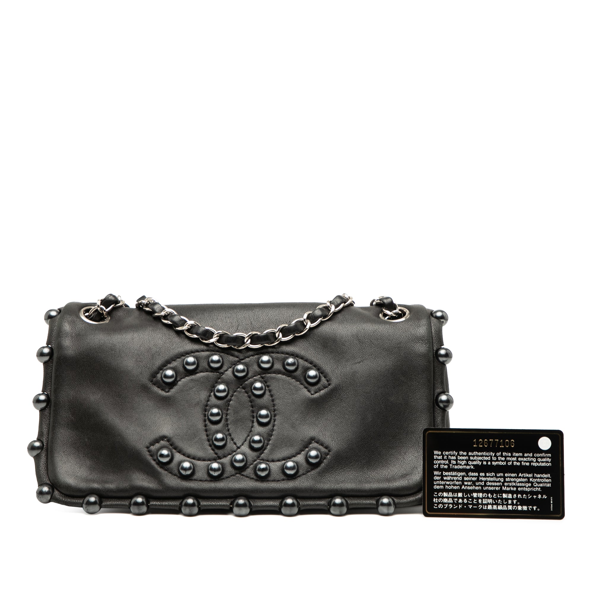 The Pearl Obsession Flap features a lambskin leather body with faux pearl details, a leather woven chain strap, a flap with magnetic snap button closure, and an interior zip pocket. Inclusion: authenticity card. Retail Price: 2875.00