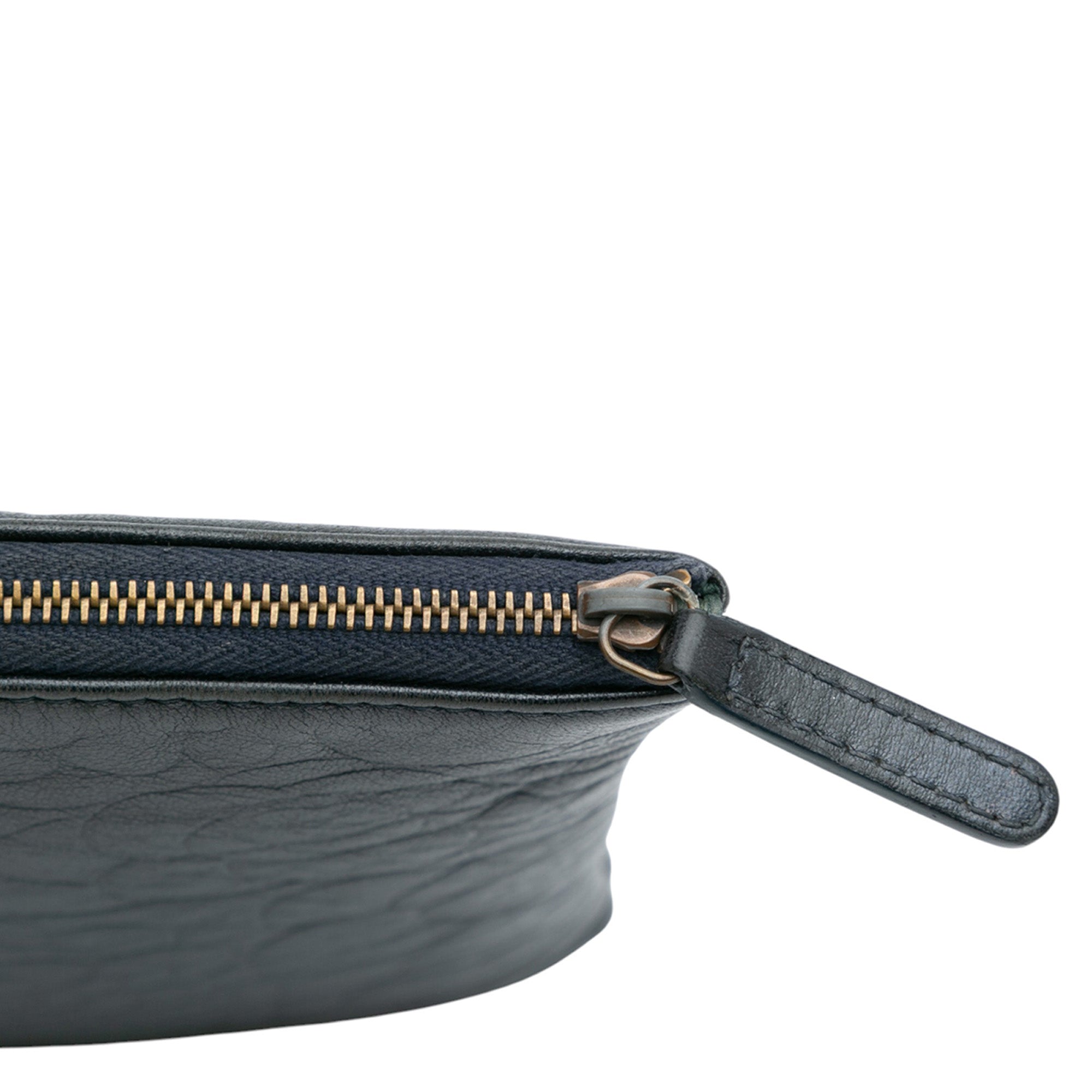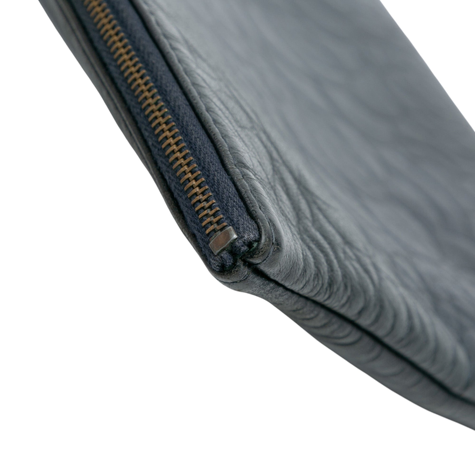 This clutch bag features an embossed lambskin leather body and a top zip closure. Retail Price: 1000.00