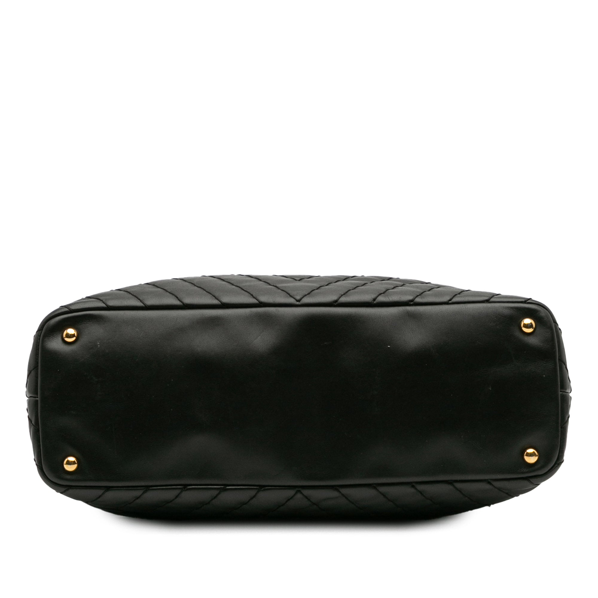This tote bag features a quilted leather body, chain straps with leather guard, an open top, an interior zip compartment, and interior zip and slip pockets. Retail Price: 2900.00